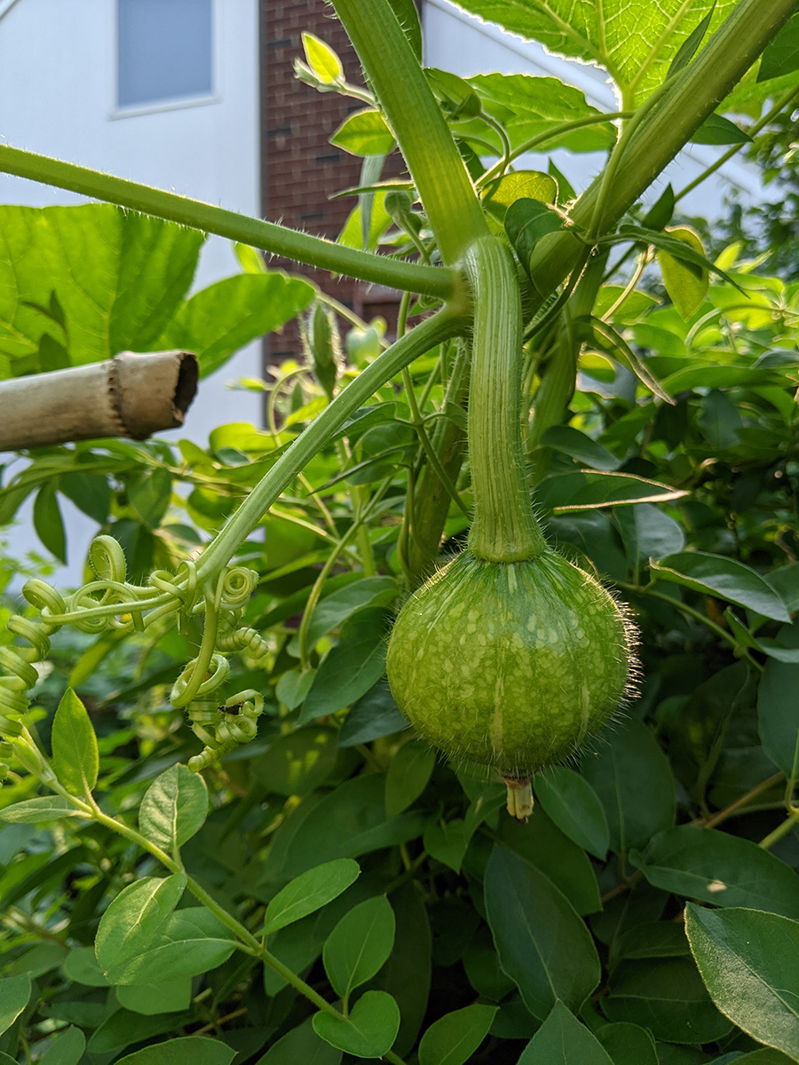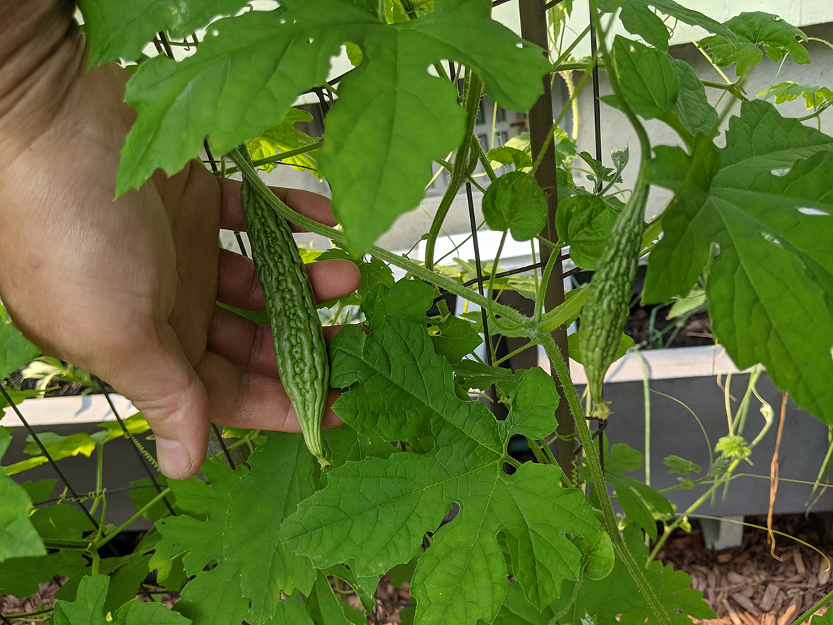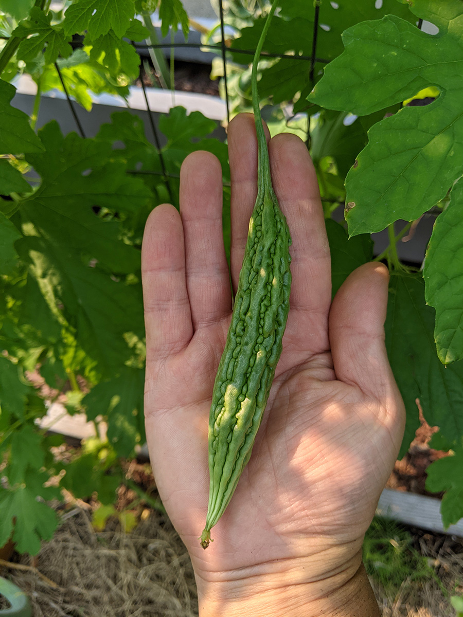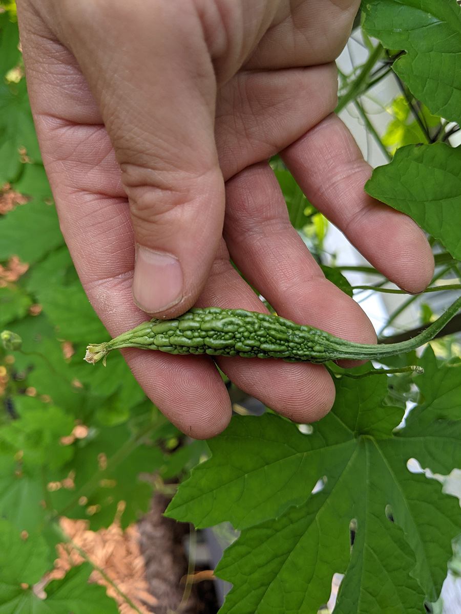 the few bitter melons we have are now growing fast, enough to see daily difference. brushing up against the leaves walking behind the trellis releases an acrid smell distinctive of bitter melons.