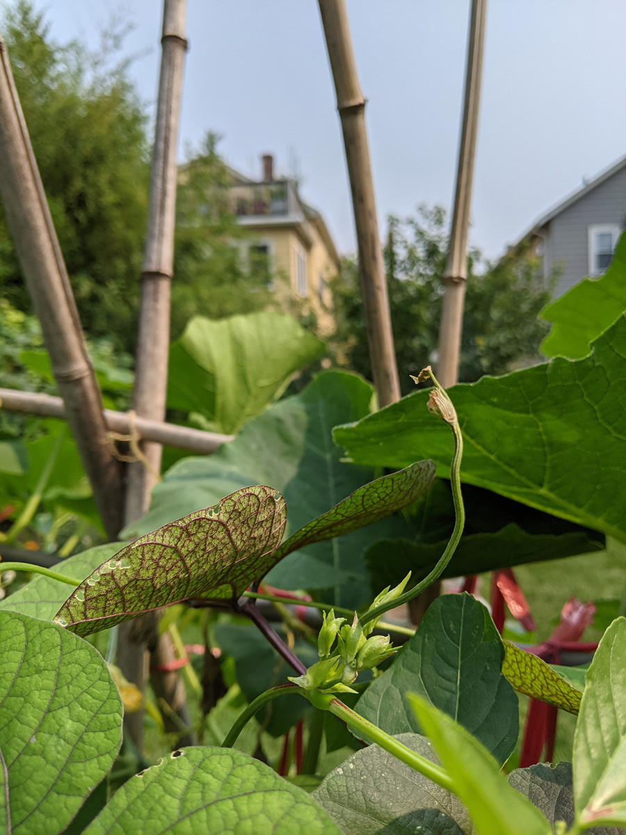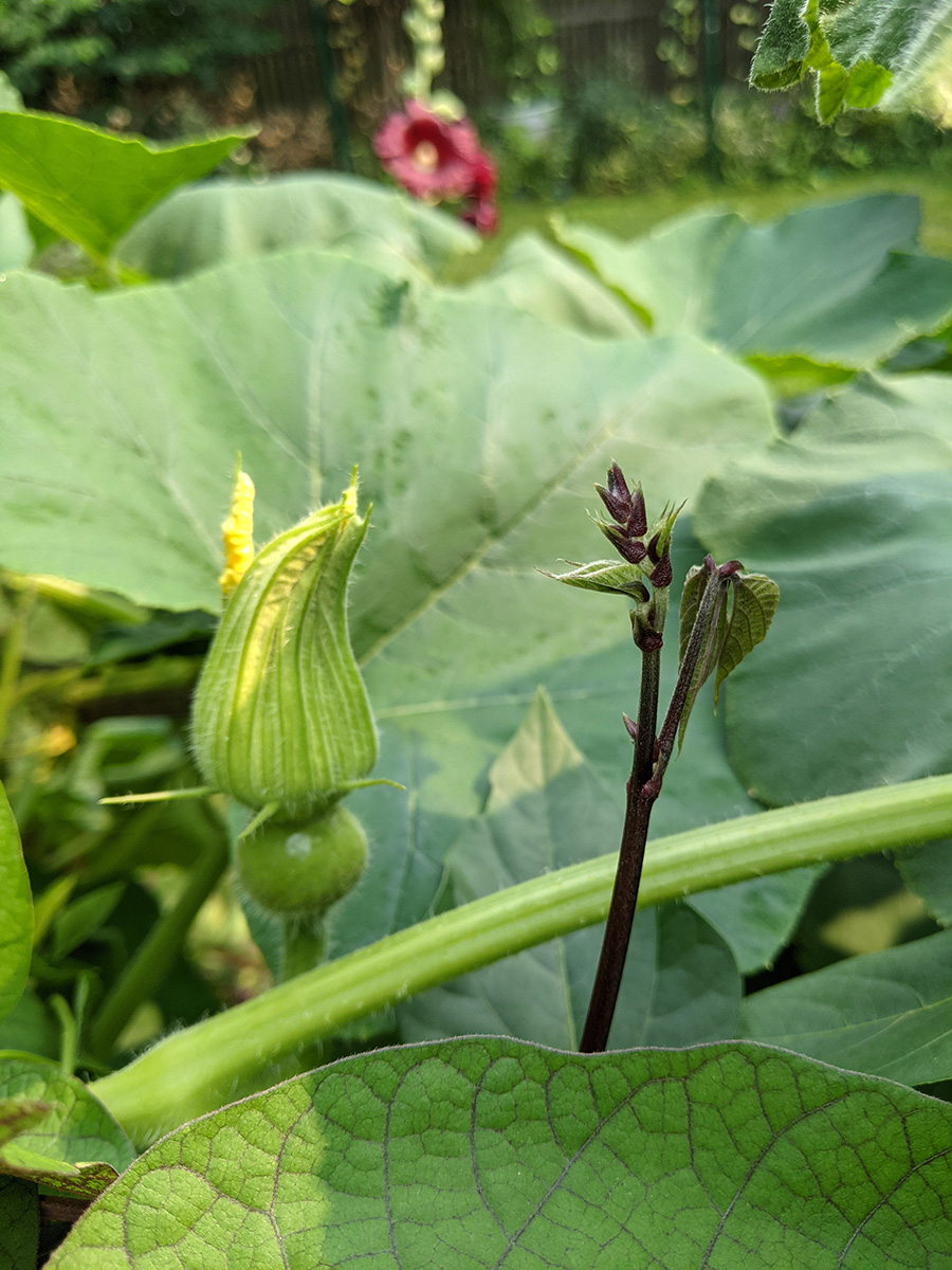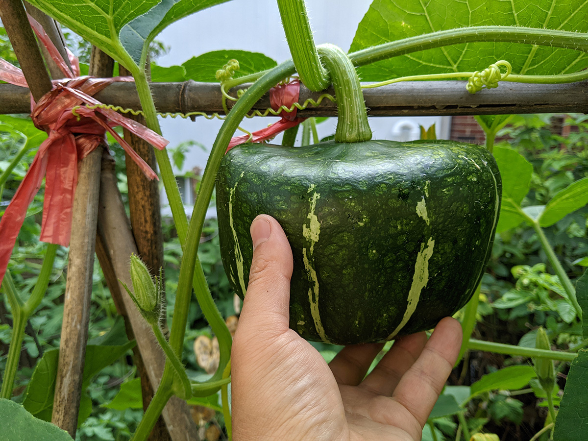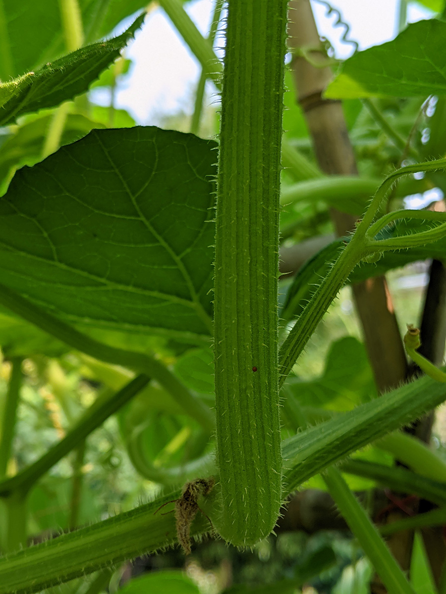 the few bitter melons we have are now growing fast, enough to see daily difference. brushing up against the leaves walking behind the trellis releases an acrid smell distinctive of bitter melons.