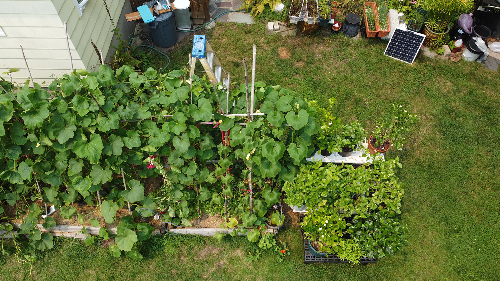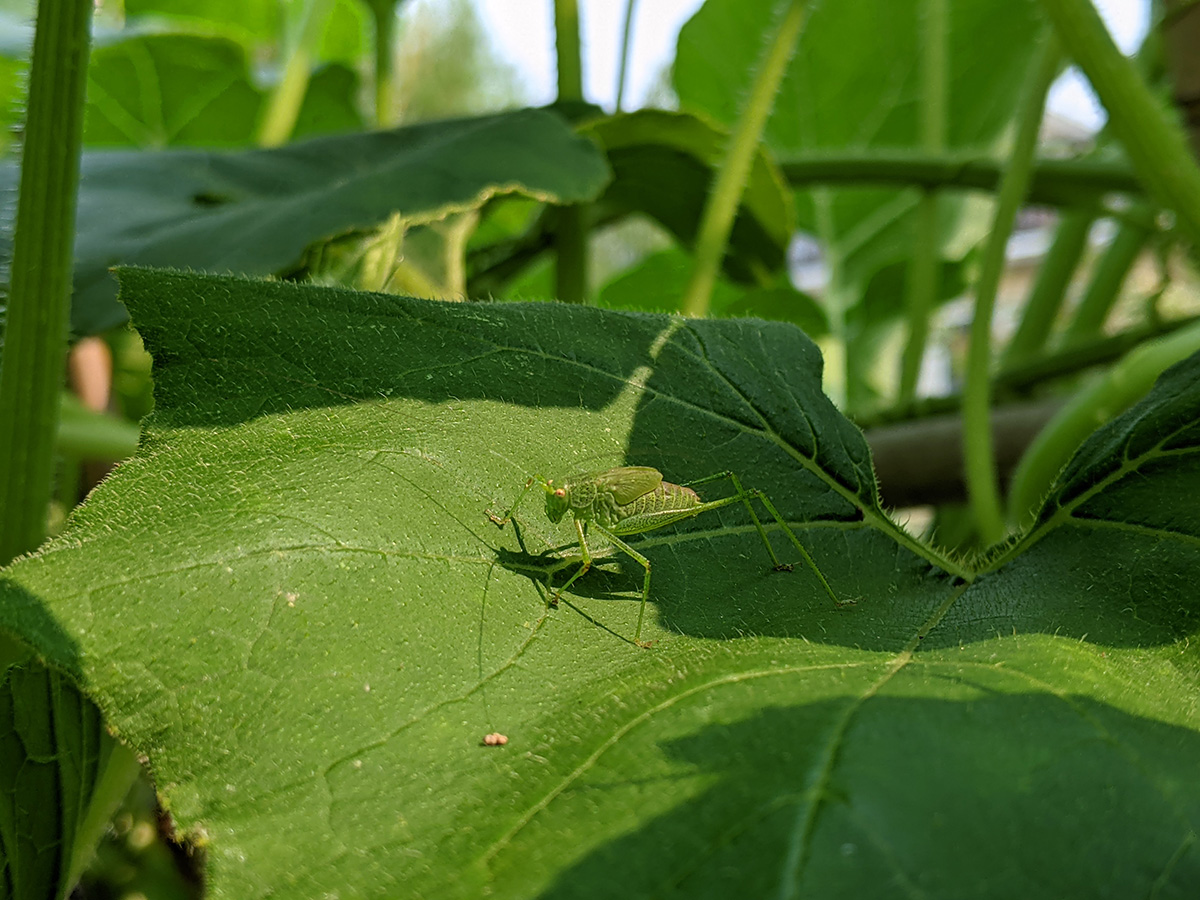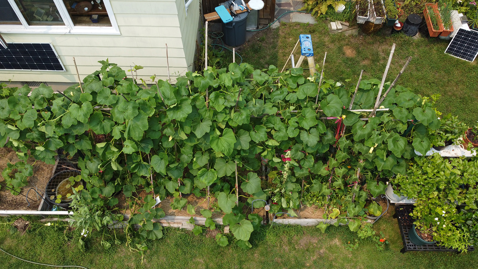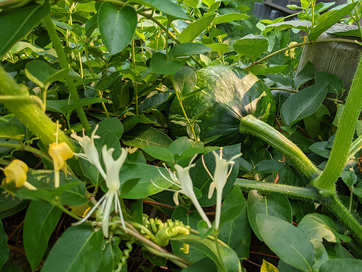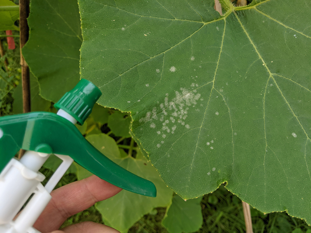 the large squash growing in the outside yard and setting fruits on top of the honeysuckles, i decided to inject some BTk into the base stem because i saw a sign of possible vine borer intrusion. the other squash growing in the western bed started showing some powdery mildew on one of its leaves; i sprayed it with neem oil, which helps to control the mildew.