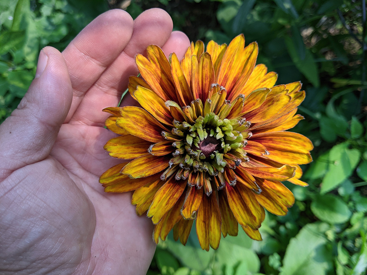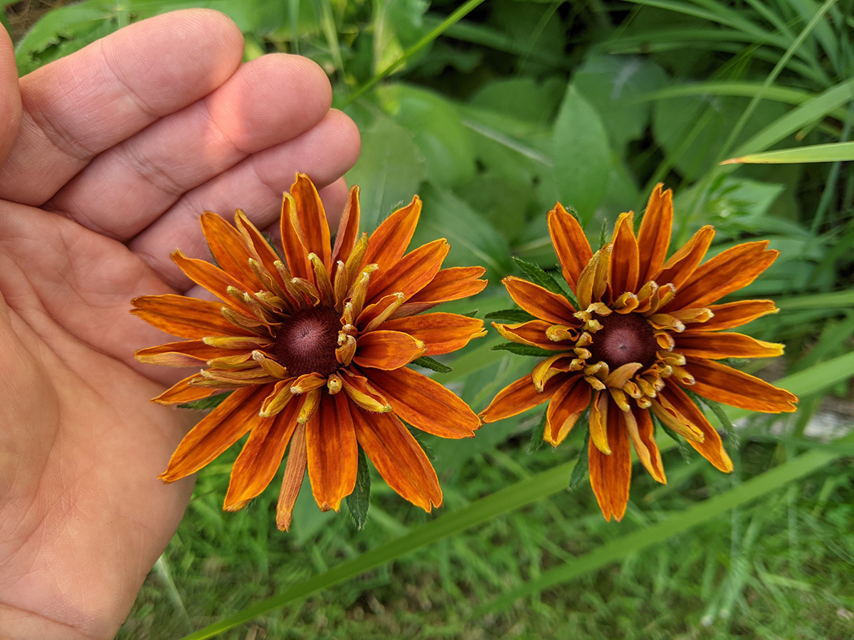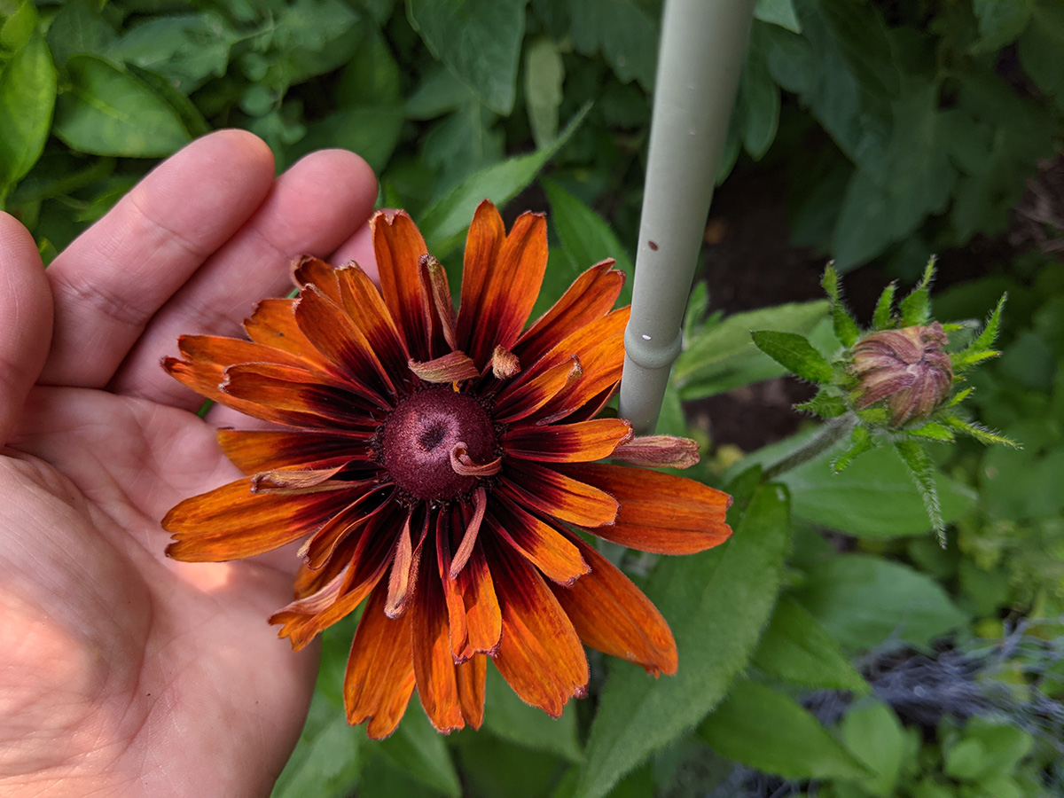 the 'cherokee sunset' rudbeckias continue to slowly open. not only are these flowers large and showy, but they look like they might last a long time.