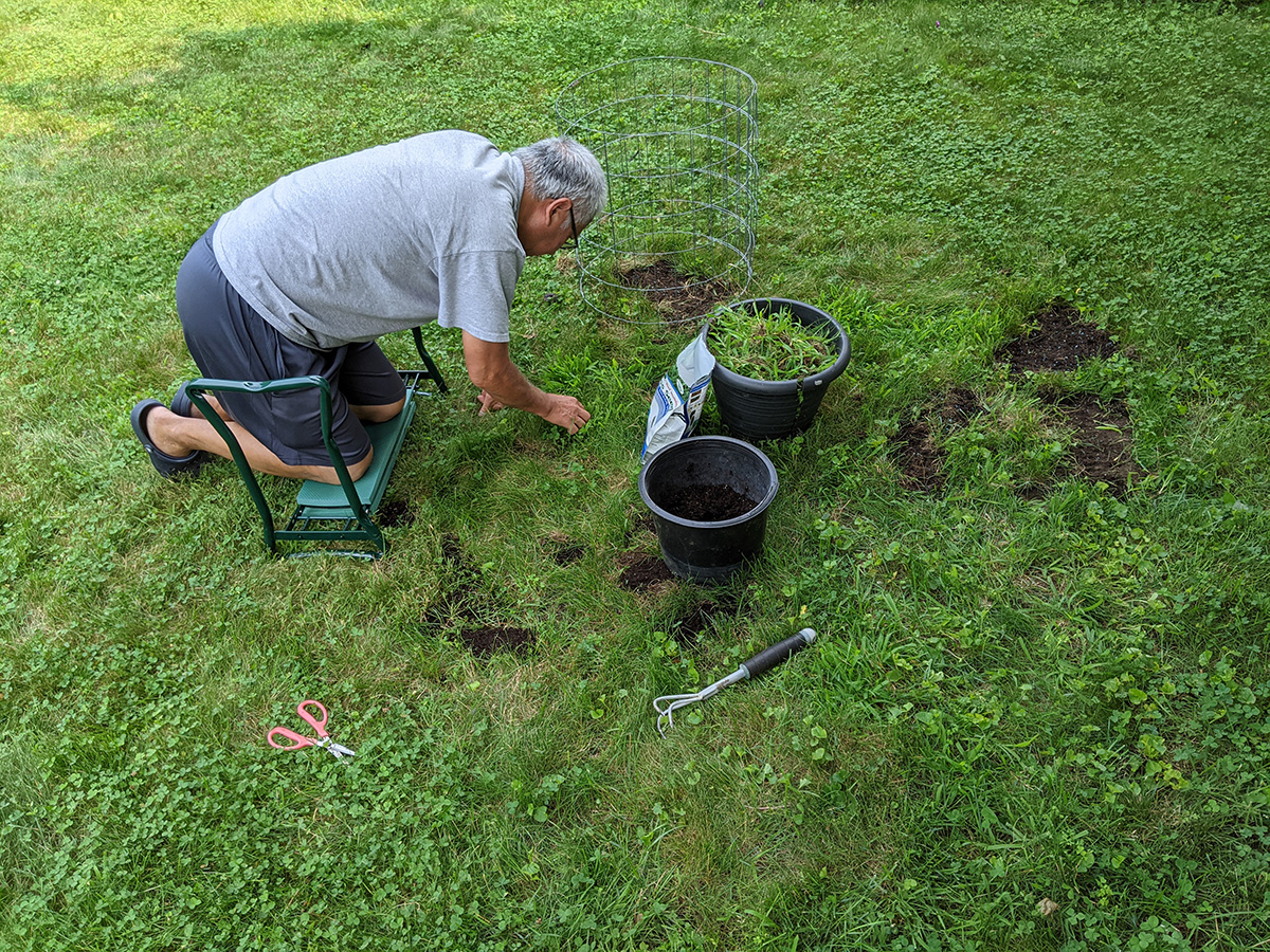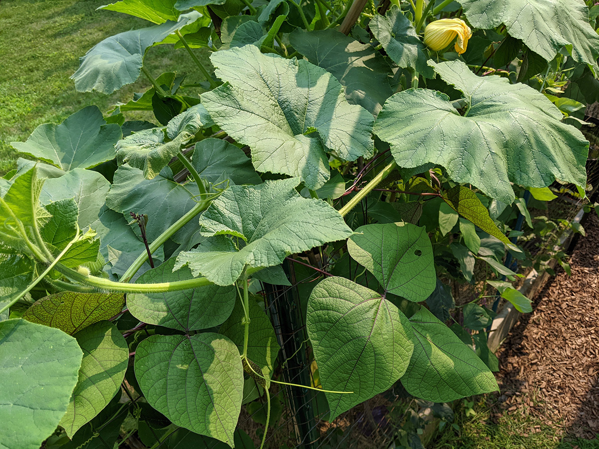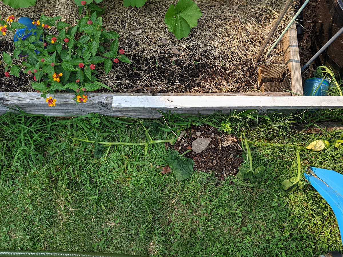 the squash vine crawling on the grass is dying. no wonder, it suffered a kink and possible squash vine borer damage at its base, which immediately killed all the branching vines. there were two plum-sized baby squashes on these vines and now it looks like we lost them if the vines end up dying. i injected them with Btk as a last ditch effort.
