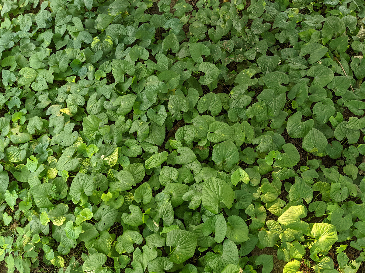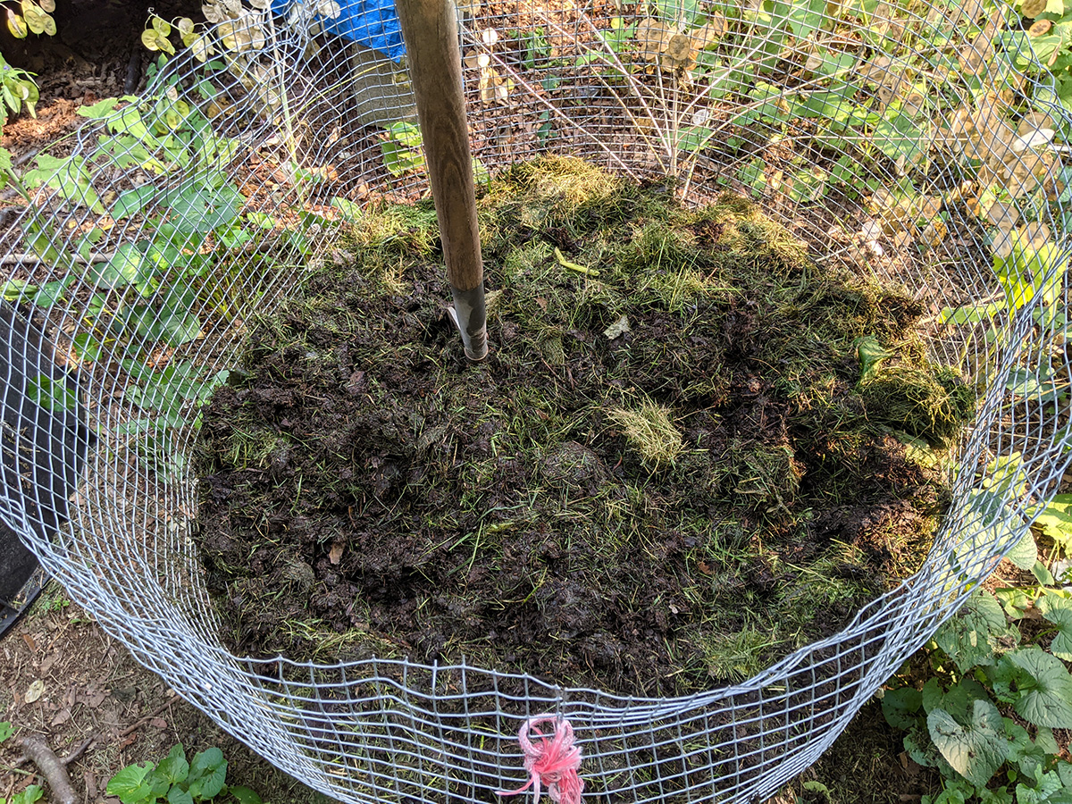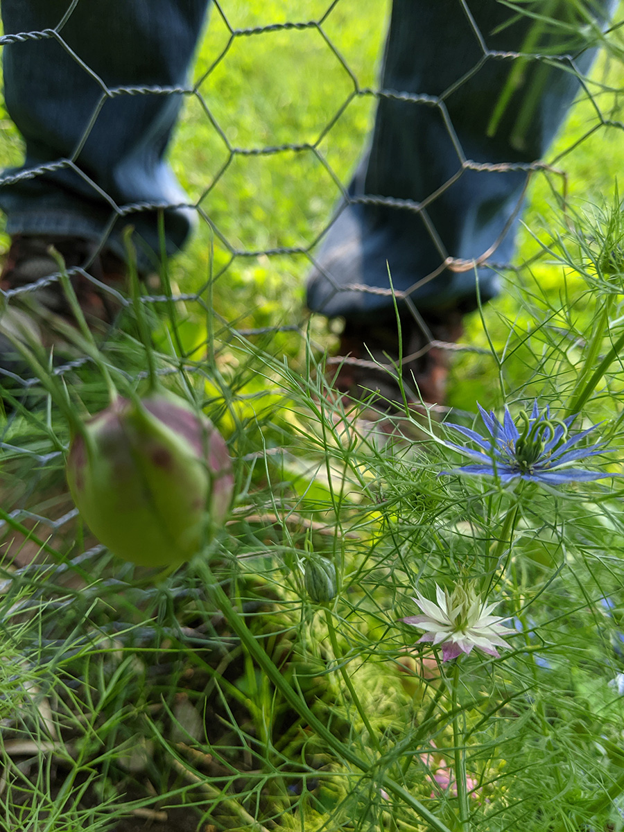 the squash vine crawling on the grass is dying. no wonder, it suffered a kink and possible squash vine borer damage at its base, which immediately killed all the branching vines. there were two plum-sized baby squashes on these vines and now it looks like we lost them if the vines end up dying. i injected them with Btk as a last ditch effort.