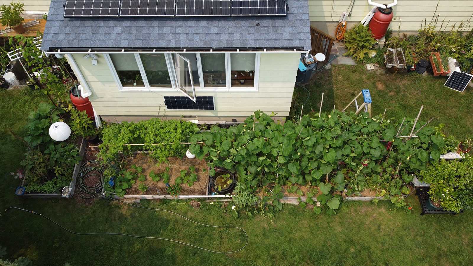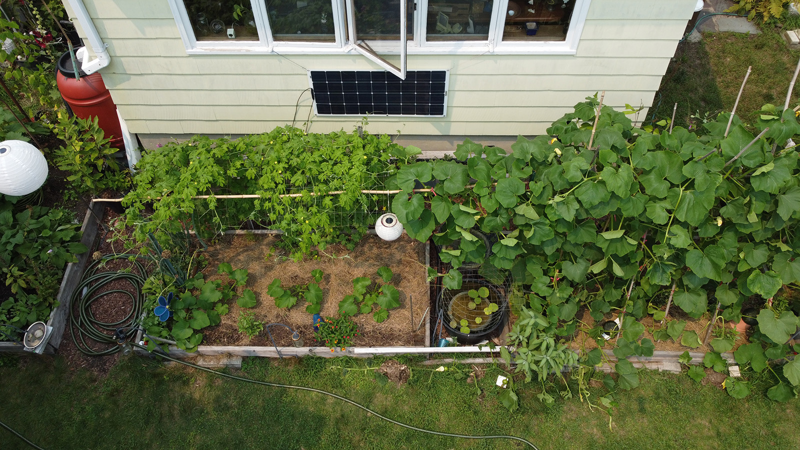 speaking of drones, i went out into the backyard to test fly the mini 2 using my pixel 3XL phone. the fly app was updated recently, and i was hopefully they fixed the crashing issue. all seemed well as i did some gently flying above the house, taking snapshots of the garden from above. but at the midway point the app did crash - went to a black screen. it didn't freeze the phone and i was able to exit to the home screen and manually quit the app before turning it back on again. still, any type of phone crash while flying is one too many crashes. i took a photo of the house from a new angle, west facing east. while i went up to 400ft and tilted the camera up to see boston, i could barely make out the city through the smoke haze.