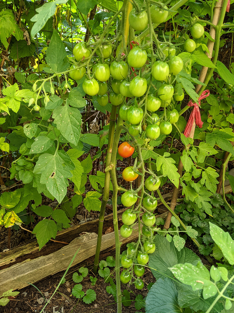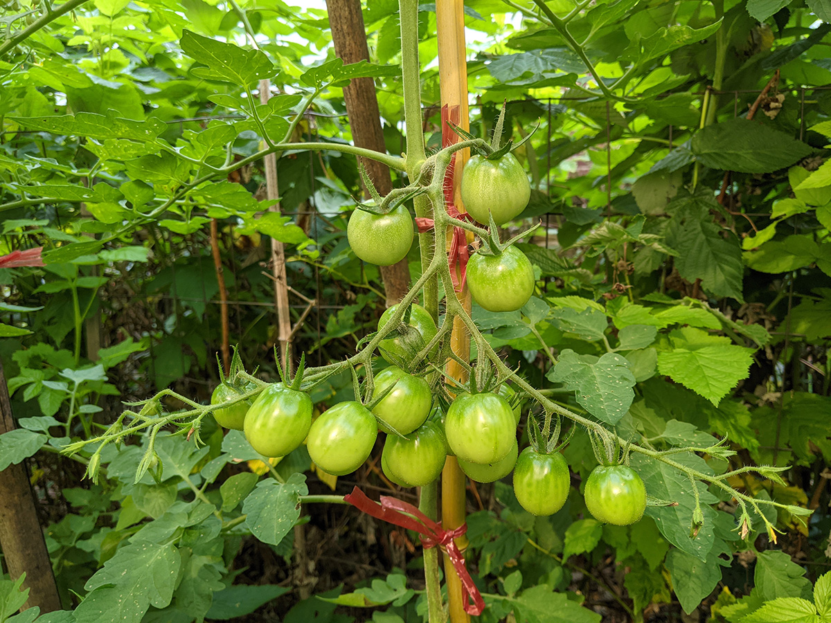 the wild tomatoes are growing crazy. strands as long as 1-1/2 feet, or branching strands, or fruit strands that develop additional leaves. the tomatoes are also very sweet, much sweeter than typical cherry tomatoes which have a sourness to them.