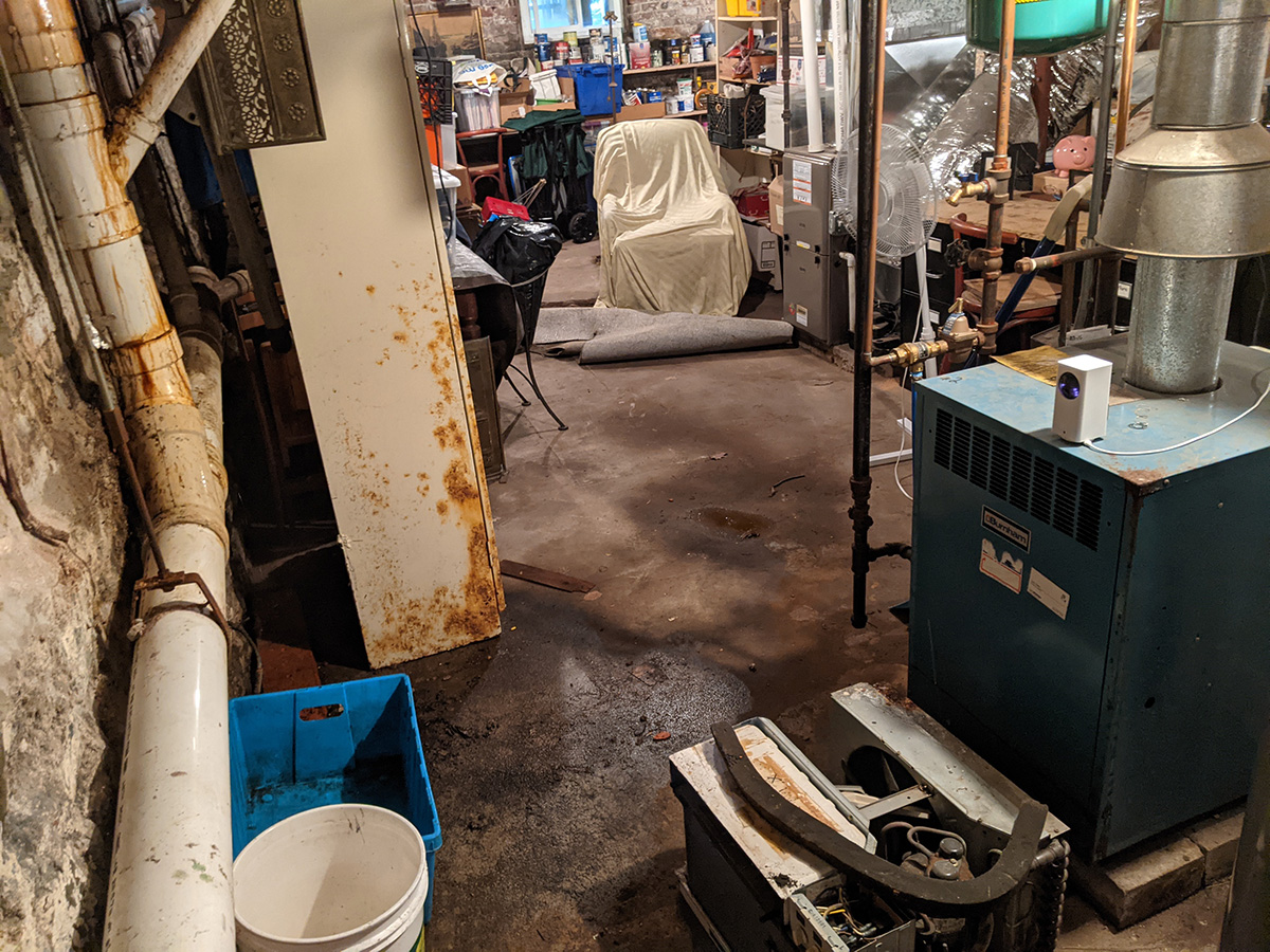 yesterday i swapped out the bucket with a larger plastic rectangular recycle bin. when i went down to check on it this morning, i was happy to see the bin wasn't leaking, because i didn't check it for cracks before i put it in service. i poured out the water into the bucket and dumped the water in the backyard. i also opened a few basement windows and turned the oscillating fan back on to help dry out the puddles.