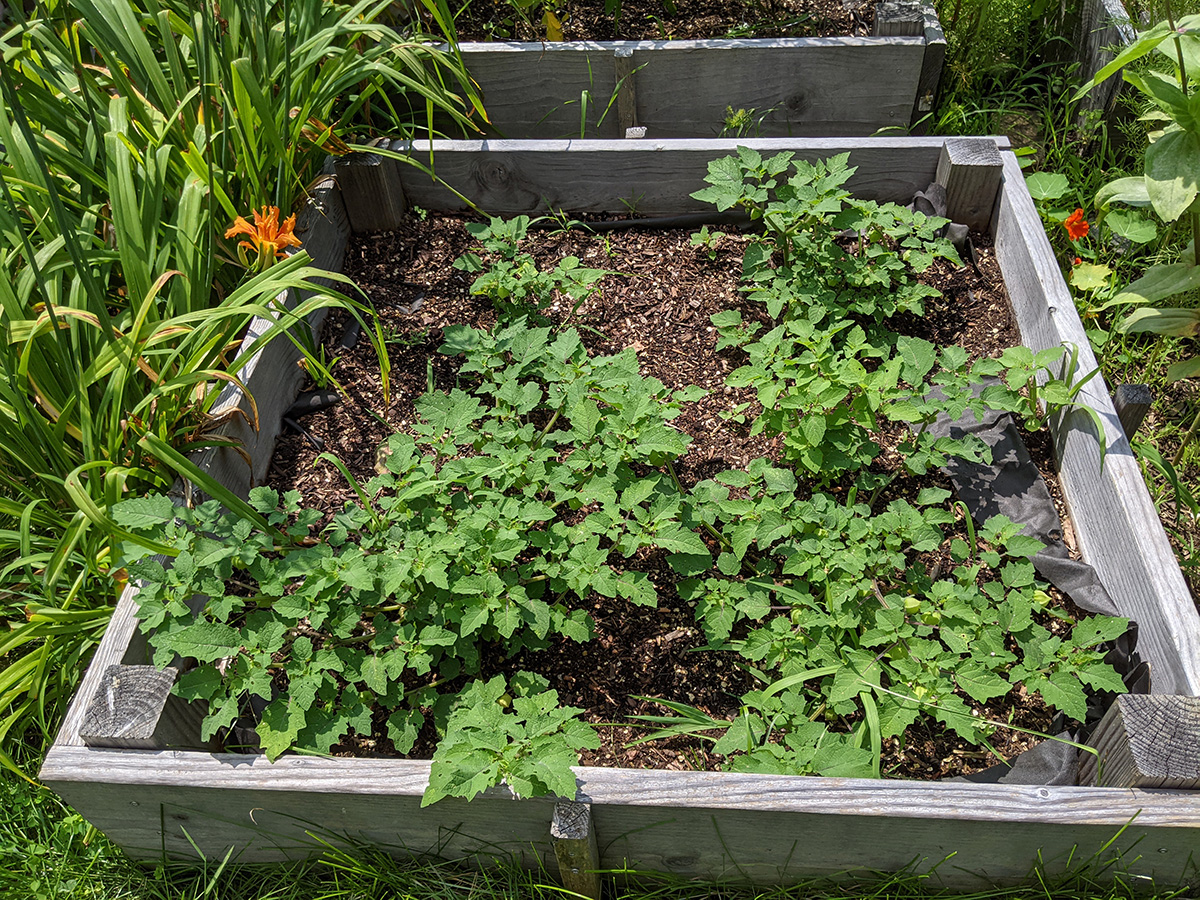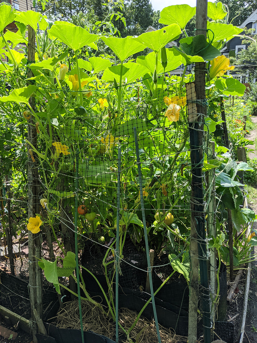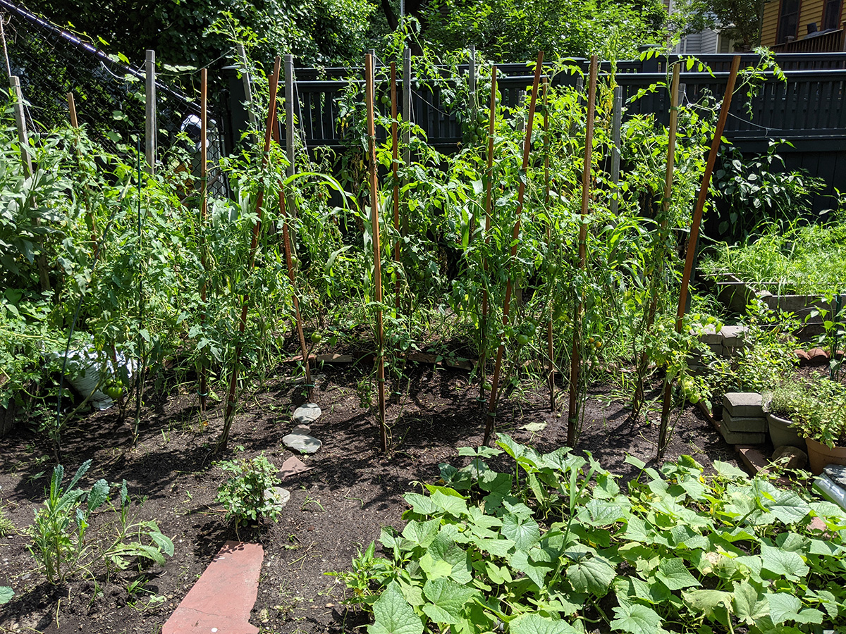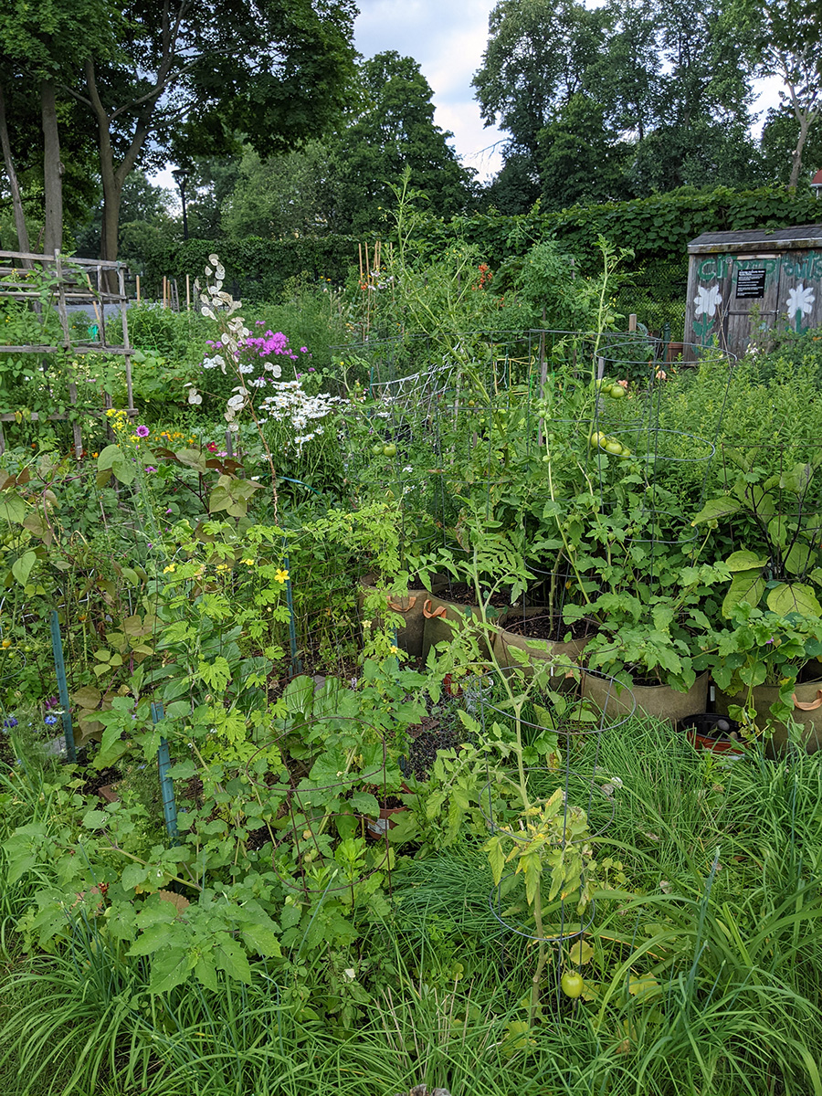 i went to the community garden in the late morning to do some weeding and use up the rest of my espoma plant-tone fertilizer in the growbags. i also watered jen's garden. even though it was a warm day, i wore plants because i didn't want to get anymore mosquito bites. there was one other gardener - sam - who had the plot in the far northeastern corner of the community garden up against the fences. i saw him harvest a bunch of carrots, they weren't too big, but still large enough to make a meal or two out of it. he said a lot of his tomatoes were dying, a combination of powdery mildew, seasonal blight, and rats. i continued working in my own garden, snipping off the striped mallows which have mostly turned to seeds. i also removed some diseased tomato leaves.