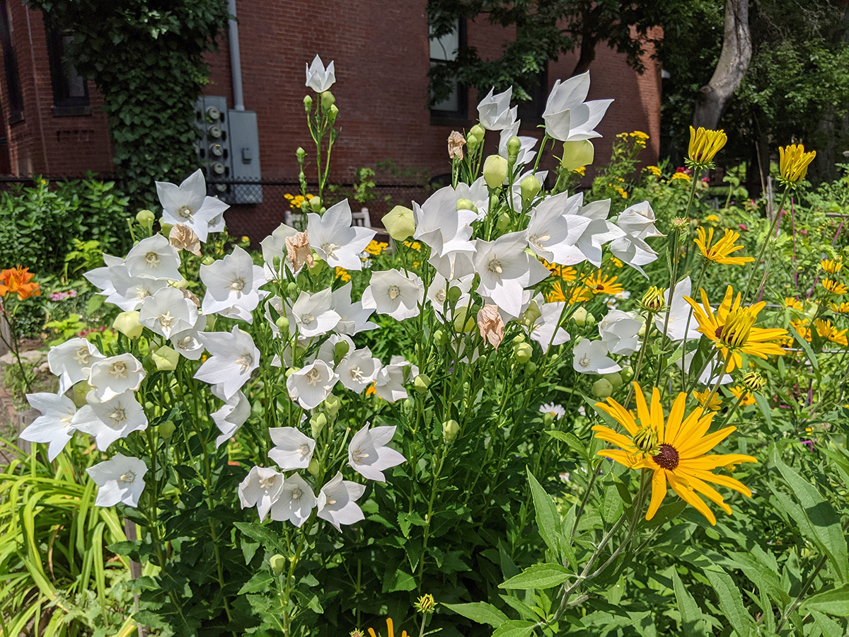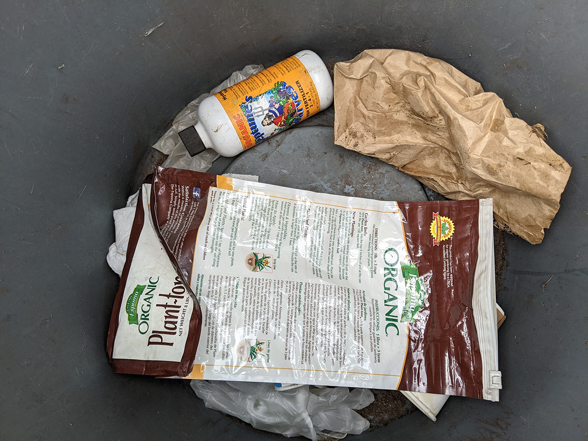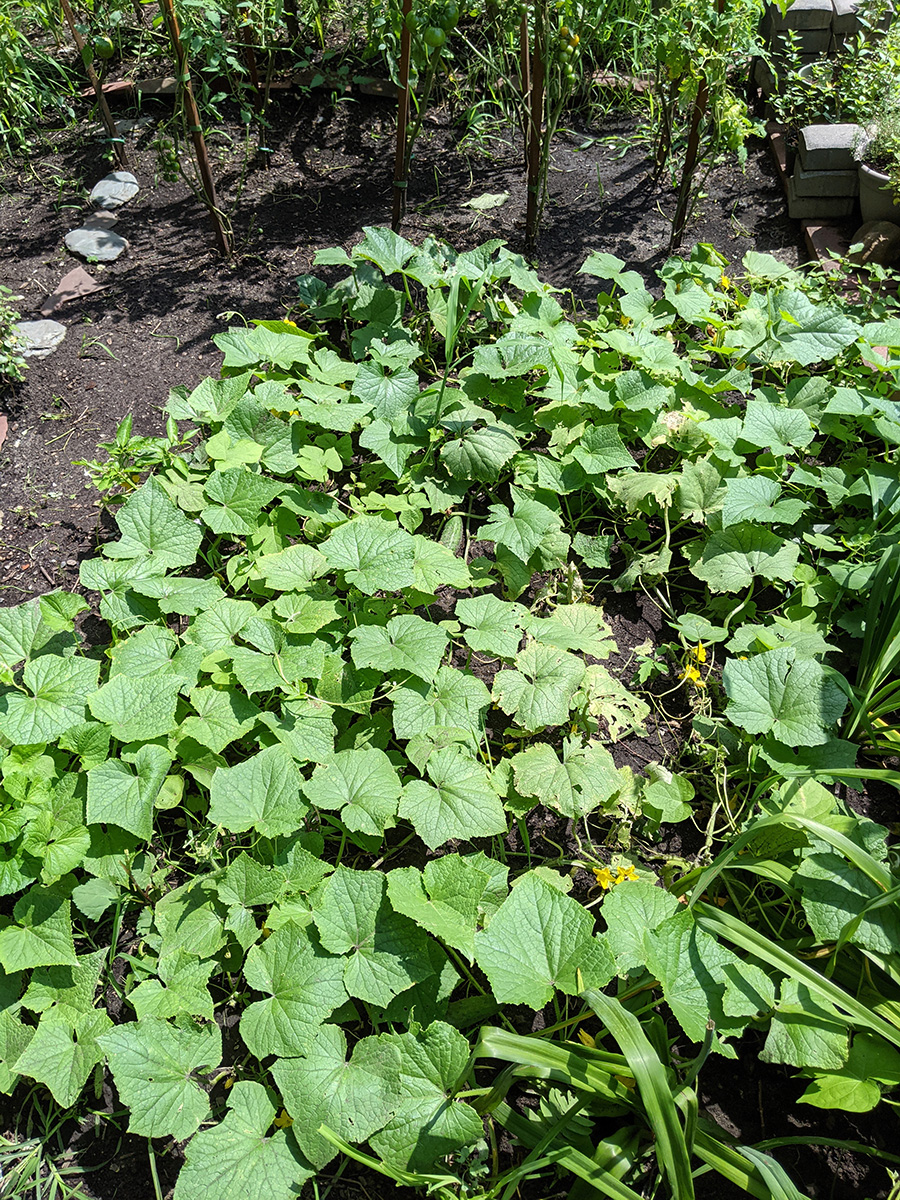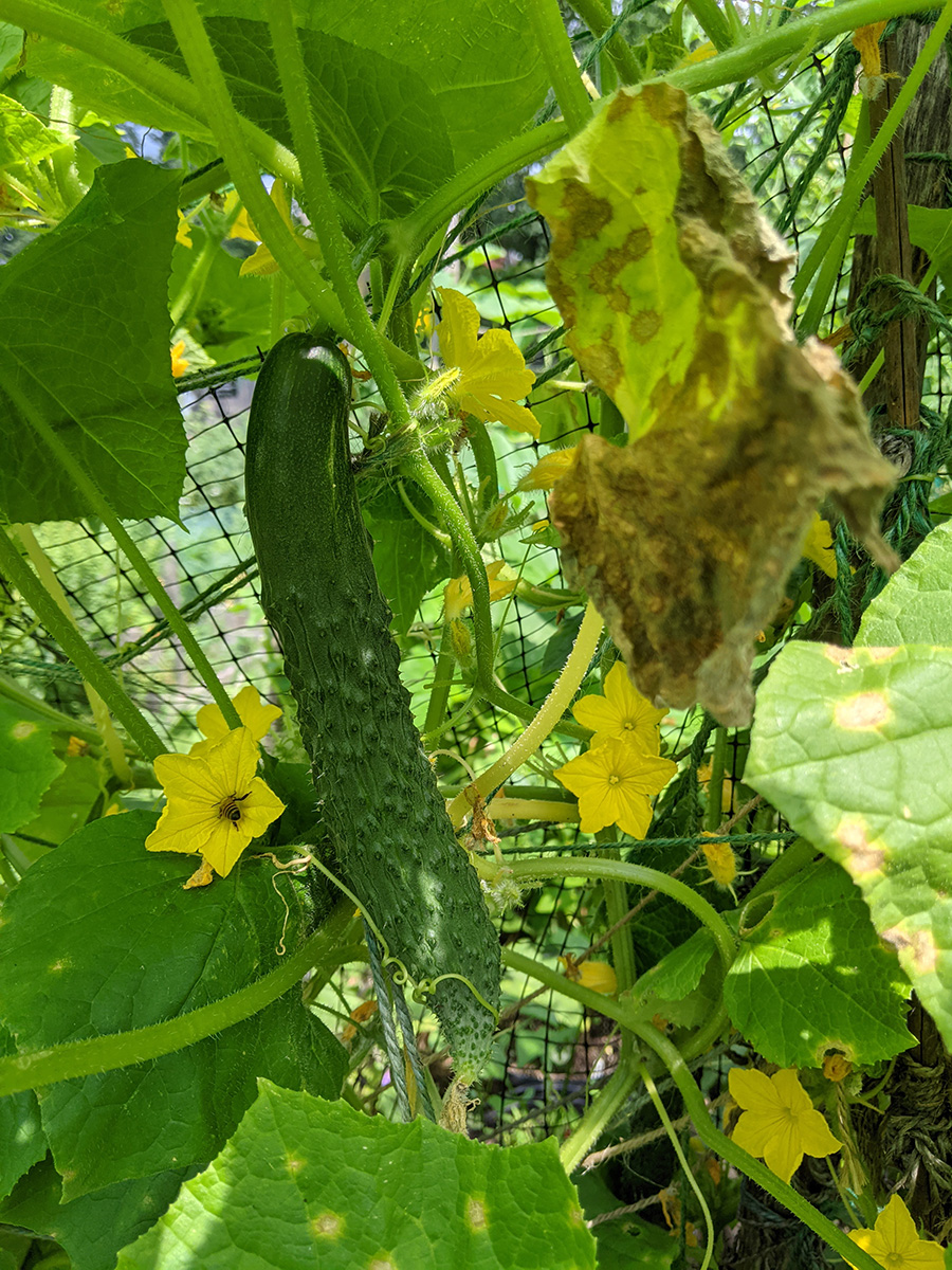 i went to the community garden in the late morning to do some weeding and use up the rest of my espoma plant-tone fertilizer in the growbags. i also watered jen's garden. even though it was a warm day, i wore plants because i didn't want to get anymore mosquito bites. there was one other gardener - sam - who had the plot in the far northeastern corner of the community garden up against the fences. i saw him harvest a bunch of carrots, they weren't too big, but still large enough to make a meal or two out of it. he said a lot of his tomatoes were dying, a combination of powdery mildew, seasonal blight, and rats. i continued working in my own garden, snipping off the striped mallows which have mostly turned to seeds. i also removed some diseased tomato leaves.