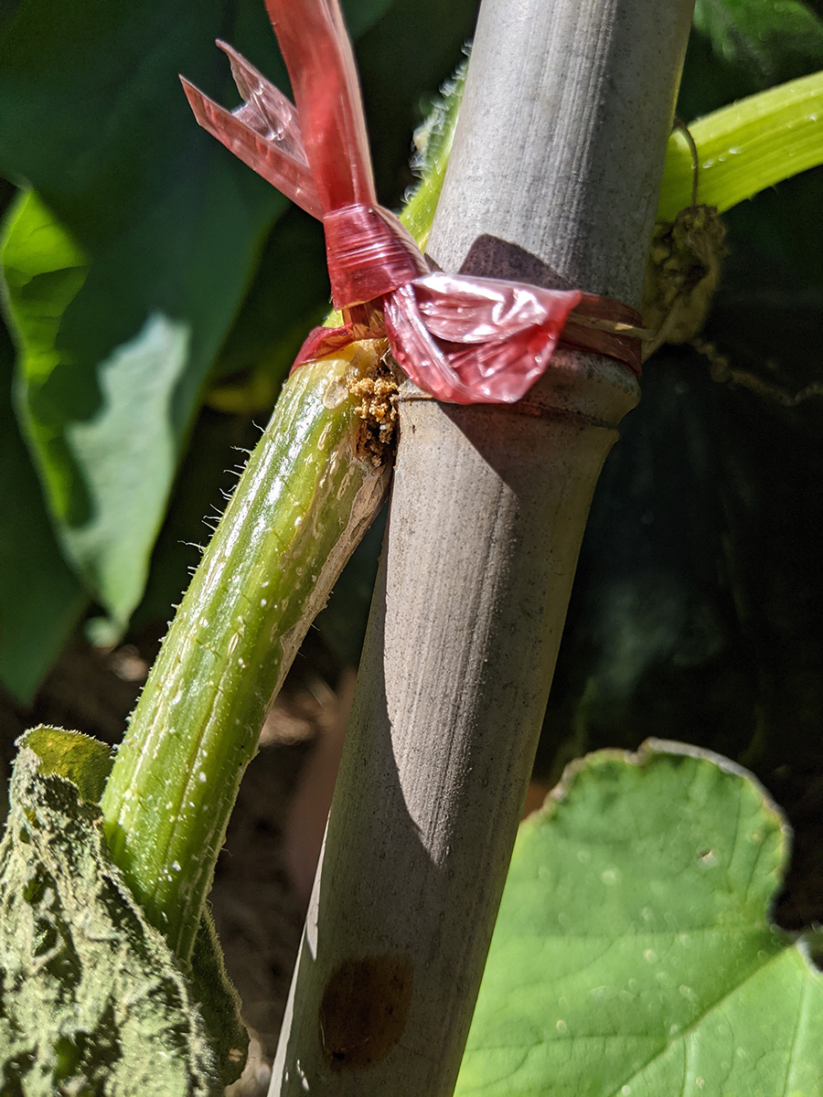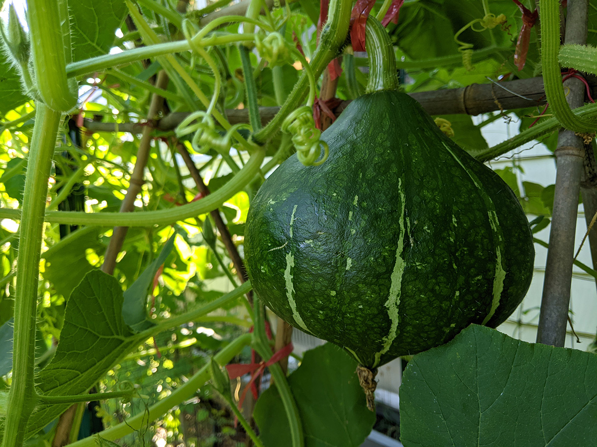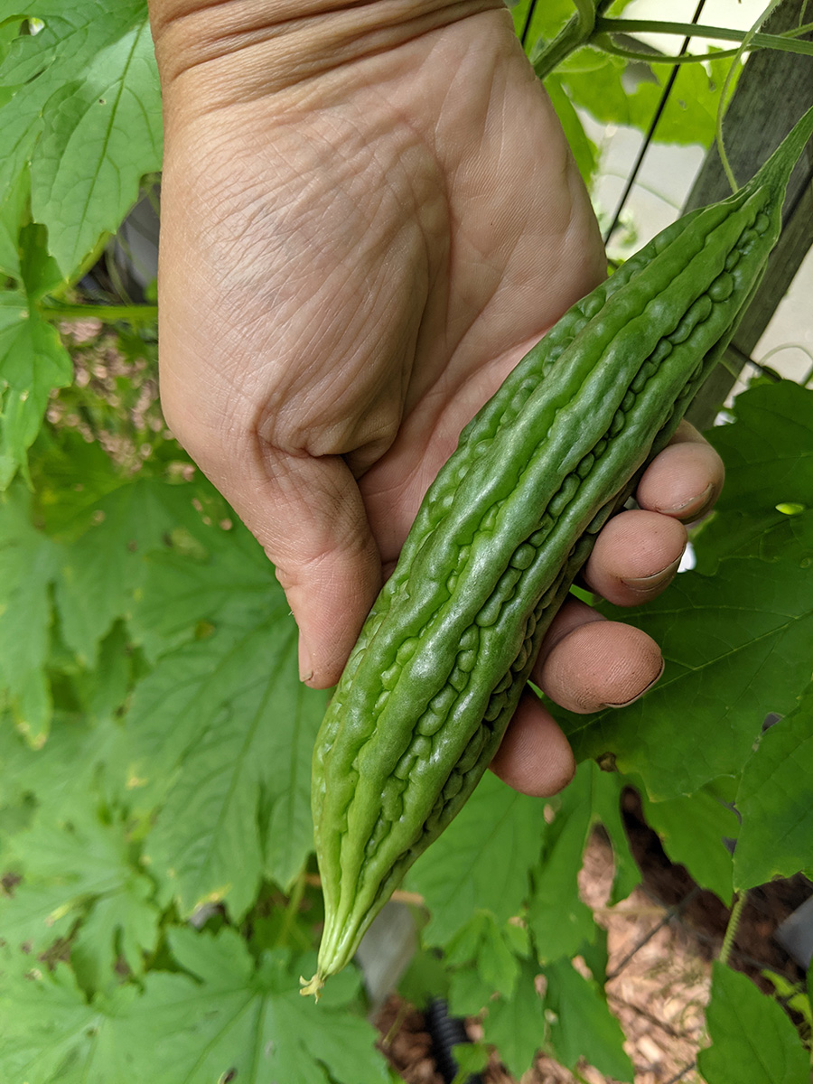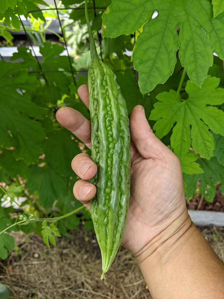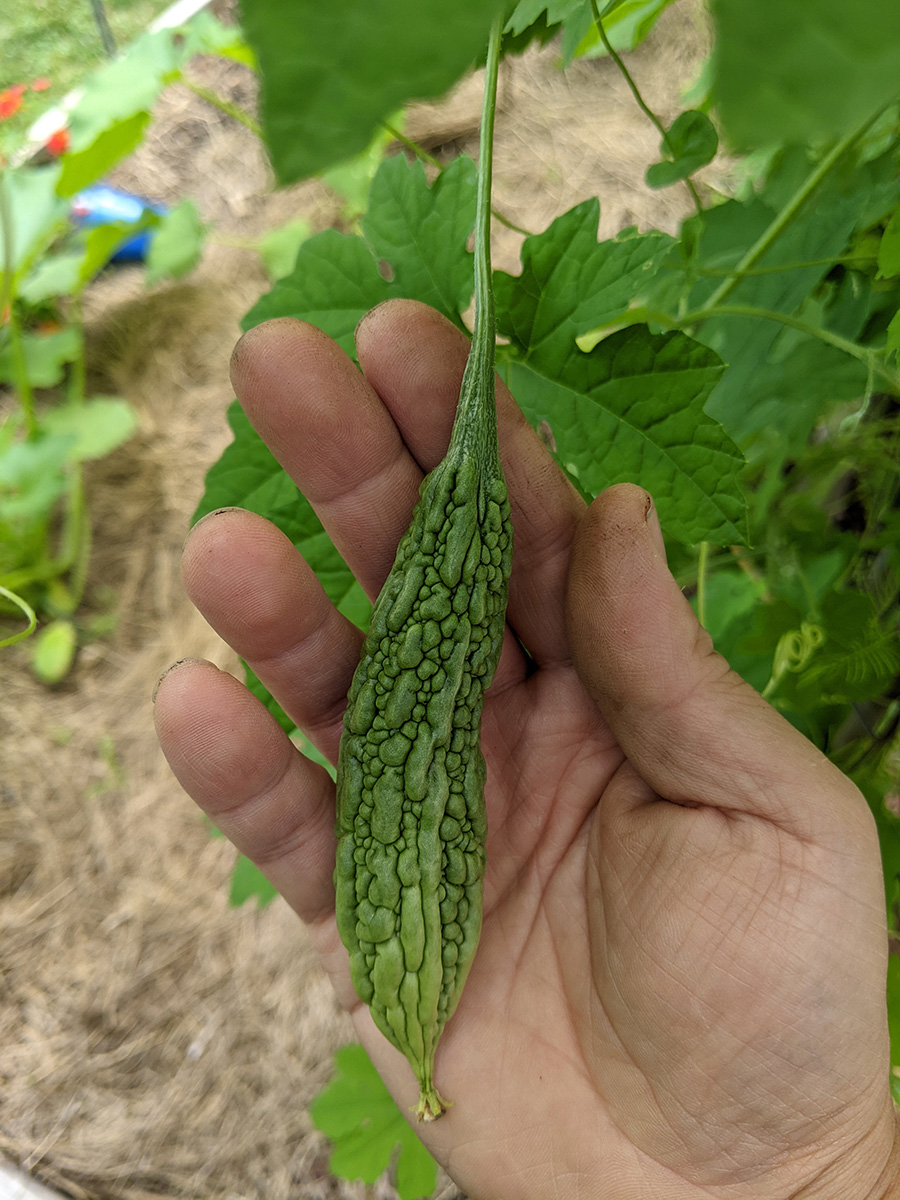 bitter melon vines continue to grow, with several dangling fruit. the largest one is 7-8" but it ought to be able to get a bit bigger before we harvest. the vines seem to be in a melon production mode as there seems to be fewer flowers now.