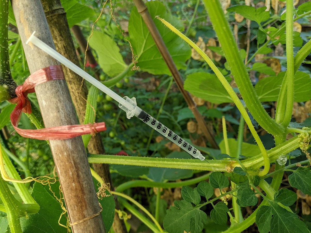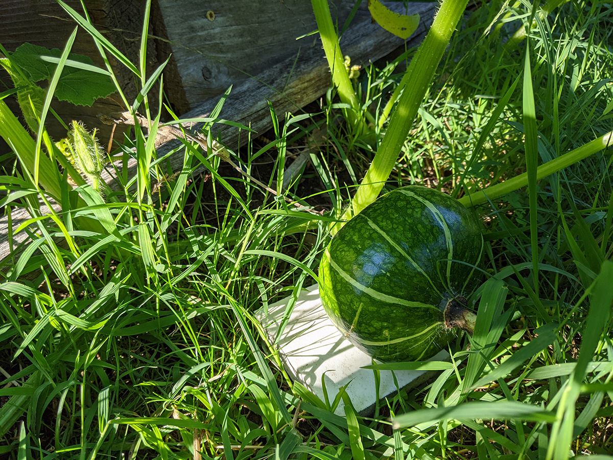 i didn't get to my parents' place until almost 4pm. i hadn't seen the backyard since monday. overall all the plants seem to be doing well. i noticed a few of the squash vine leaves were drooping, and when i took a closer look, i found two plants that had squash vine borer damage. i quickly mixed a solution of BTk and injected the vines. of the squash vines growing outside of the raised bed, the strand that looked like it all wilted and dying last week seemed to have survived, or parts of it. the stress did cause one of the squash fruits to abort, but that could've happened naturally anyway. one of the vines in RB1 actually managed to produce a 2nd squash and a large hanging one at that. now it's a race against time. with one month remaining of summer (august), will the squash vines have enough energy to make a 2nd or even 3rd squash? and can those squash reach naturally before the cold weather returns in september? the powdery mildew on some of the squash leaves in the western bed are still there, even though i sprayed with neem oil on monday, so i sprayed them again.
