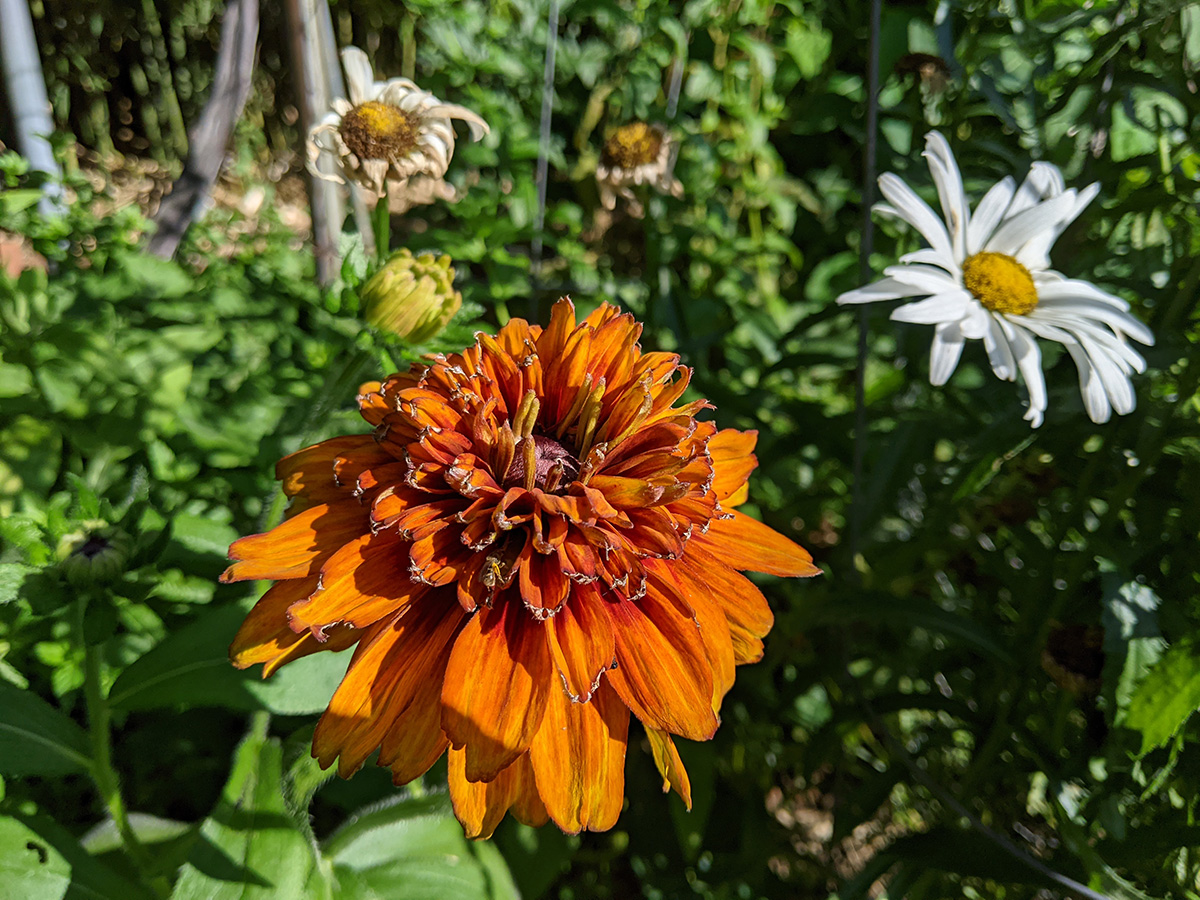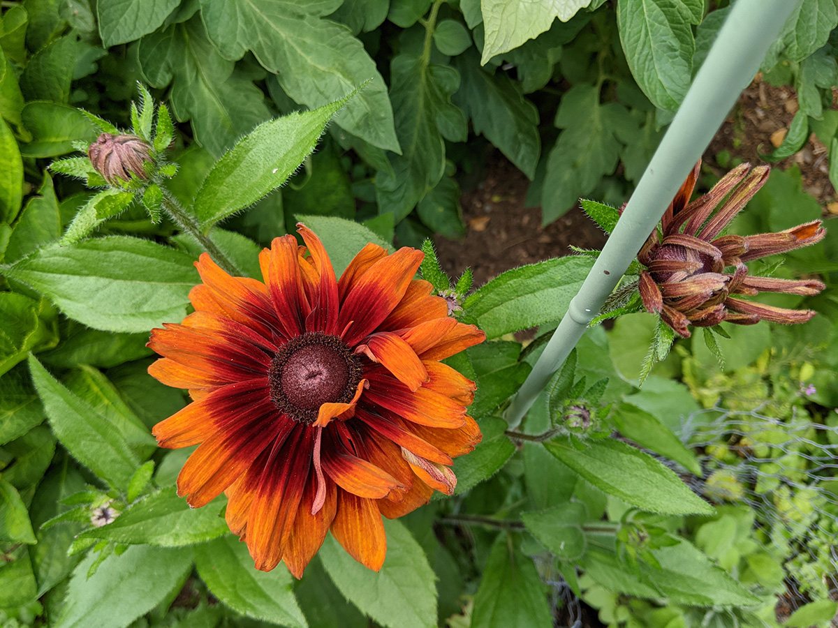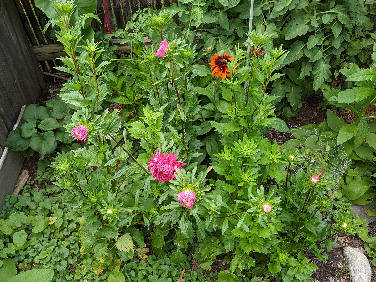 i haven't seen the rudbeckias or chinese asters since monday. they continue to blossom. a few more chinese asters have formed, they all look to be deep pink, no purple flowers yet.