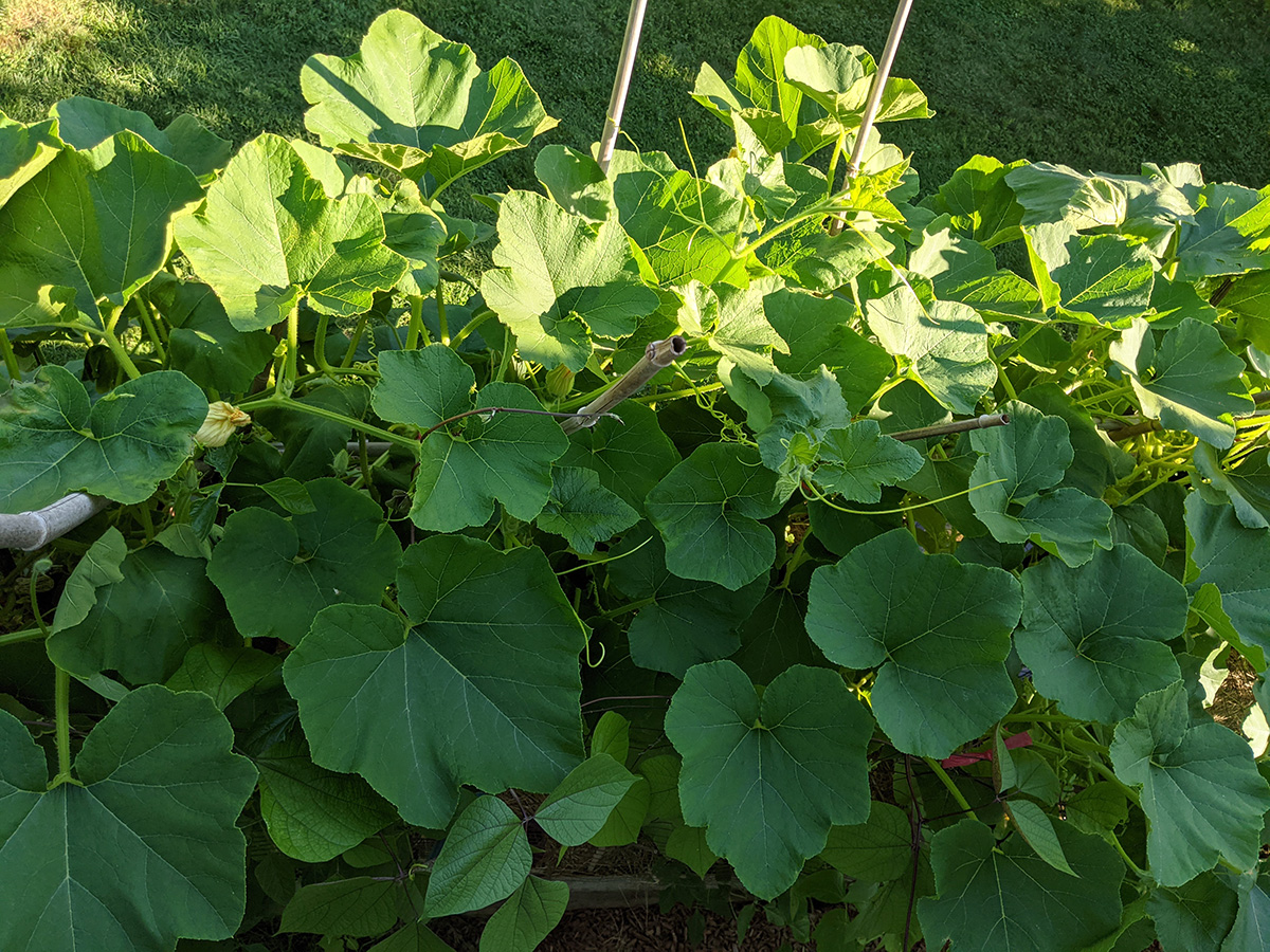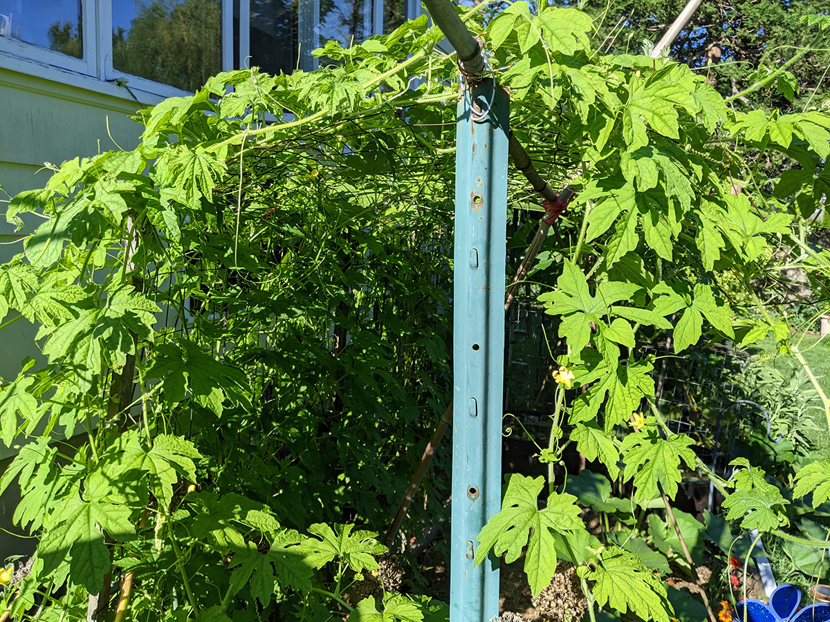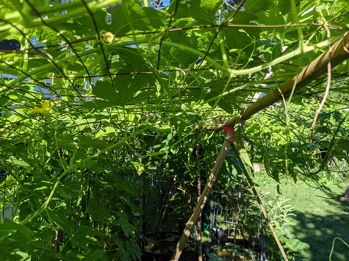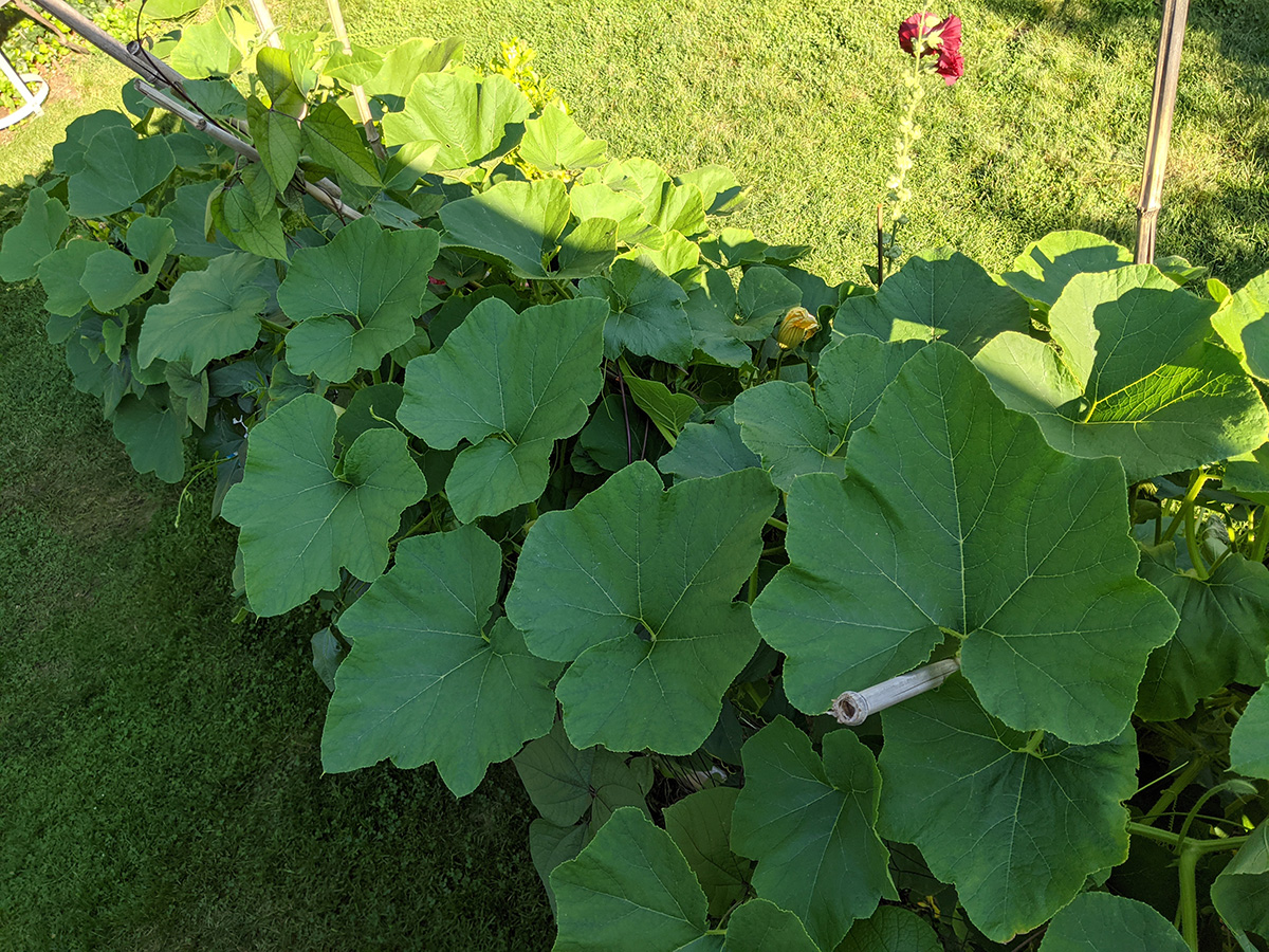 the squashes continue to flourish, the tops of the bamboo pole trellises thick with big squash leaves.