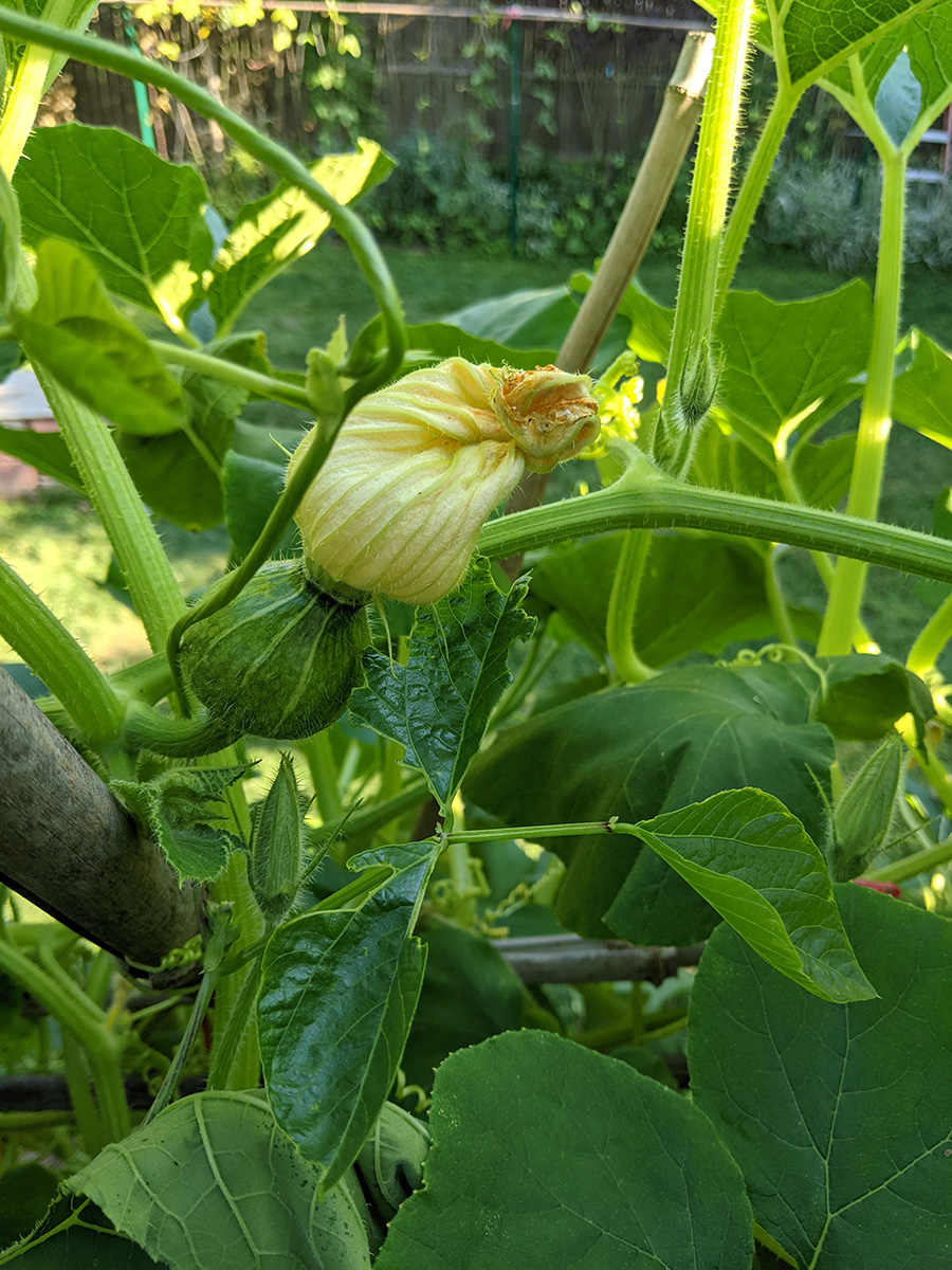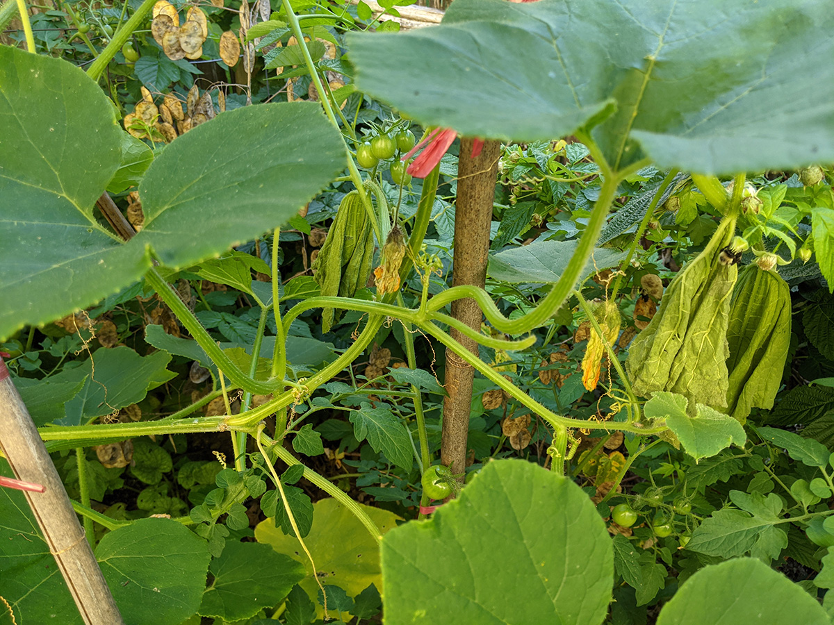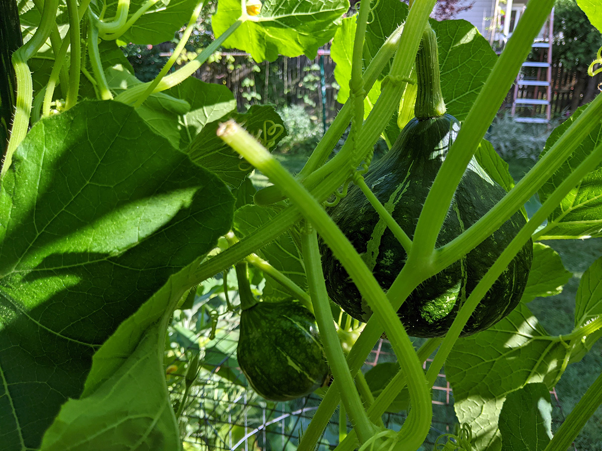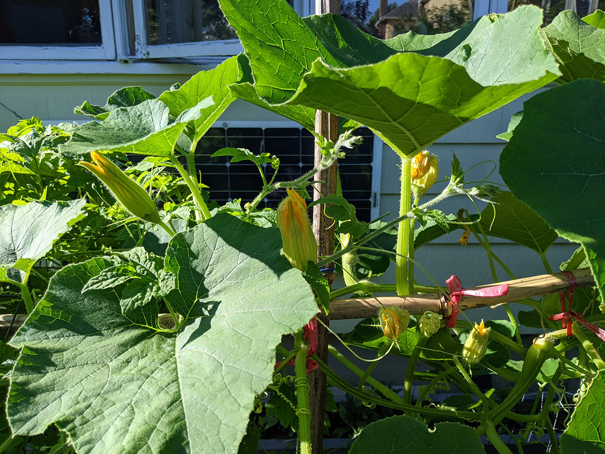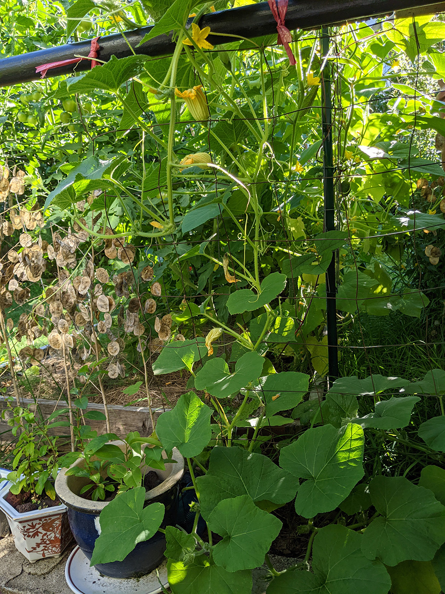 the squashes continue to flourish, the tops of the bamboo pole trellises thick with big squash leaves.