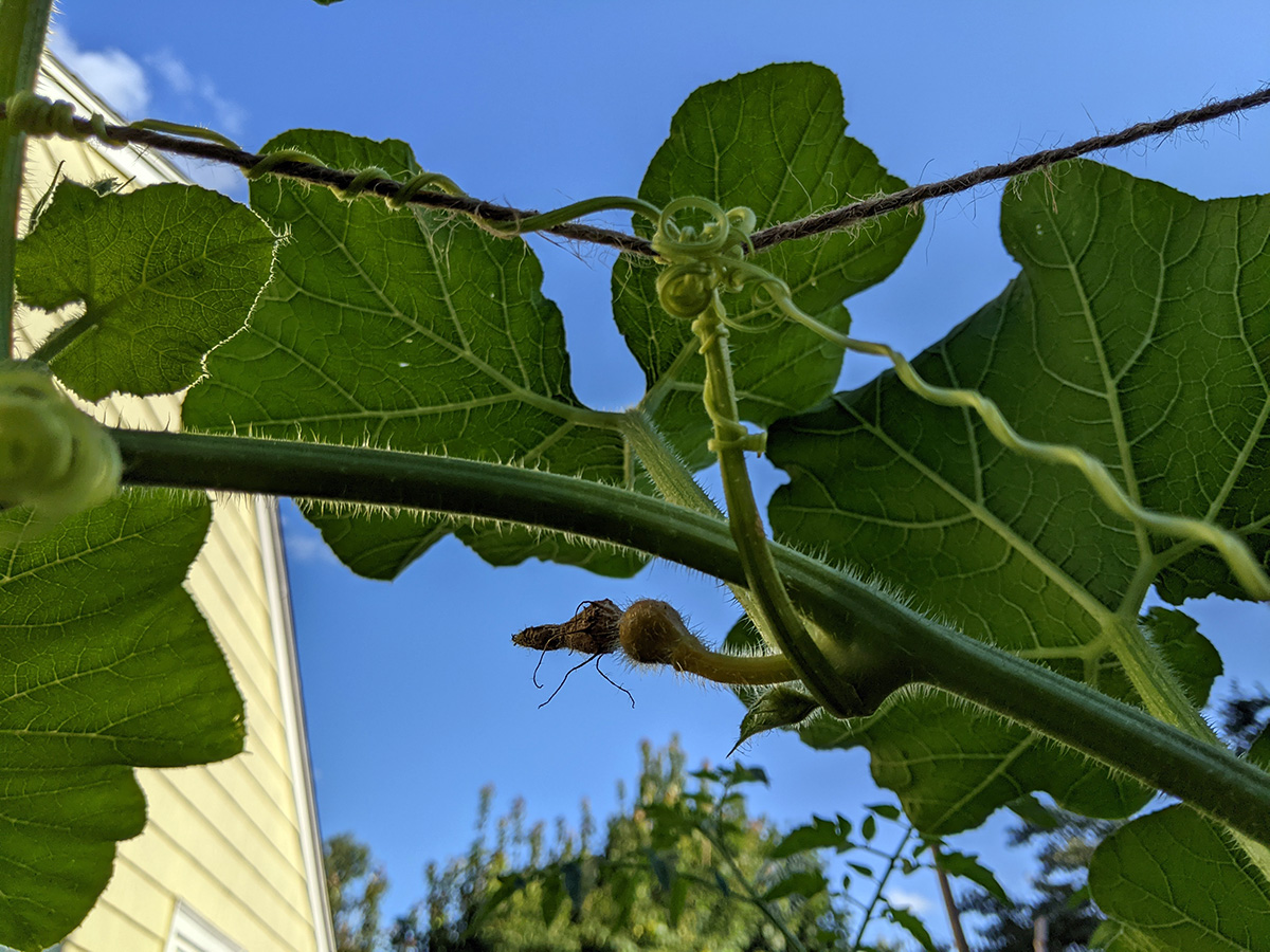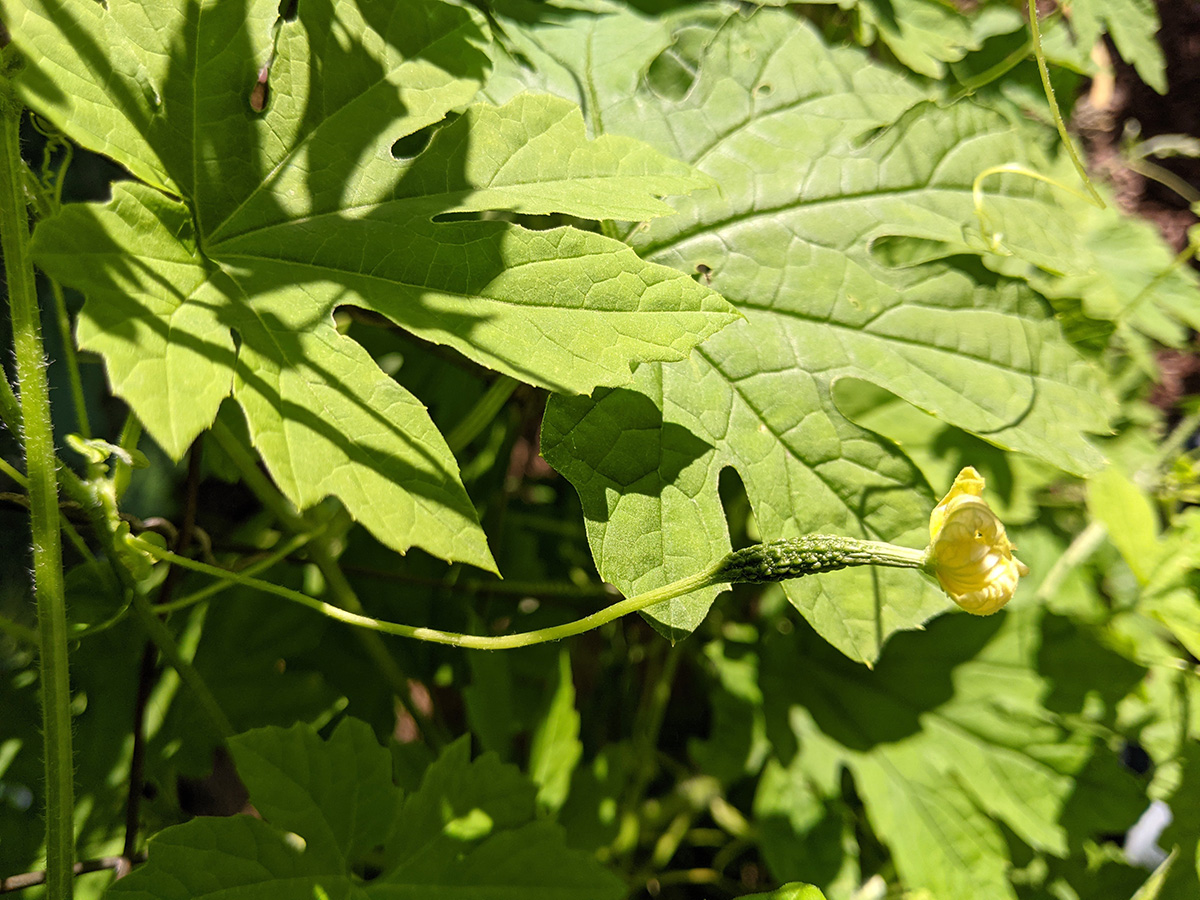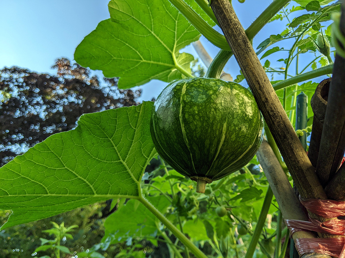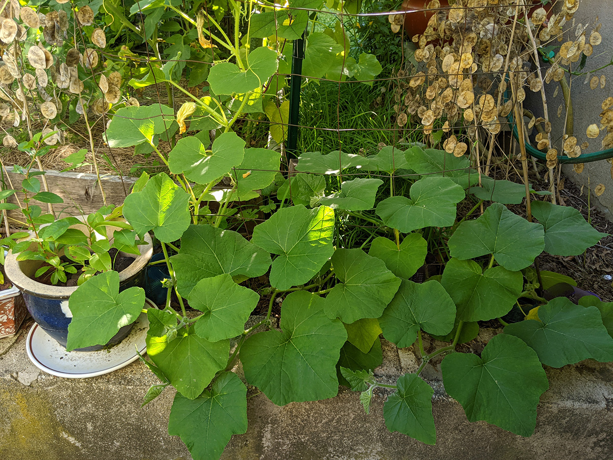 the squashes continue to flourish, the tops of the bamboo pole trellises thick with big squash leaves.