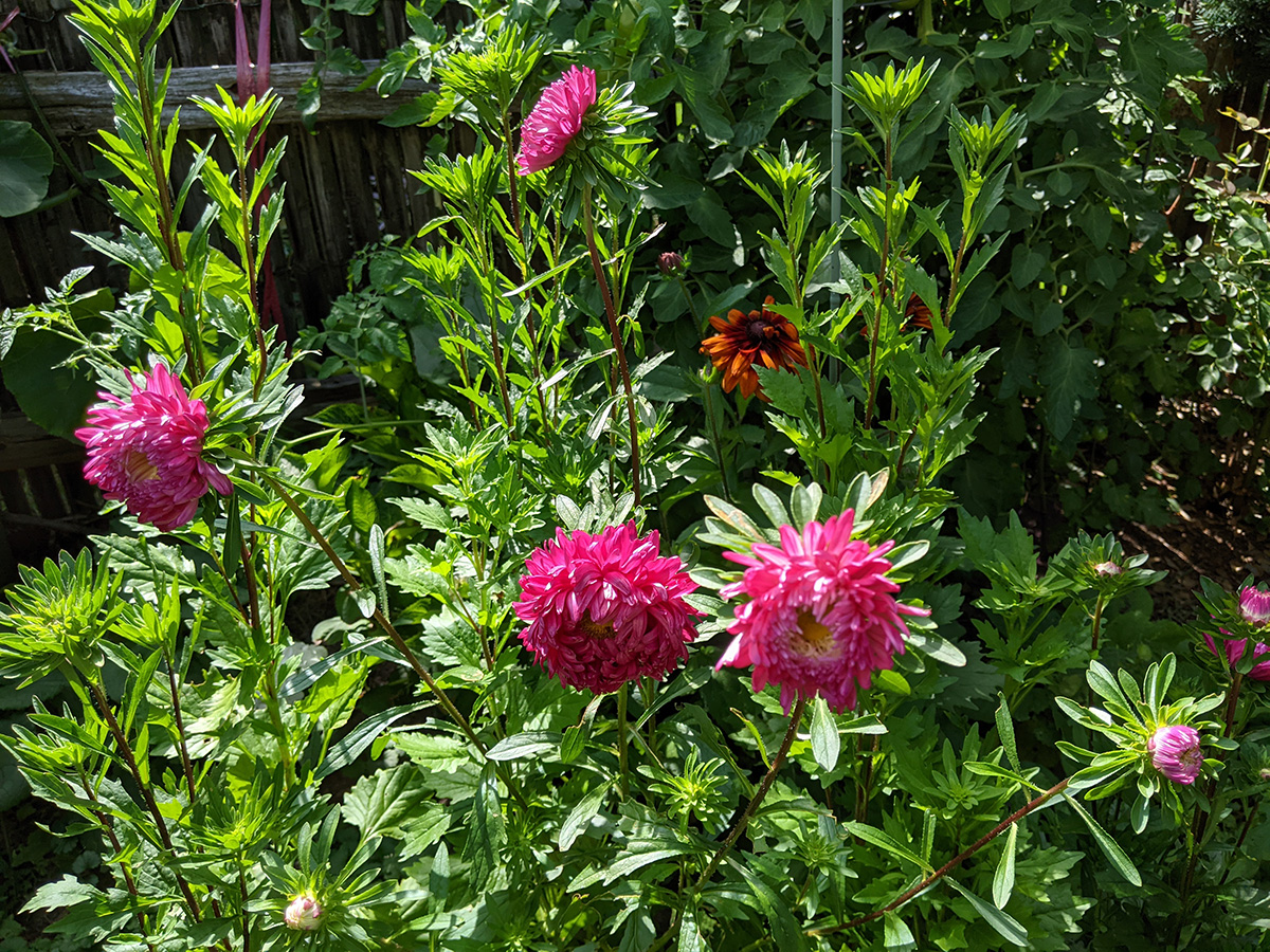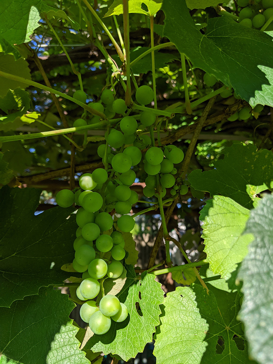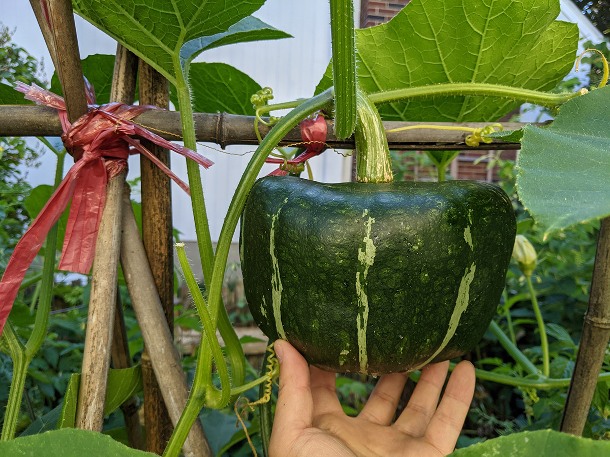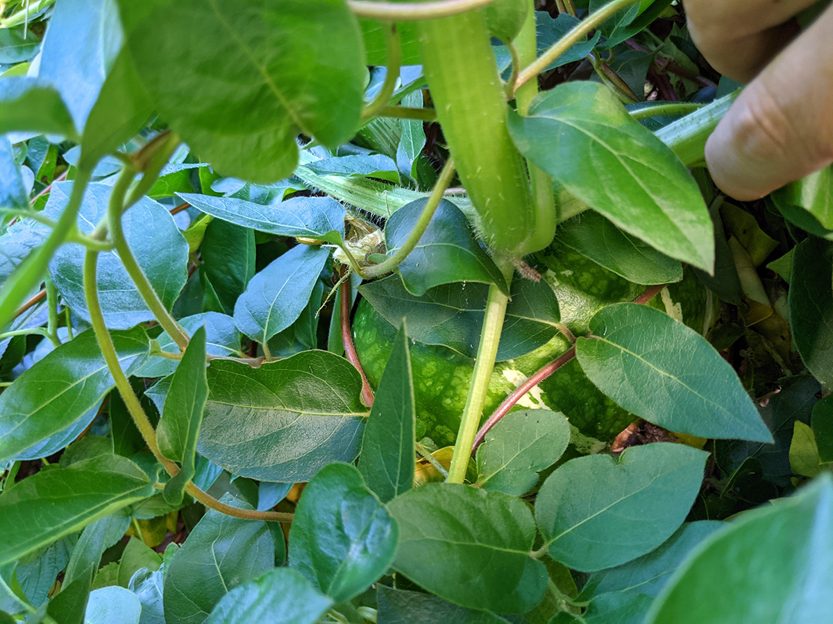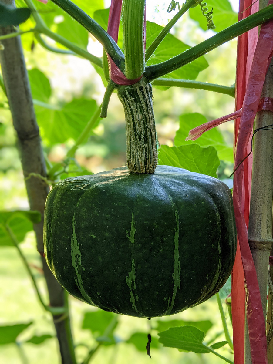 the squashes continue to flourish, the tops of the bamboo pole trellises thick with big squash leaves.