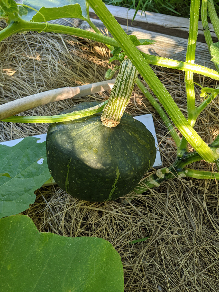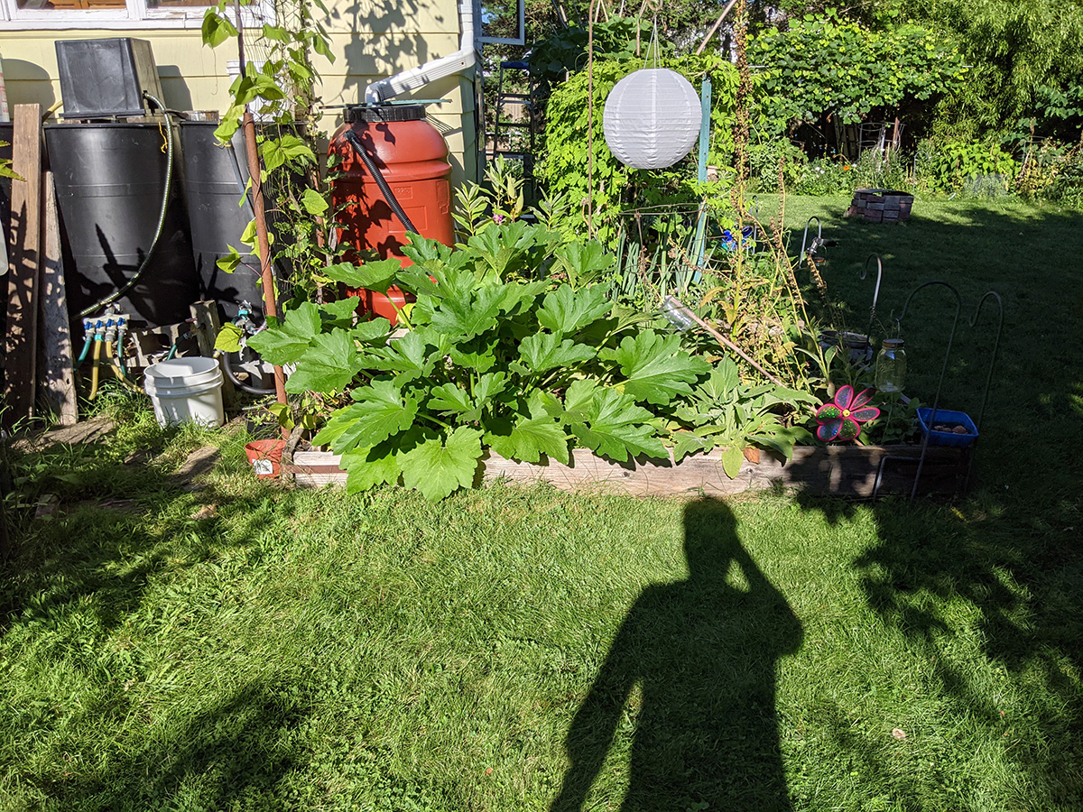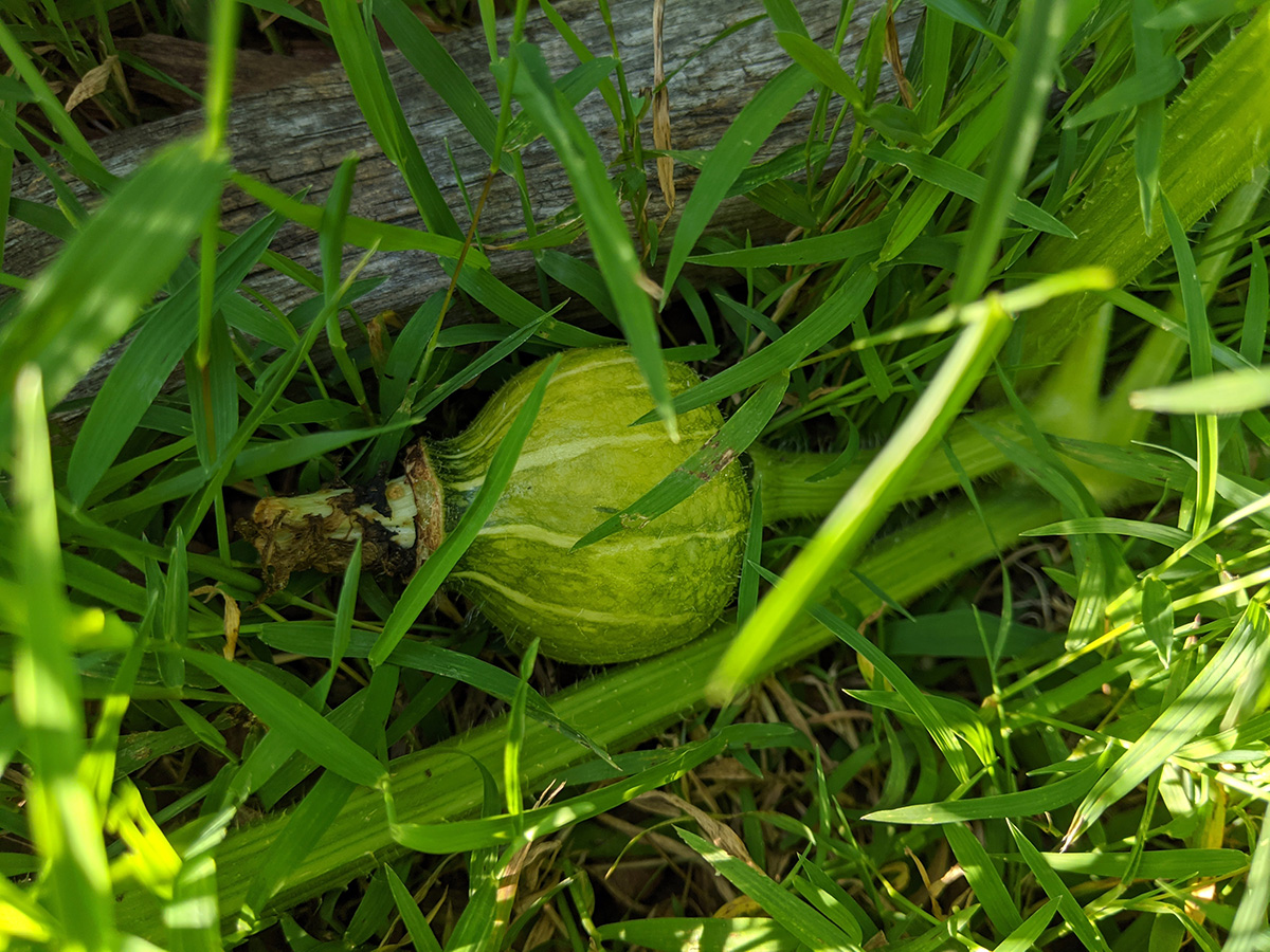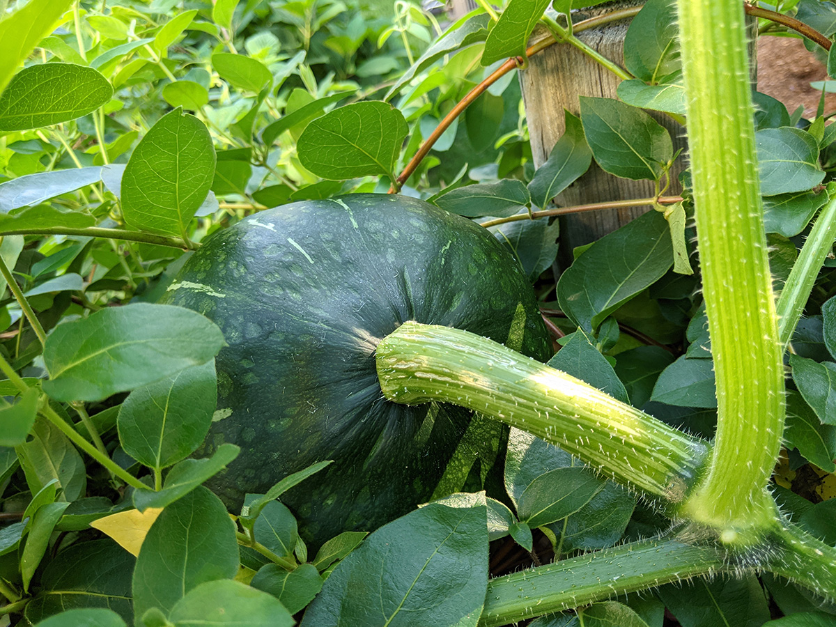 the front garden squash that's growing onto the honeysuckle vines has managed to produce 3 squashes. we only saw 2 but one of them was surprisingly small, until we realized that's actually the 3rd squash and the 2nd squash got so heavy it sunk into the honeysuckles, hidden from view. i also found some vine borer eggs, seems kind of late in the season for them to be still flying around. as for the single squash growing in the western bed, it's managed to grow a large squash with a very flat top, and a second squash. it's also the plant that had borer damage in one of the vines. i treated it but the vine died anyway; fortunately it just a side vine with no squash fruit.
