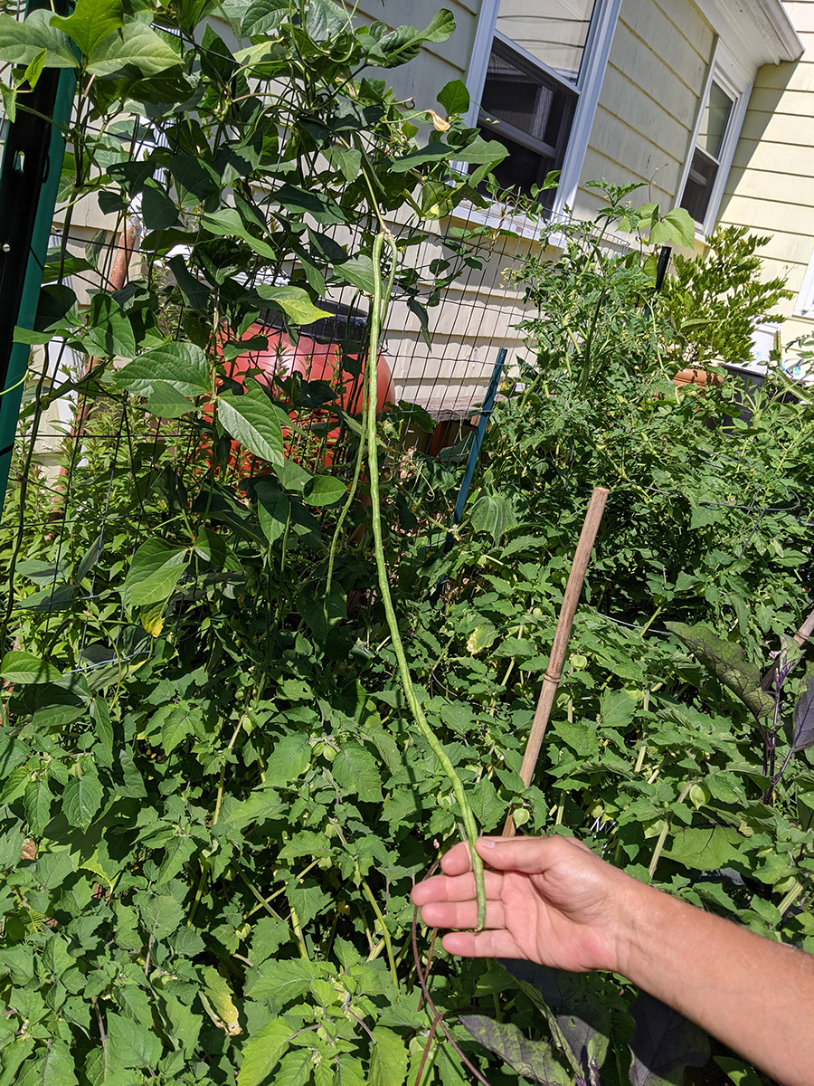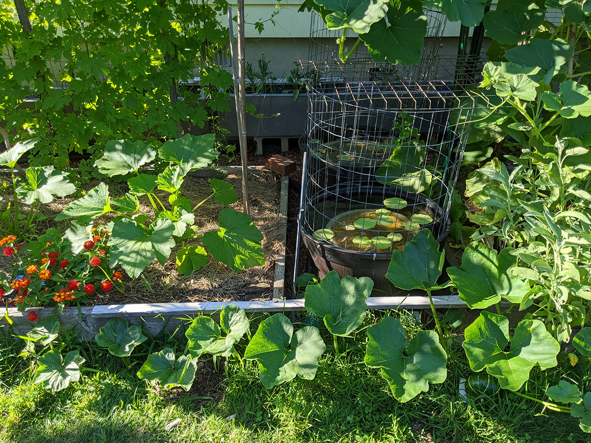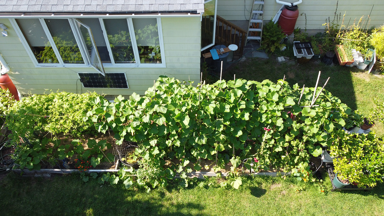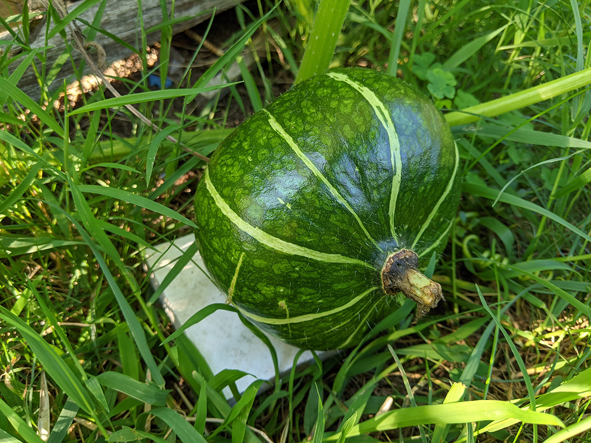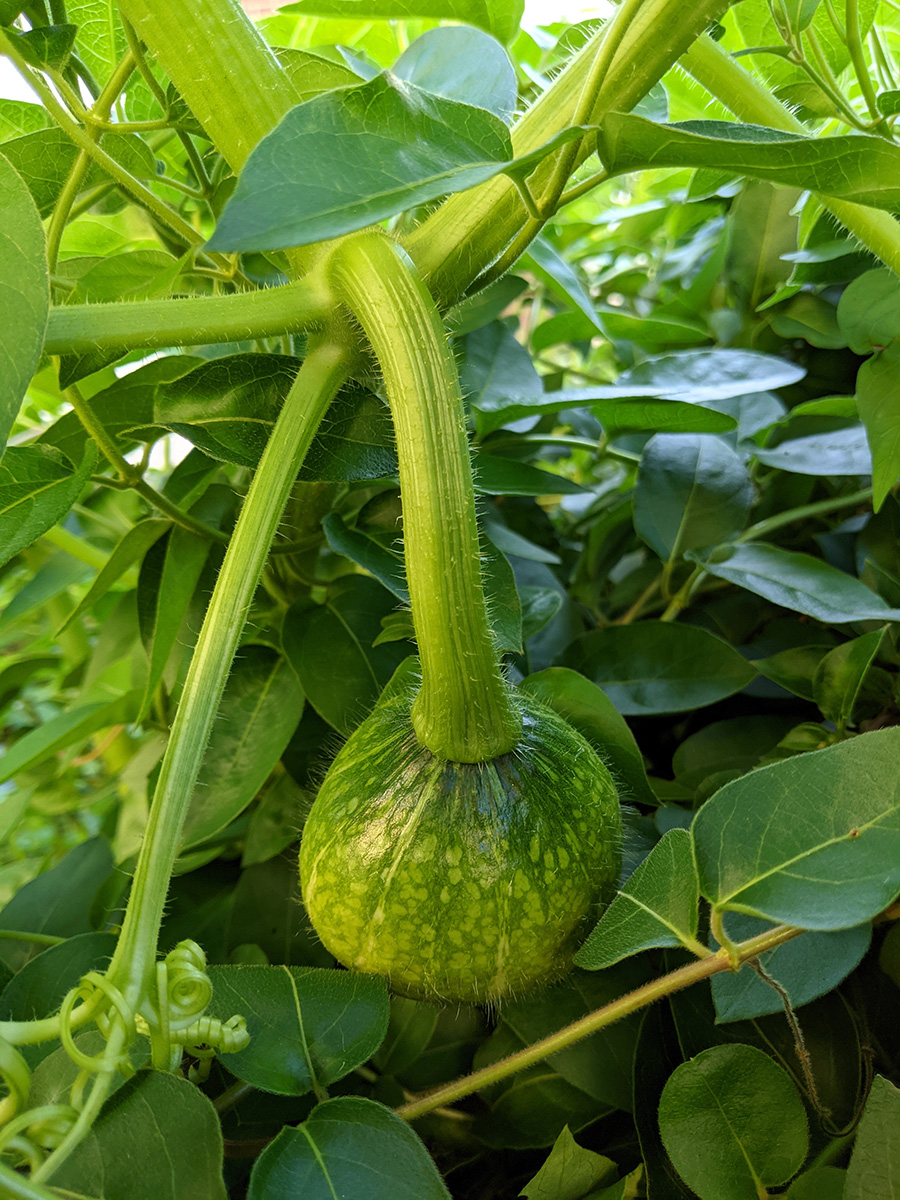 the front garden squash that's growing onto the honeysuckle vines has managed to produce 3 squashes. we only saw 2 but one of them was surprisingly small, until we realized that's actually the 3rd squash and the 2nd squash got so heavy it sunk into the honeysuckles, hidden from view. i also found some vine borer eggs, seems kind of late in the season for them to be still flying around. as for the single squash growing in the western bed, it's managed to grow a large squash with a very flat top, and a second squash. it's also the plant that had borer damage in one of the vines. i treated it but the vine died anyway; fortunately it just a side vine with no squash fruit.