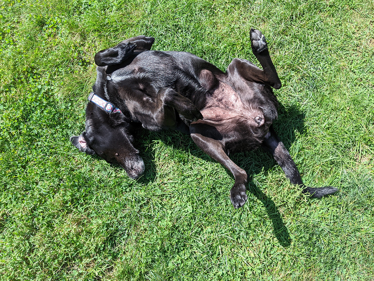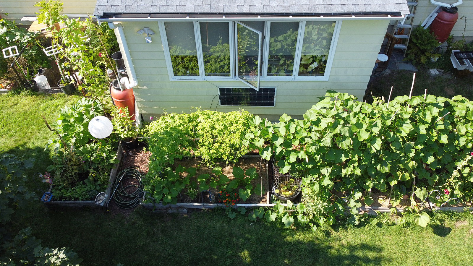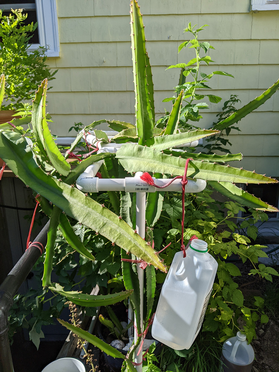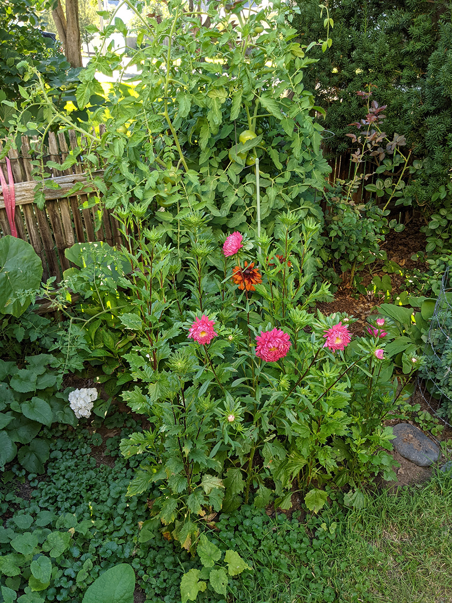the front garden squash that's growing onto the honeysuckle vines has managed to produce 3 squashes. we only saw 2 but one of them was surprisingly small, until we realized that's actually the 3rd squash and the 2nd squash got so heavy it sunk into the honeysuckles, hidden from view. i also found some vine borer eggs, seems kind of late in the season for them to be still flying around. as for the single squash growing in the western bed, it's managed to grow a large squash with a very flat top, and a second squash. it's also the plant that had borer damage in one of the vines. i treated it but the vine died anyway; fortunately it just a side vine with no squash fruit.