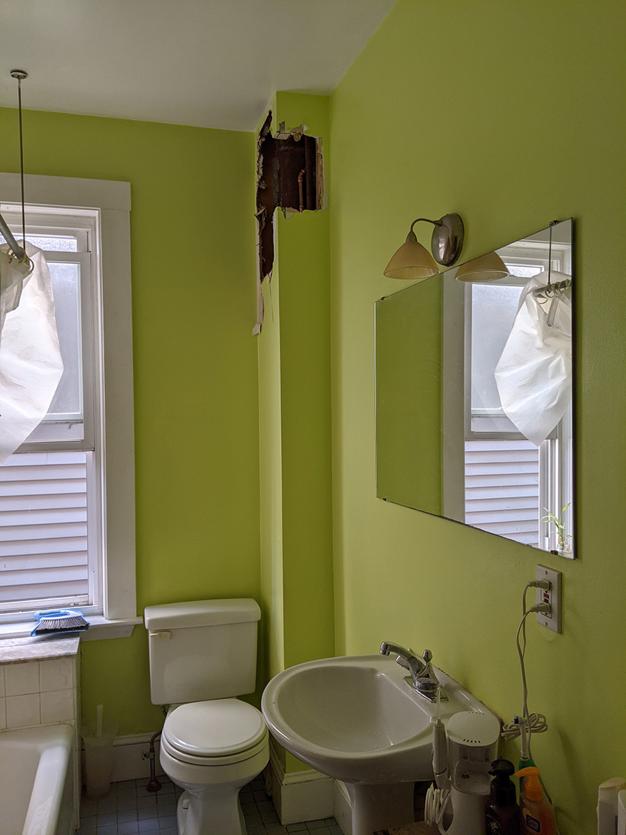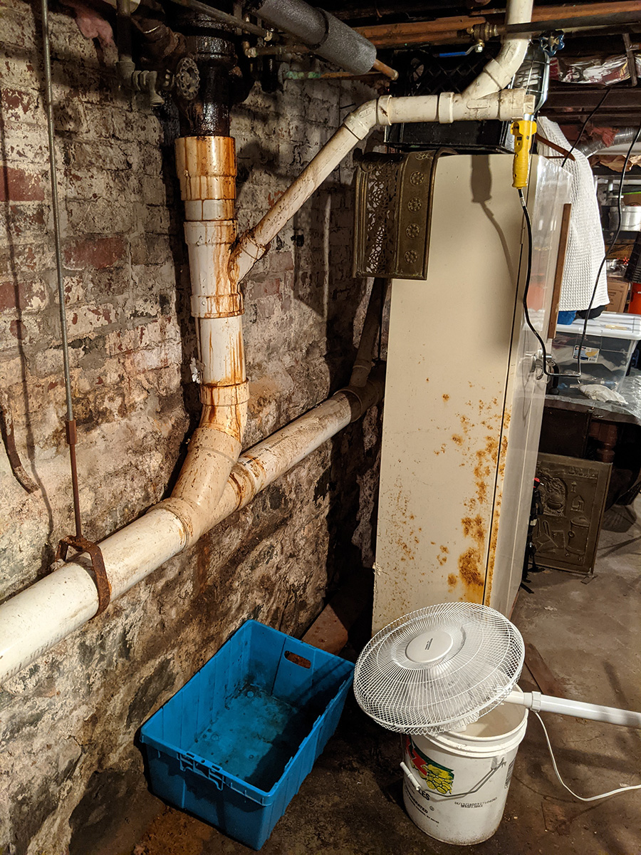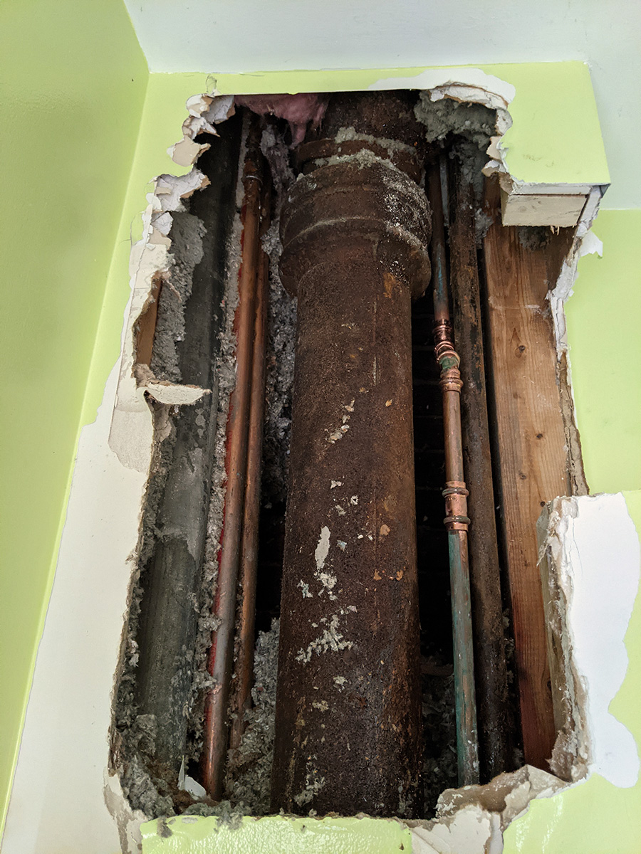 pat told me a told a lot of old houses didn't used to have indoor plumbing, so they simply updated old homes by bundling all the pipes together in one place for the multiple floors. inside the hole i saw the chimney stack, the cold water intake, the large cast-iron septic, the hot water intake, and the gas line. that's why there's a "box" in my bathroom and steve's bathroom, instead of having the plumbing inside the walls.