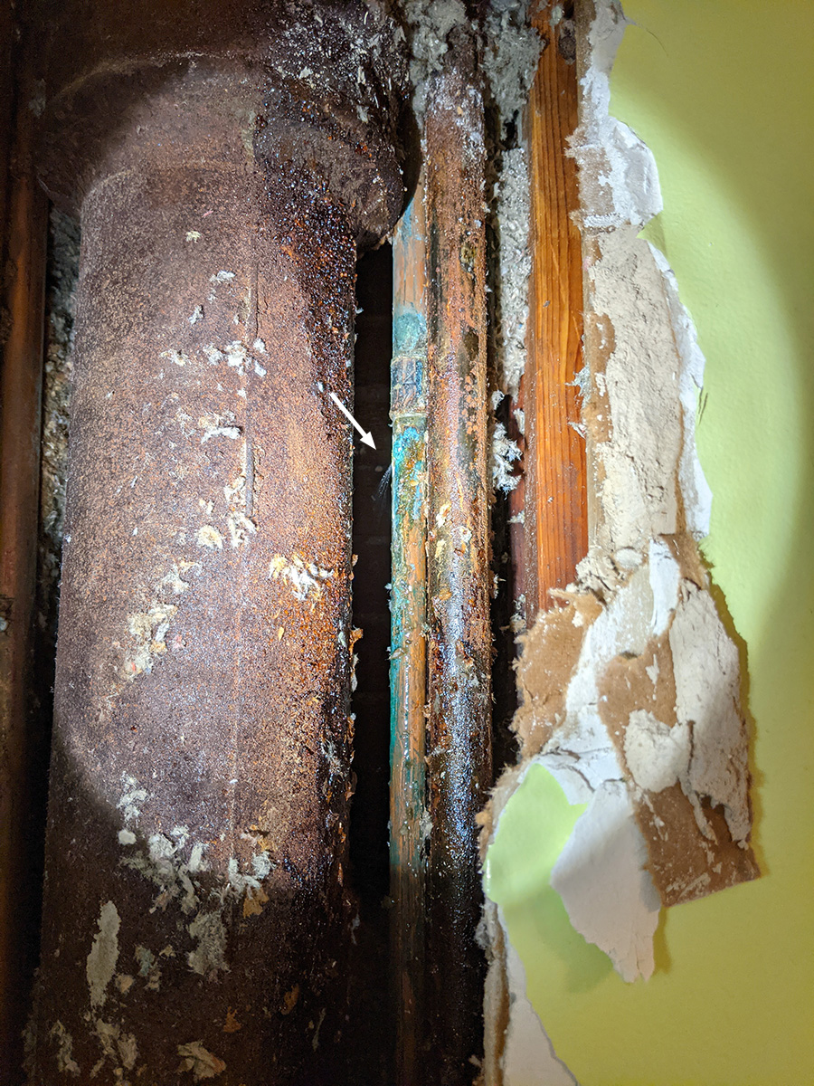 the problem was fairly routine, but how to fix it was a different story. the pipes were too close together and the space was too confined to attempt to solder. the only way was to crimp the pipes together after the leaking segment was removed. to do that, pat had to cut through a 2x4 support column on the corner to make more space. at one point the copper pipe got stuff and i had to run into the basement to wiggle it free. he'd already crimped it before i could ask him to move the pipe up by an inch.