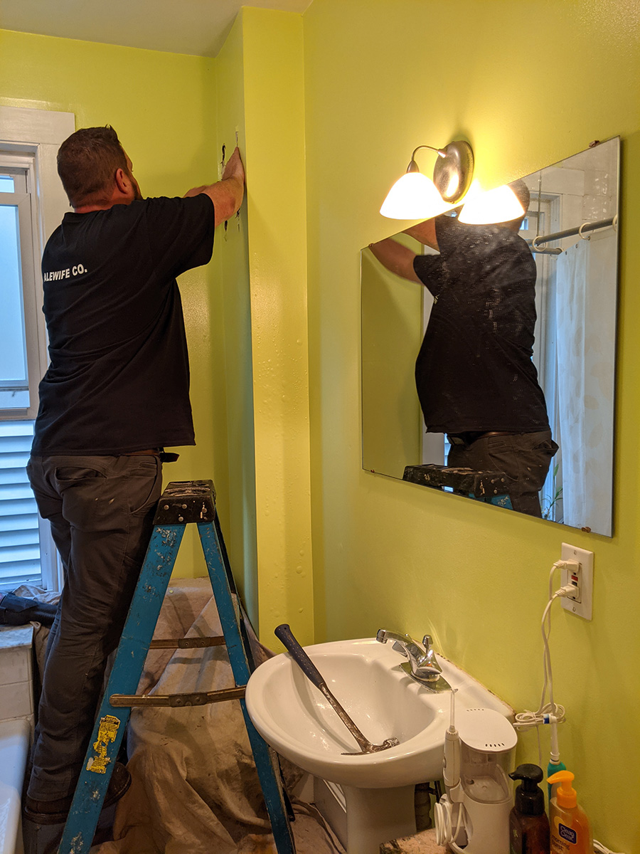 we went back downstairs to my bathroom to start working. after turning off the water main (and warning david upstairs, he was actually running the dishwasher despite knowing that a plumber was in the house), pat climbing onto a stepladder and started knocking out a hole in my bathroom wall using a hammer, like it was just paper (the drywall was already soft from the water damage). crumbled pieces of drywall, wet pulp insulation, and pink fiberglass insulation started to come out, falling onto the tarp pat had draped on top of the toilet. he'd opened up a window into the wall before he spotted what was causing the leak: one of the hot water copper pipe had a small hole and a tiny spray of water was coming out. this could've been going on for a while, but the insulation acted as a sponge to absorb the water so we never noticed a leak. only when the insulation was completely saturated did it finally start leaking into the basement and bubbling the paint on my bathroom wall.