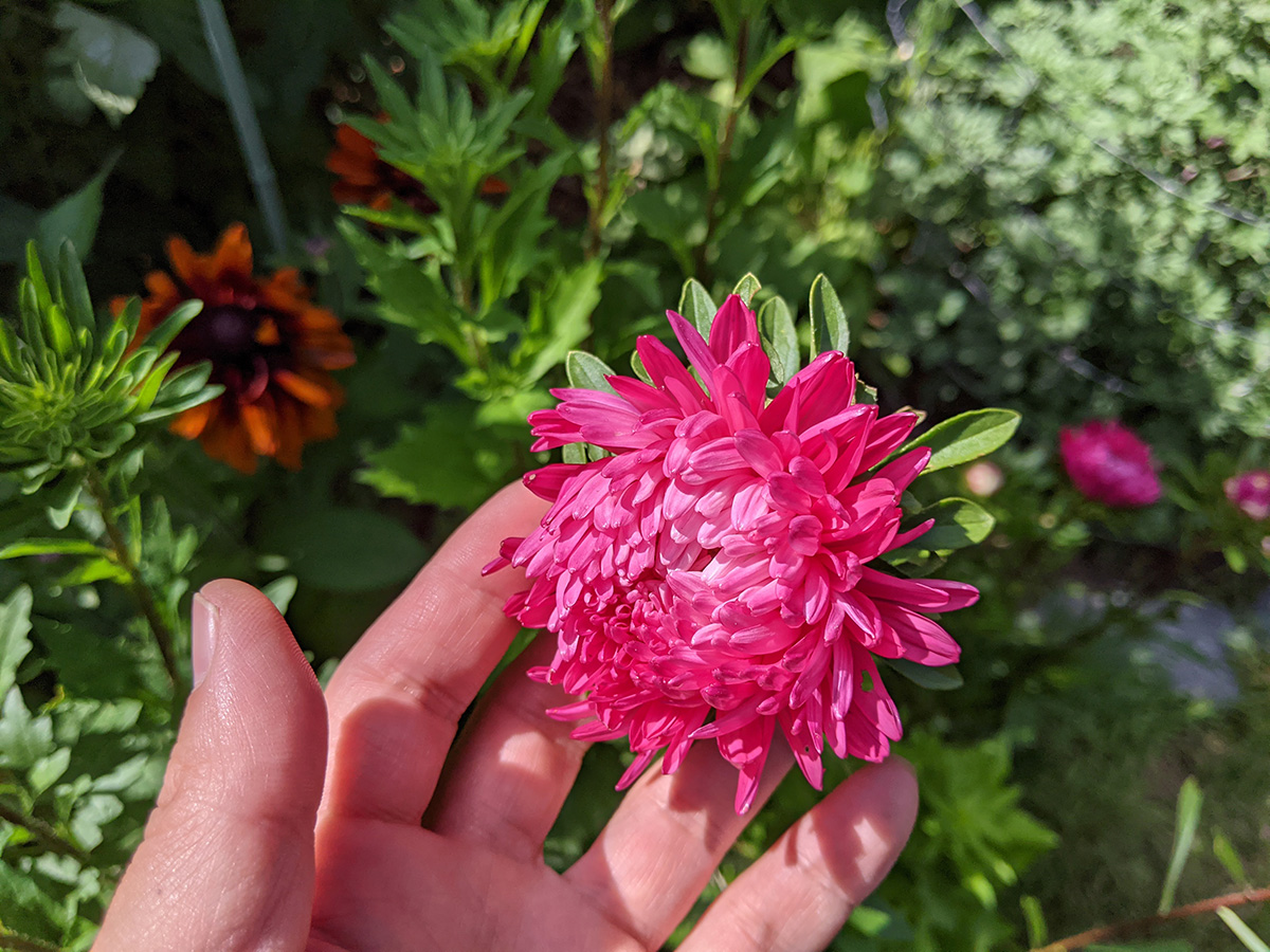 my father put some deck screws on the back of our wooden plant stand to use as hooks. we should've done this a long time ago, give our tools a place to live outside instead of just roaming around the backyard.