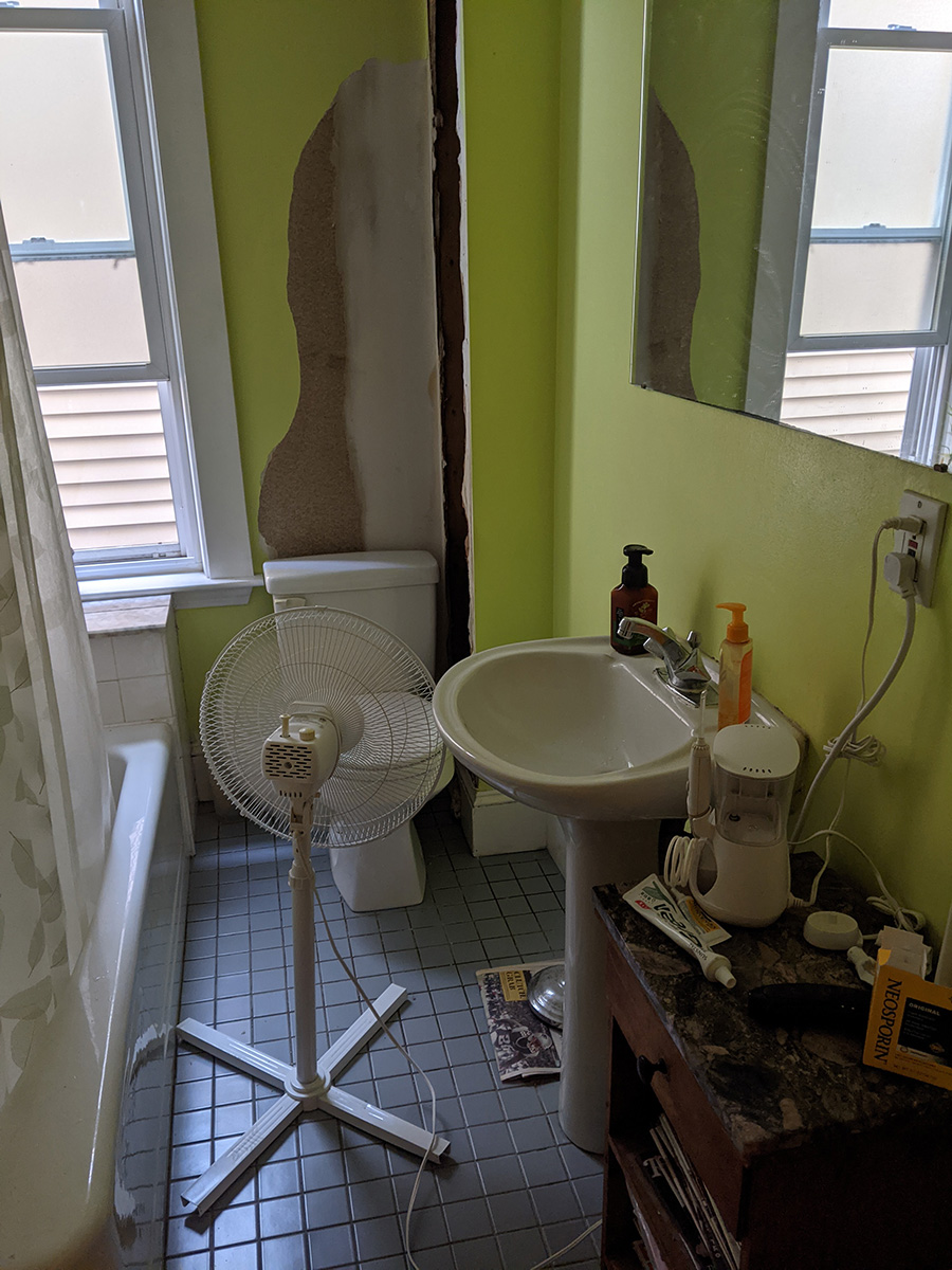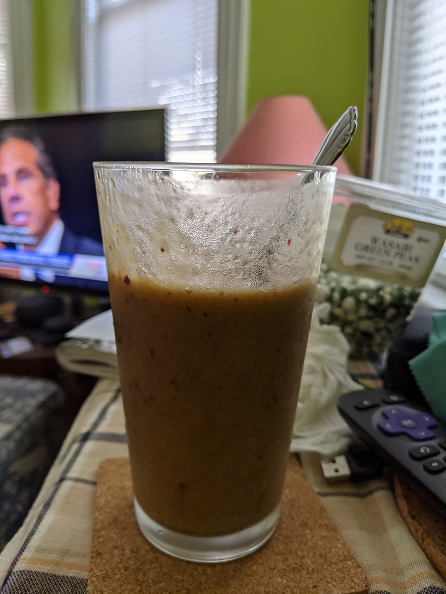 in the morning i set up the oscillating fan in the bathroom after i was done with it to continue drying out the hole in my wall. i made a smoothie for lunch - frozen fruit, banana, fruit juice - but i also added a bit of ginger and a teaspoon of matcha powder. the green matcha powder turned the otherwise pink smoothie into a brown mess. tastewise it wasn't bad though, i could taste the pieces of ginger, though not so much the matcha, other than the color.