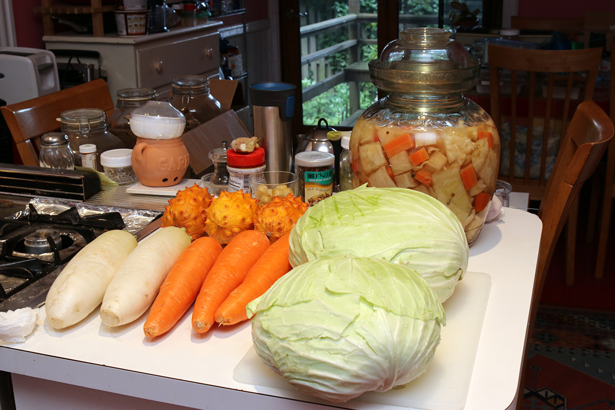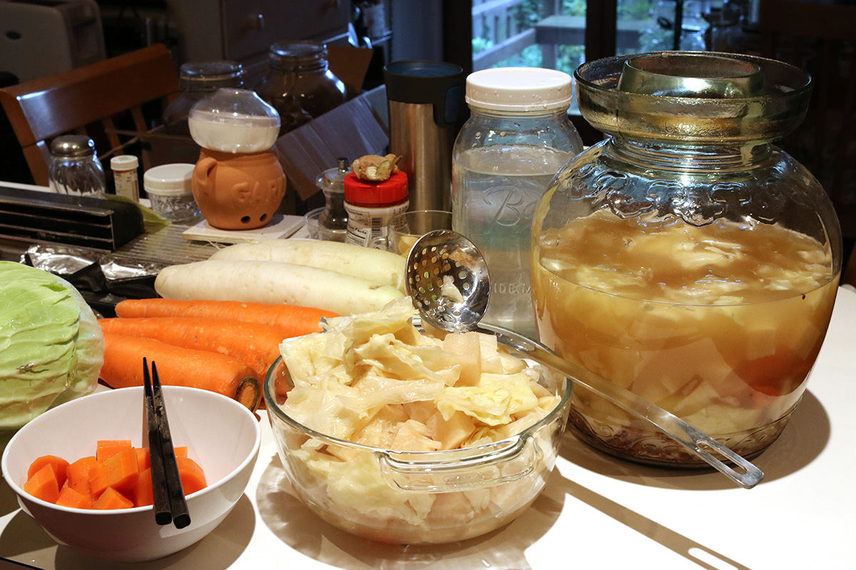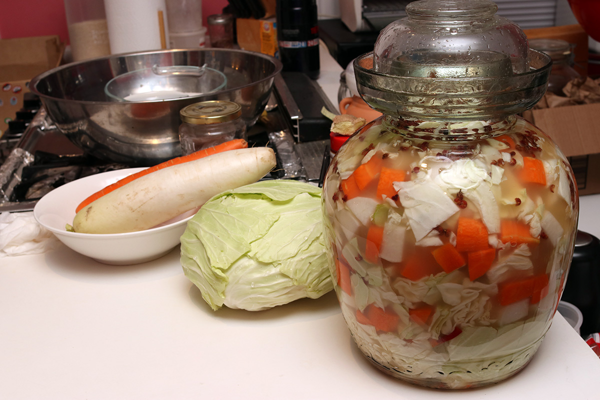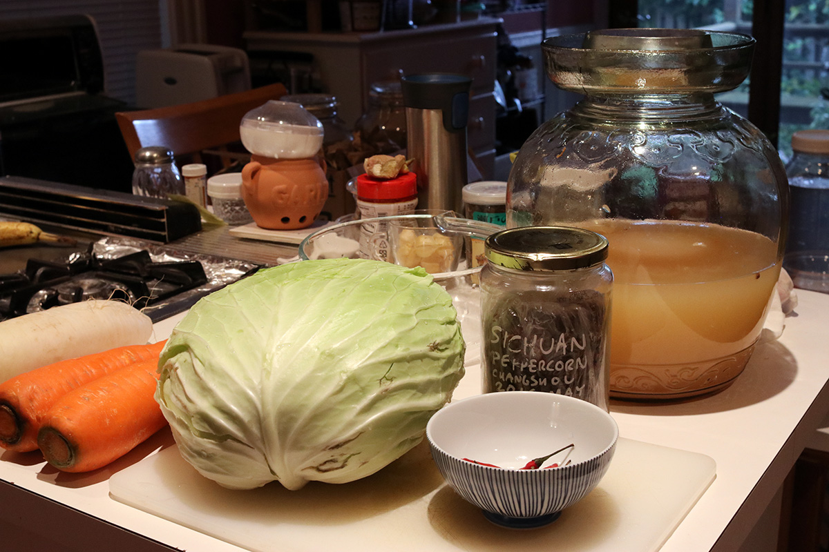 once i finished, i still had a leftover cabbage, carrot, and daikon. i'll probably start a fresh jar of sichuan paocai in a fido jar.