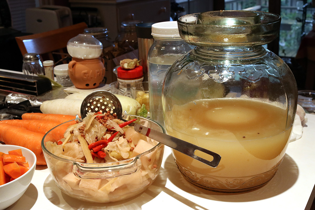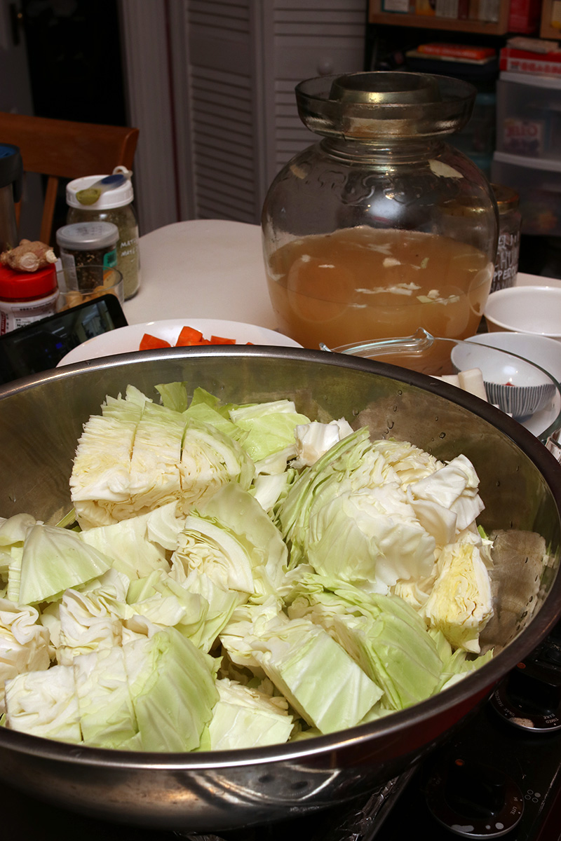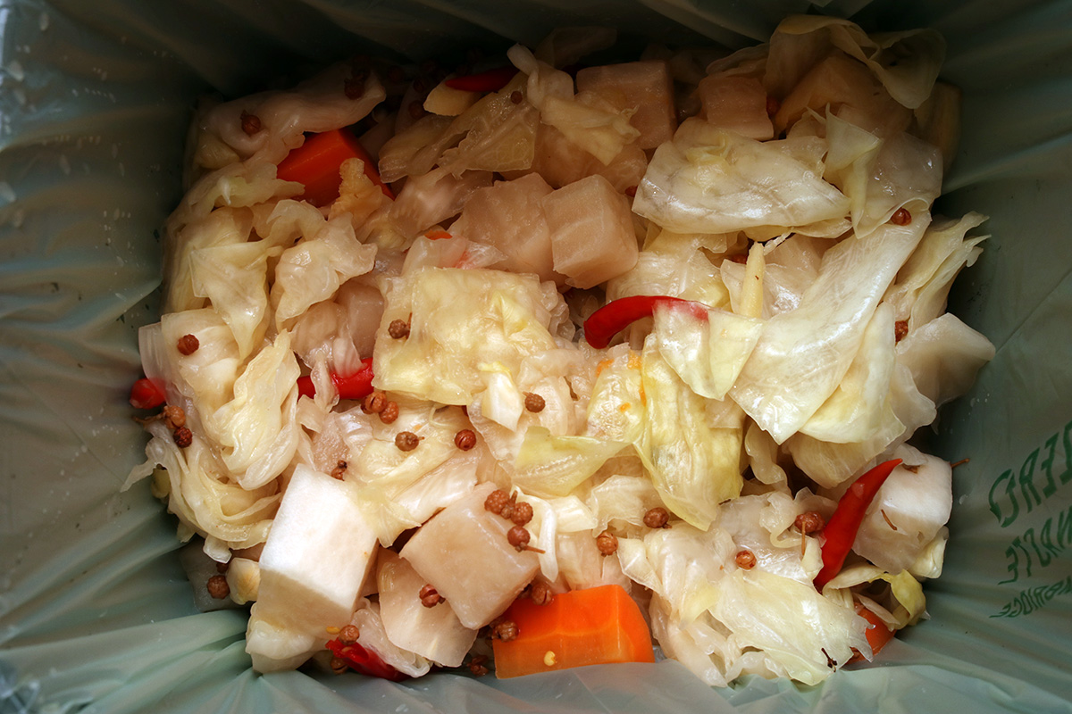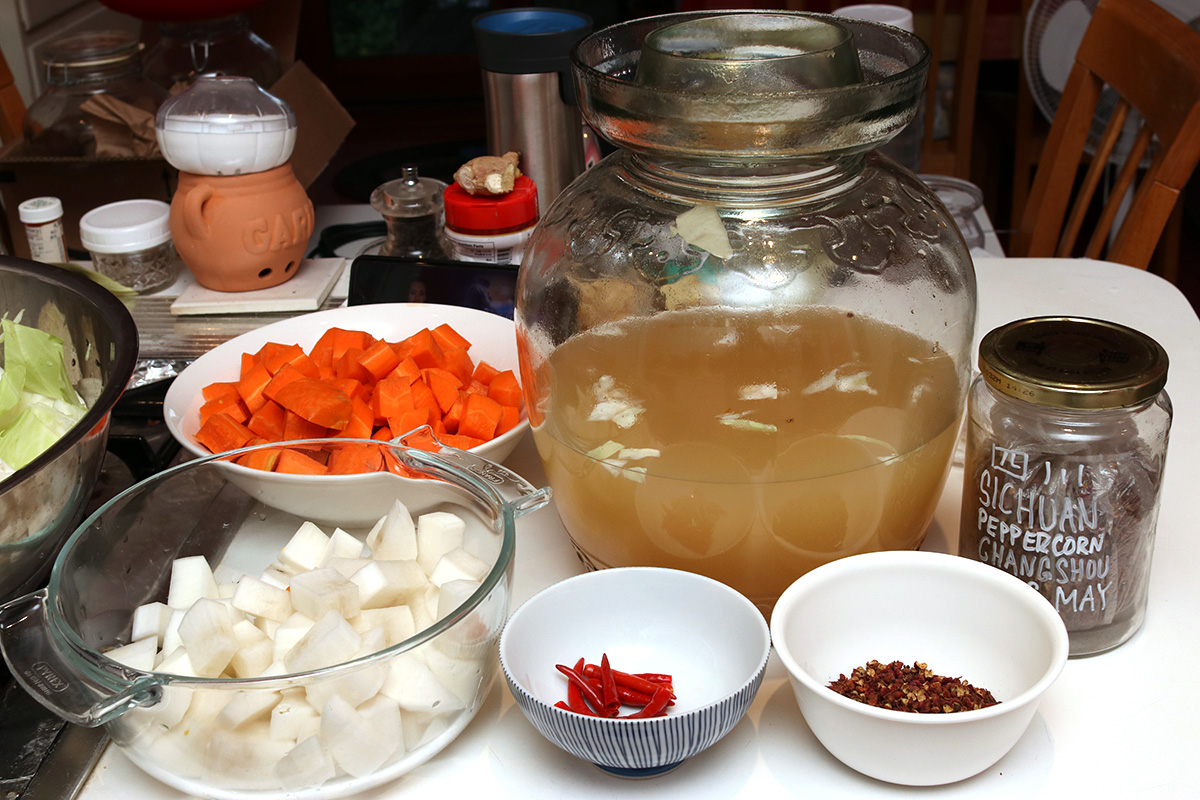 around 5pm i started making a new batch of sichuan paocai. the one that i currently have have gotten so old (i filled the jar back in late january, 7+ months ago) that the cabbage and radish have turned soft (they should be crispy). the carrots however were still firm. with sichuan paocai you reuse the liquids since they contain flavors and fermenting bacteria. i started by scooping out the old fermented vegetables. it was easy to do using my newly acquired stainless-steel straining ladle. i ended up having to scoop in two batches, saving the carrots since they're still edible. originally i was just going to toss out the old vegetables, but decided i could recycle it in the compost bucket. i ended up scooping everything, including old peppercorns and chili peppers.