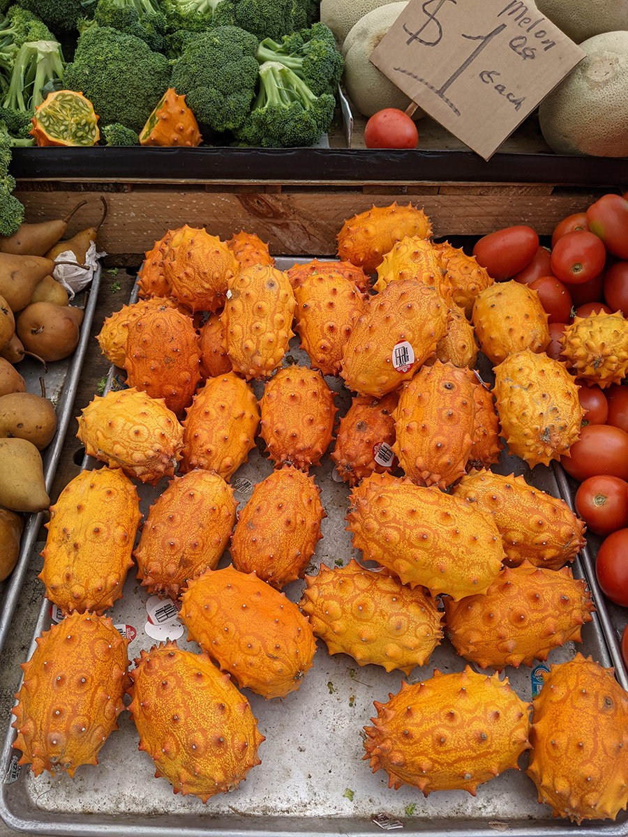 i stocked up on rainier cherries, which were at rock bottom prices, probably the last time i'll have cherries this season. i got the kind that came in a plastic box (2 for $3), they seemed to be in better condition, i ended up getting 5 total. i also got some mini cukes at $1/lbs. before i left, i saw a vendor selling kiwano melons AKA horned melons. probably the first time i've ever seen a horned melon was at a fancy fruit stand at the shanghai airport back in 2006. i'd never seen anything like it. i've always wanted to try one, but they were usually too expensive - $6-7 a melon. so when i saw they were just $1 each, i bought 3 to try out.
