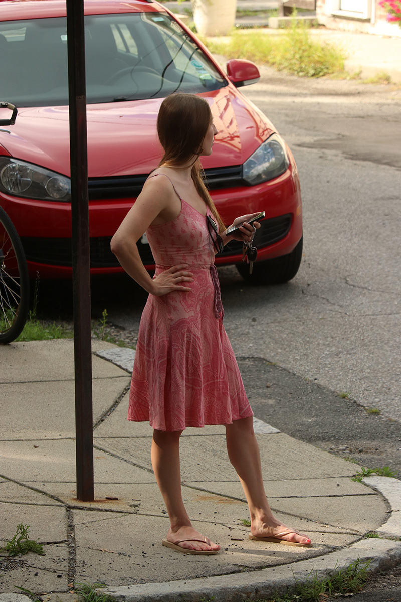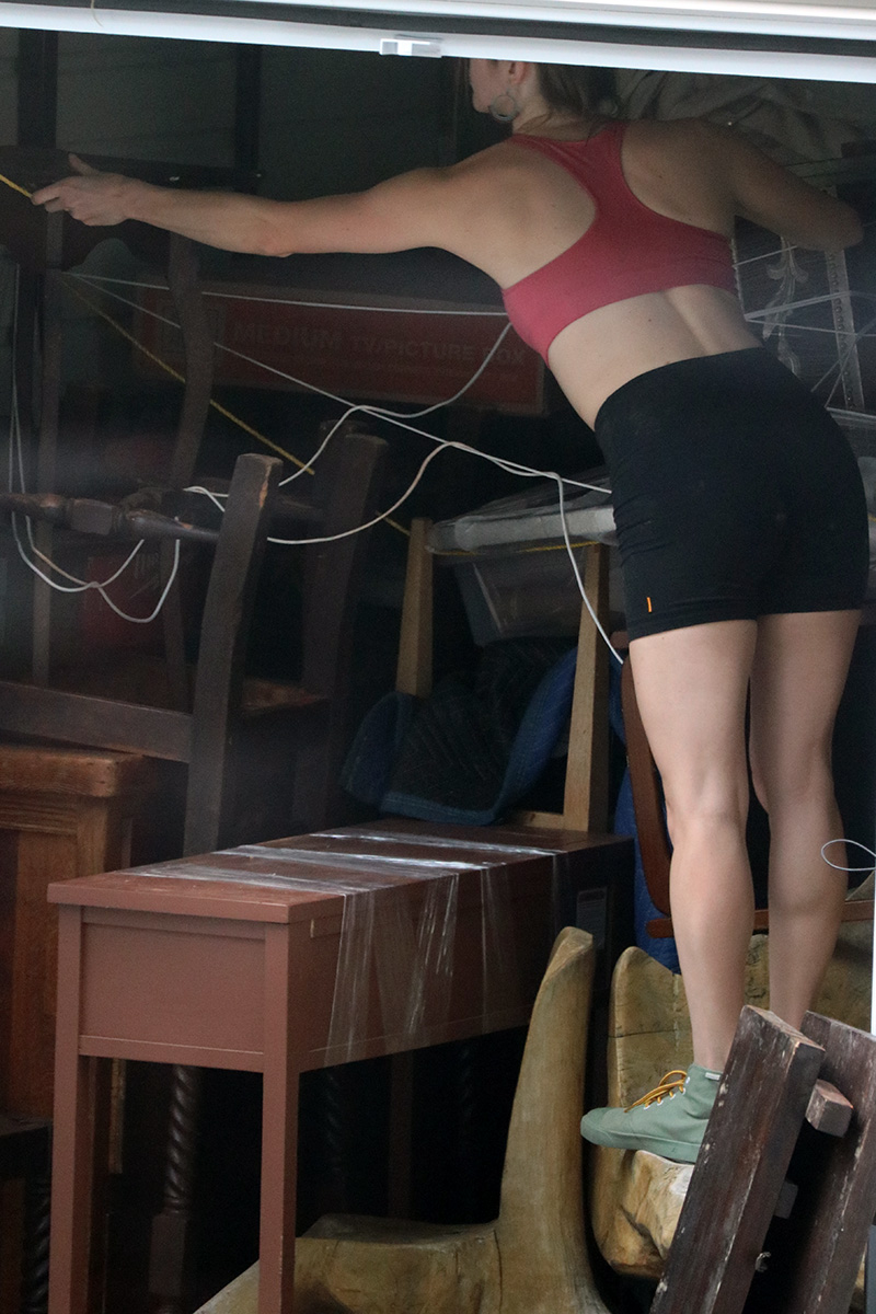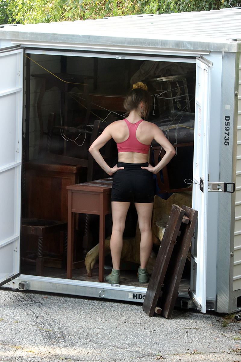 i watched as my new neighbor had a shipping crate delivered. at first they were going to park it on the curb, but for some reason that wasn't possible, so the delivery guy dropped it in her shared parking lot, which should've been the original plan. later she came out in a moving outfit to examine her stuff, make sure nothing was damaged during transit.
