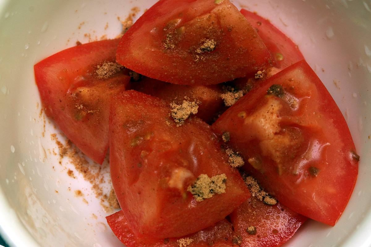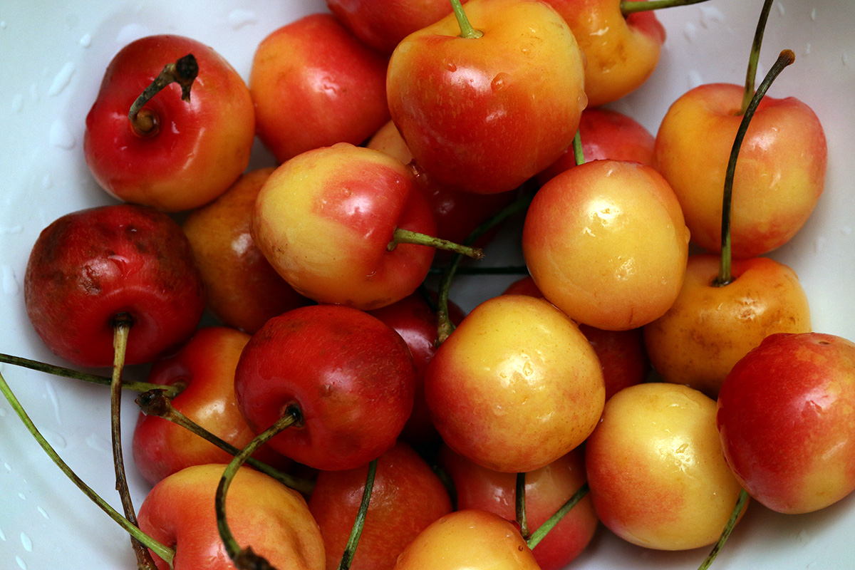 for dinner i used up the last of my peppered ham to make a sandwich. i cut up a leftover tomato and sprinkled some sour plum powder. i also ate half a box of rainier cherries.