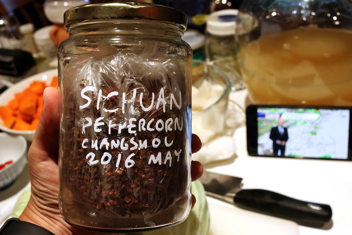 next i started chopping up my ingredients. unfortunately i forgot to weigh them, but it was one large chinese cabbage, 2 large carrots, and 1 large daikon radish. after chopping everything up, only then did i start filling up the paocai jar: a layer of cabbage, followed by a layer of cubed carrots and radishes, sprinkled with some hot chili peppers and a good amount of peppercorn. i managed to do a second layer before i filled up the jar. i've found that the previous paocai didn't have enough peppercorn flavor, so i made sure to add plenty this time around. the volume of vegetables was just perfect that i had none left over, and the liquids came up and filled the jar, so i didn't need to add any additional brine. i didn't add any baijiu (my thinking is once i have active leftover fermented juices, the alcohol would just kill them) and i forgot to add the rock sugar to balance out the salty-spicy-sour taste. i figured i could always add the sugar later if the flavor wasn't right.