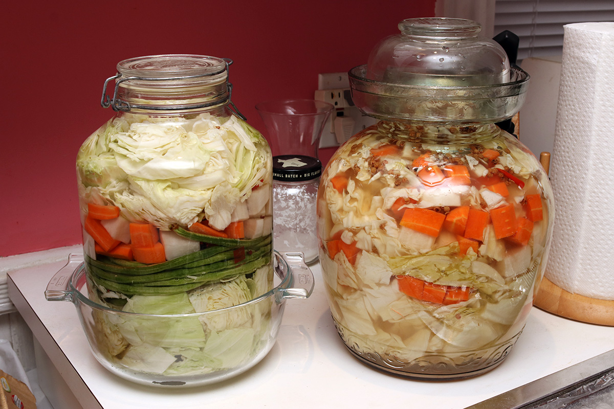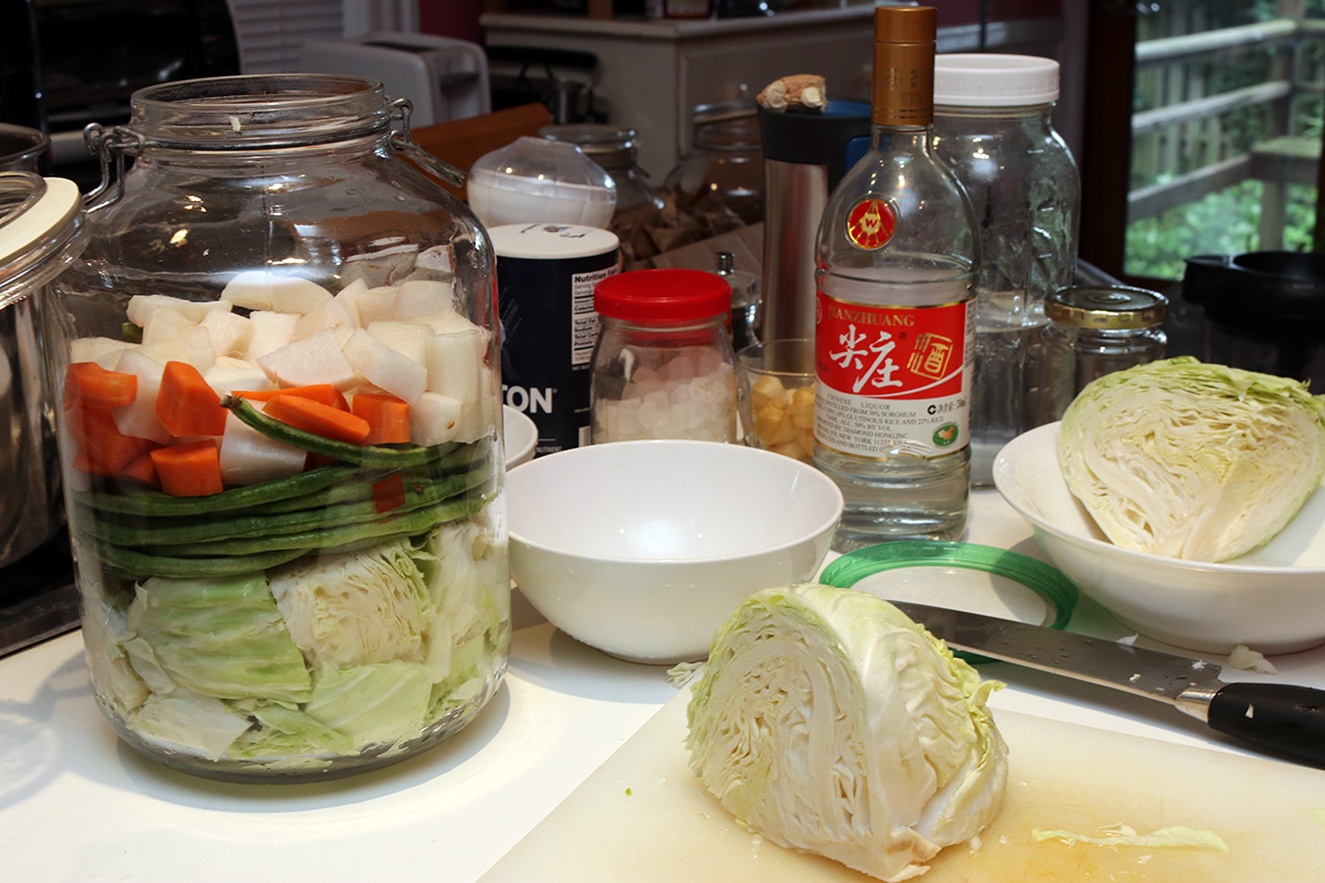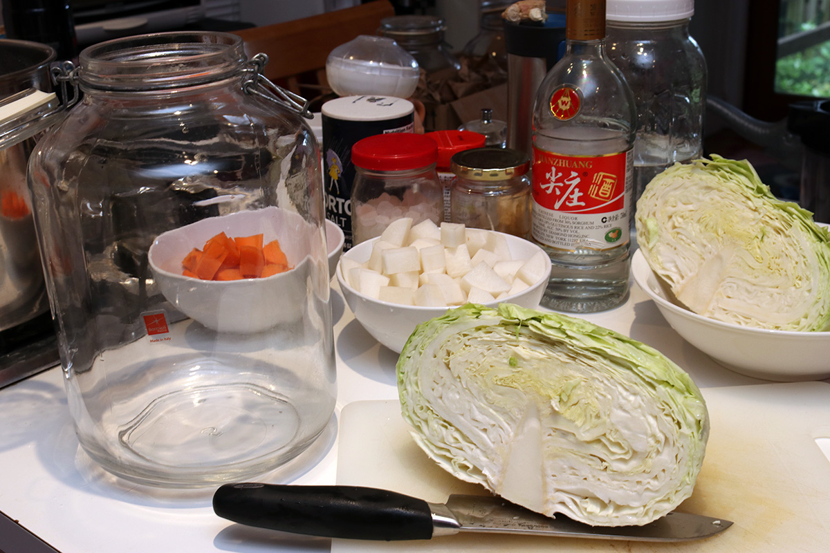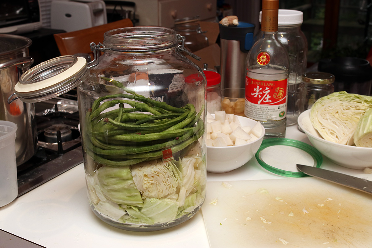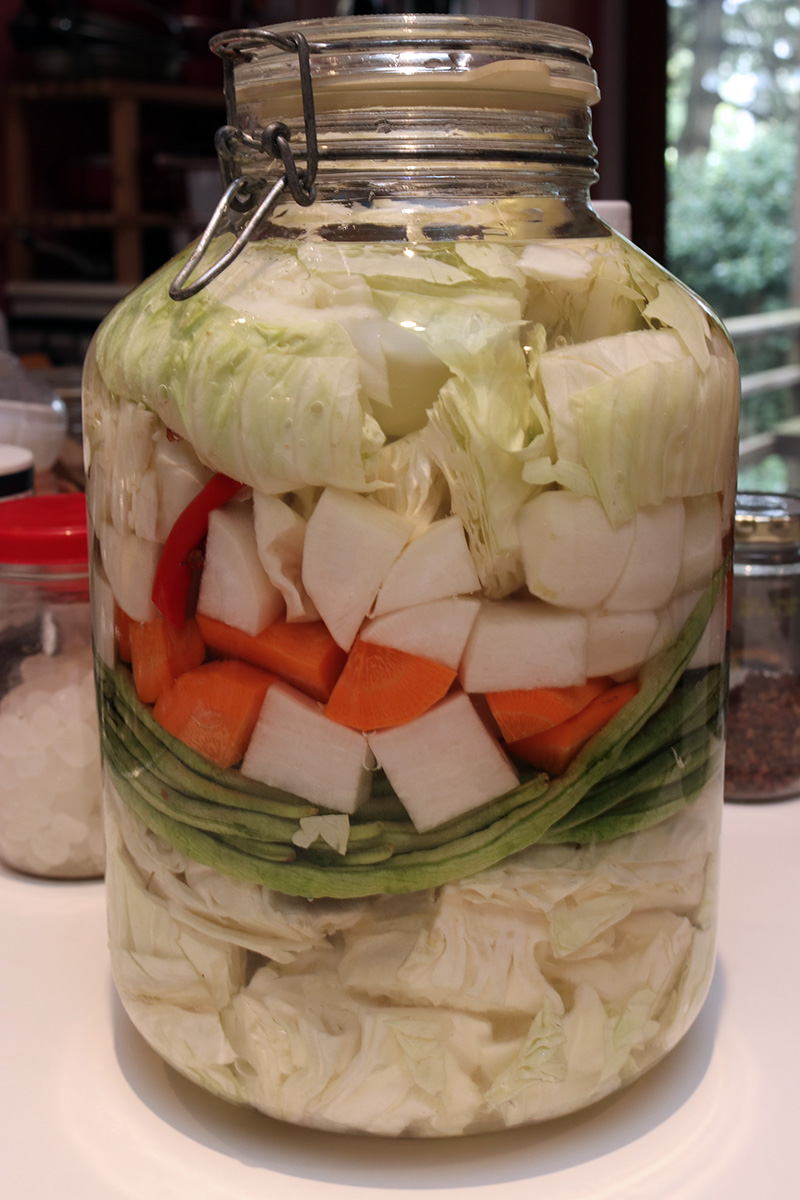 after lunch i started making my second jar of sichuan paocai. this was a fresh patch, using a 5L fido jar, which is what i used to use before i got an authentic sichuan paocai jar.