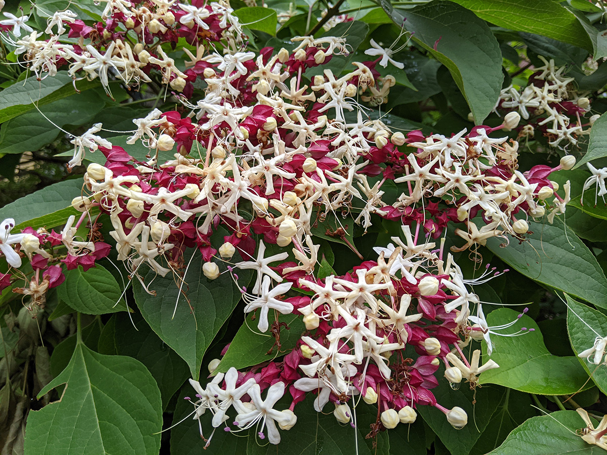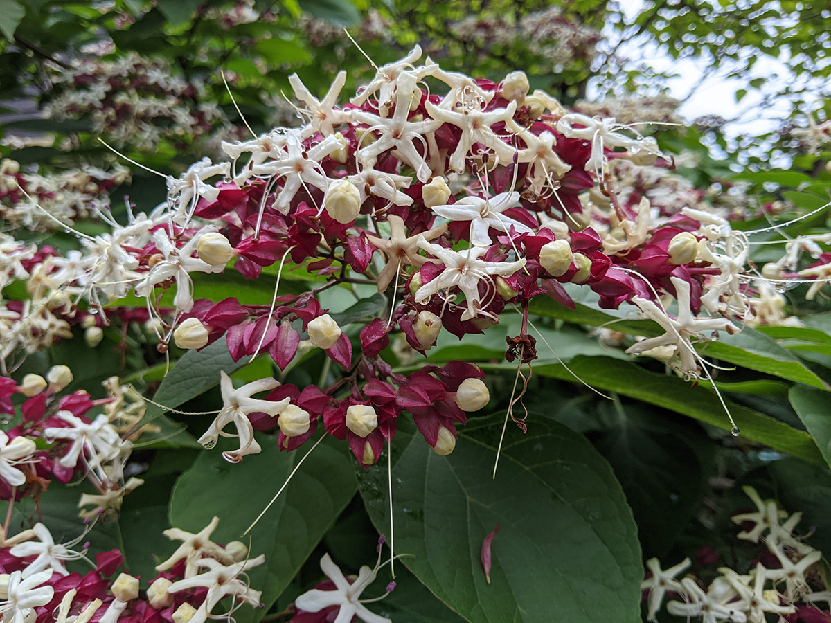 i biked to market basket in the late morning to get some groceries. the two tires felt a little flat so i pumped them up before i left (75psi). i stopped to admire the harlequin glorybower bush on ivaloo street, now blooming. it's a name i have a hard time remembering. supposedly they're only hardy up to zone 7, but they seem to be doing fine here, in a shady northeast facing location.
