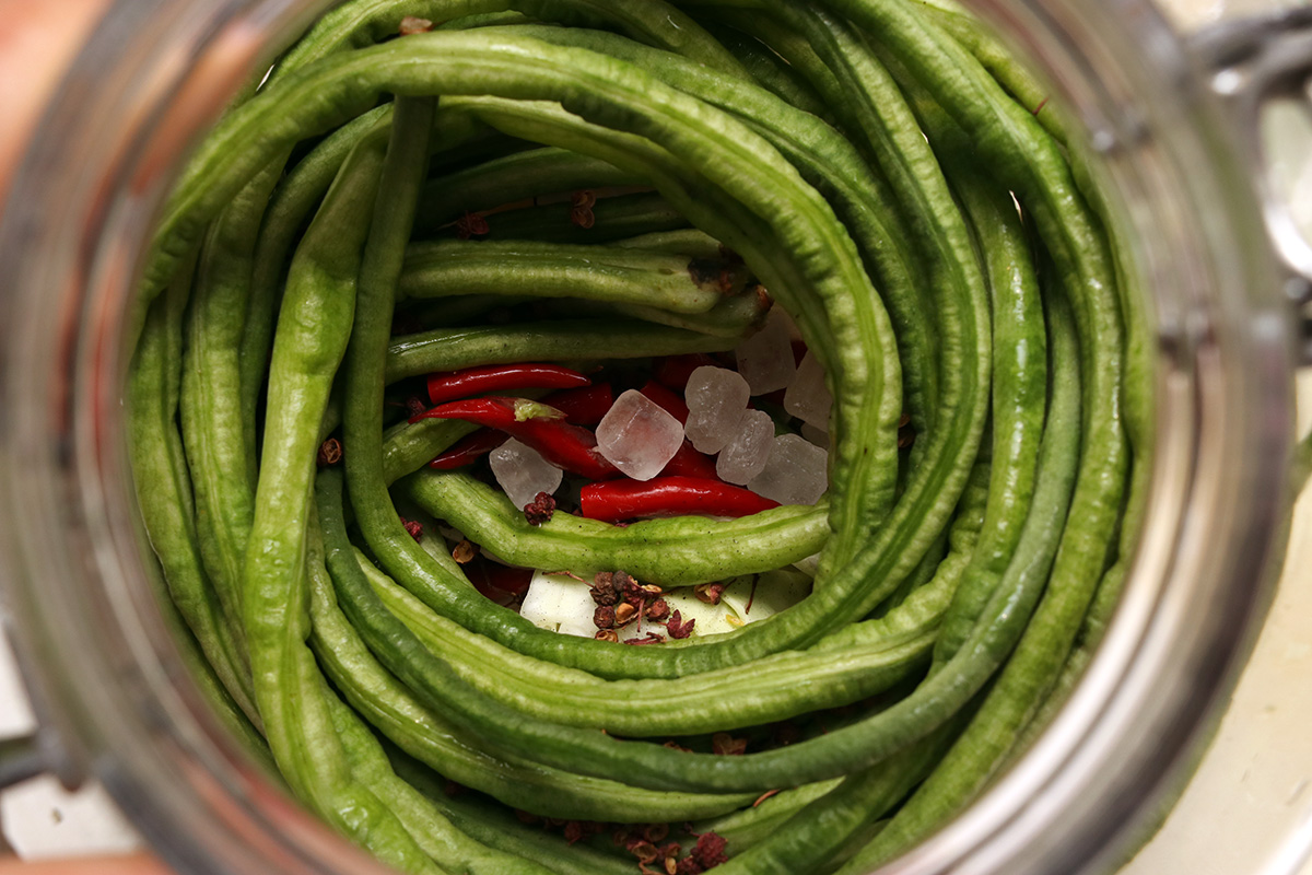 as regards to brine portions, i followed the recipe of one of the last times i made fido jar paocai, which is 9 cups of water to 3 oz. of salt (ratio: 3 cups water to 1 oz. salt). i made the brine last night using the electric kettle to boil 1.5L of water (equals to about 6 cups) and left it to cool overnight. the star ingredient was of course the homegrown long beans. 12 bundles weight about 0.7 lbs. instead of adding them to the bottle of the jar, i added them in the middle, so they'd be easier to fish out later on. i didn't think all the vegetables would fit but they ended up fitting exactly. i then started scooping the brine into the jar one cup at a time. it ended up using 9 cups exactly. i then added a dash of baijiu before closing up the jar. i put the jar in a container in case it started to leak.