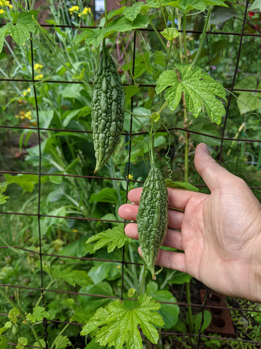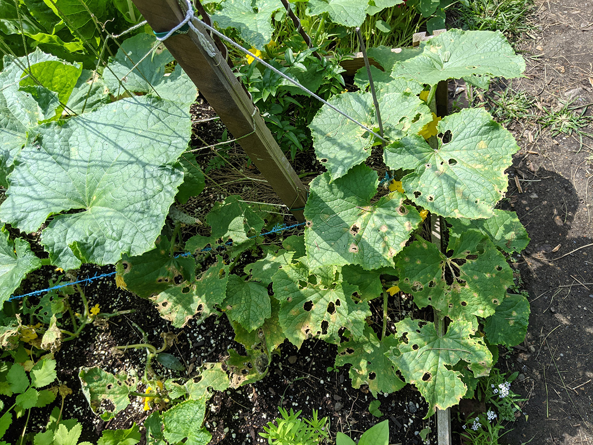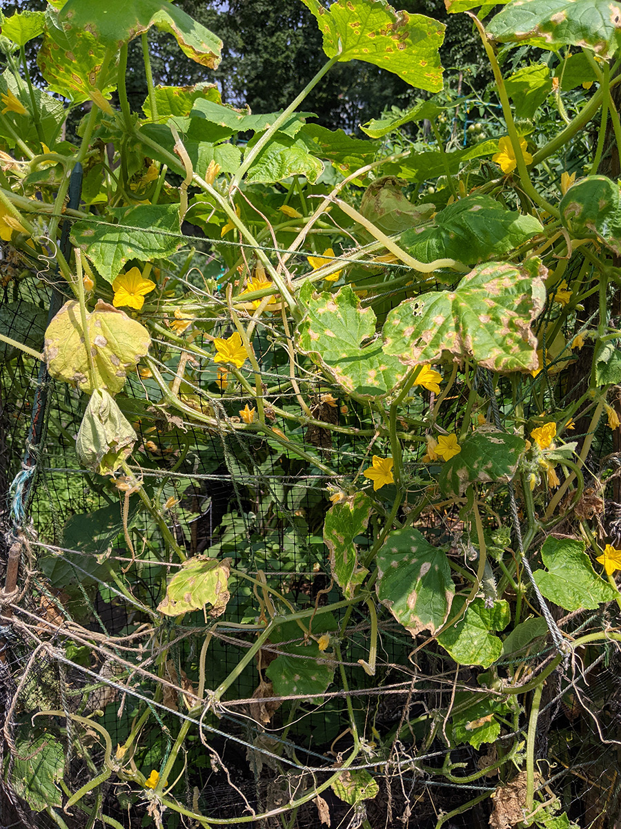 i also took a tour of the other garden plots. this stage of the season, there's a lot of diseases going around, especially in such a densely planted garden. cucumbers pockmarked with bacterial wilt transmitted by cucumber beetles, all tomato plants stricken by various stages of late season blight.