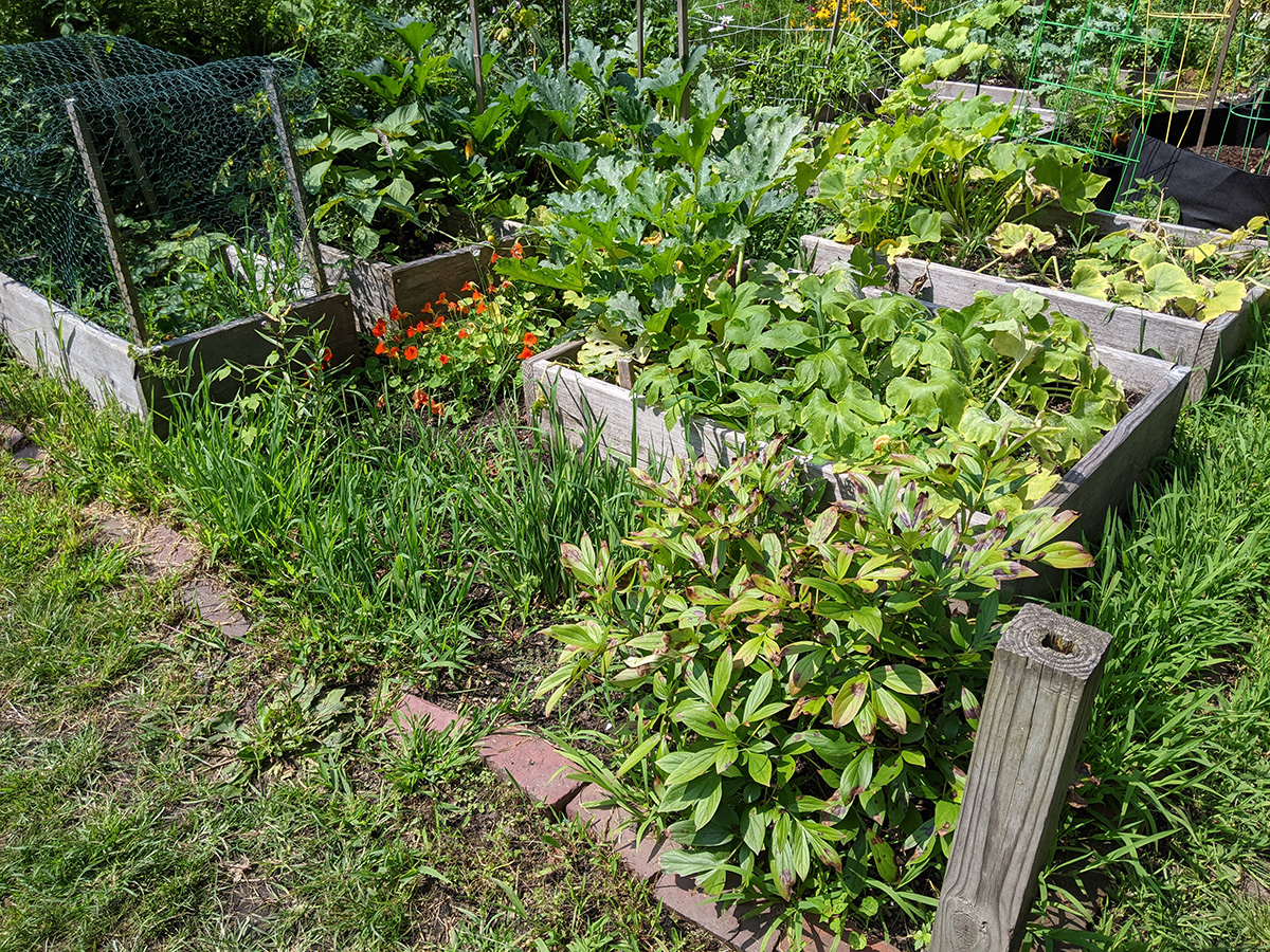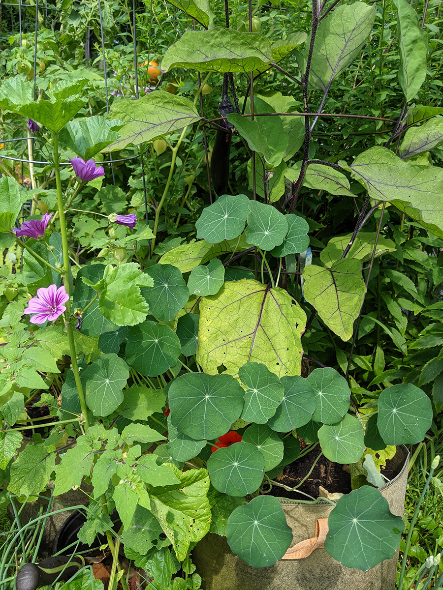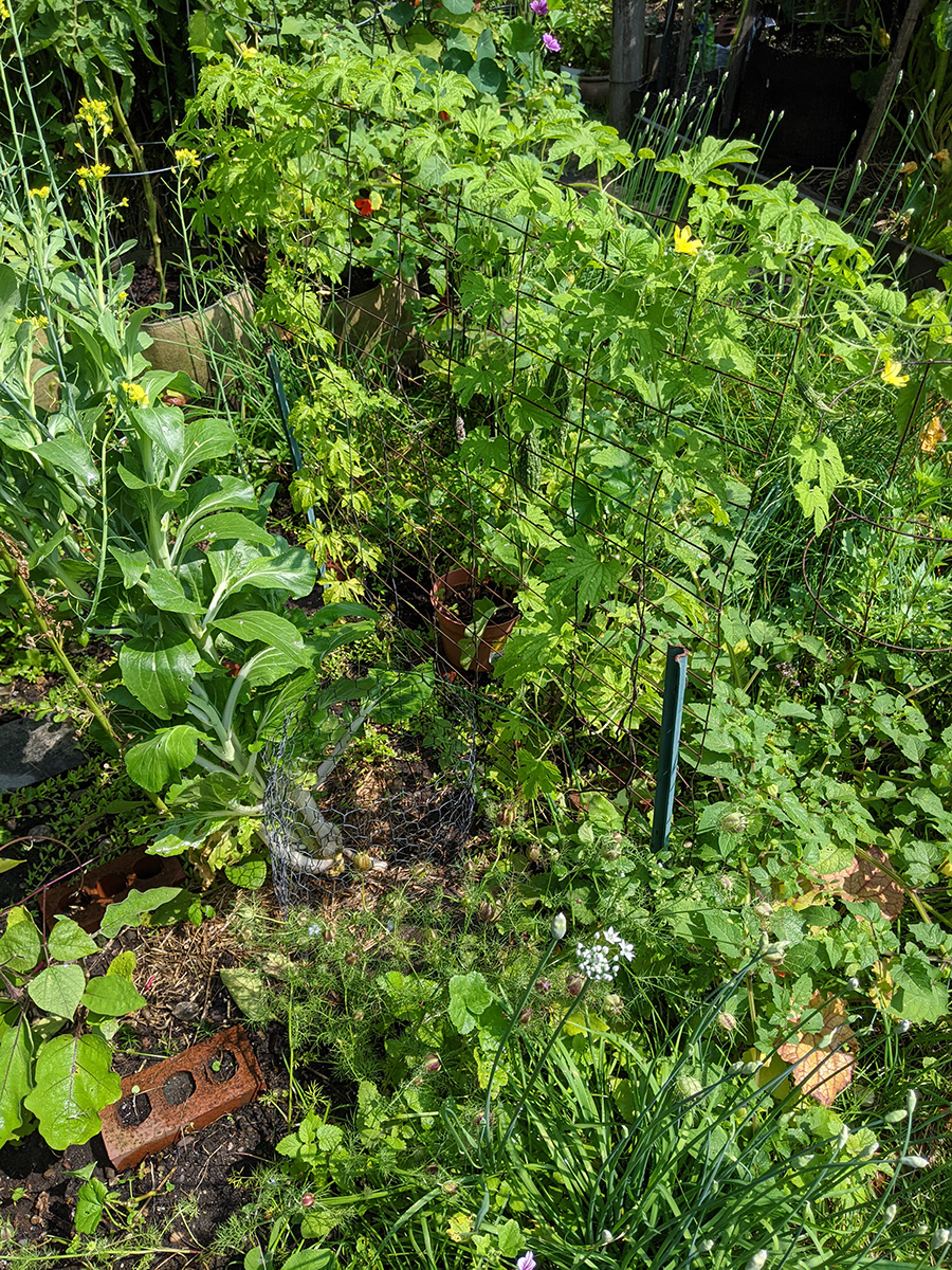 i also took a tour of the other garden plots. this stage of the season, there's a lot of diseases going around, especially in such a densely planted garden. cucumbers pockmarked with bacterial wilt transmitted by cucumber beetles, all tomato plants stricken by various stages of late season blight.