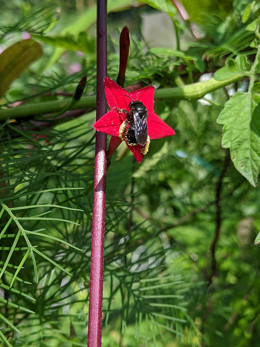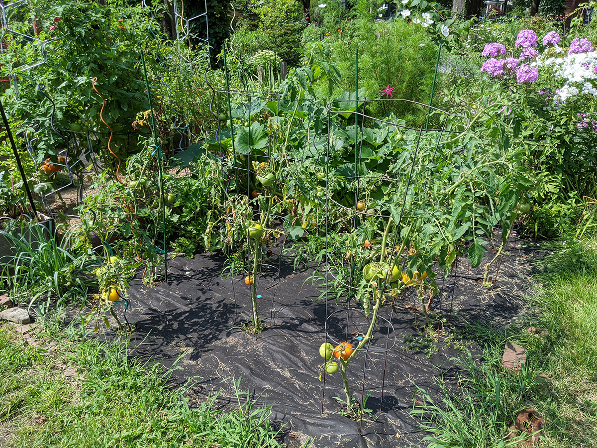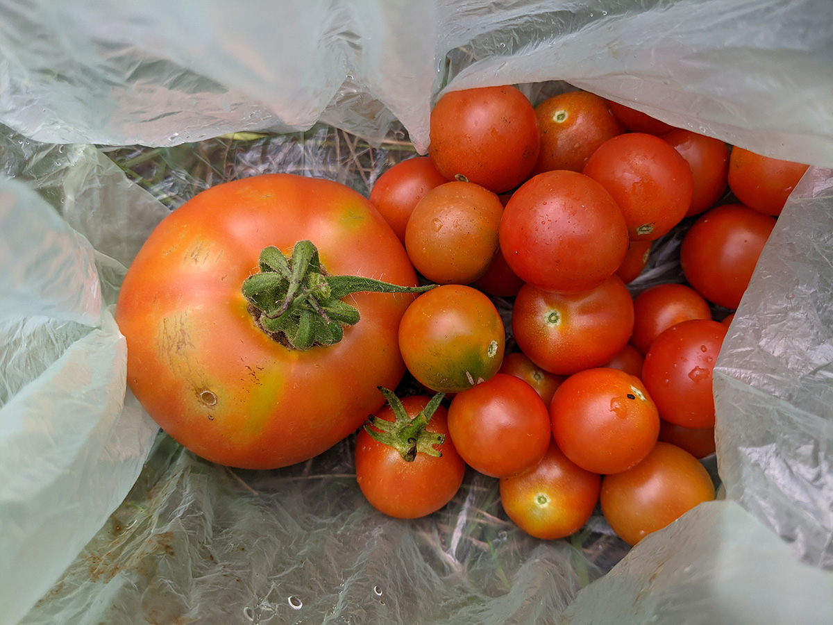 today was the first day of a 3-day august heat wave, so i went down to the community garden this morning to water my plants. i also managed to collect another bag of mostly cherry tomatoes with a single cloudy day tomato.