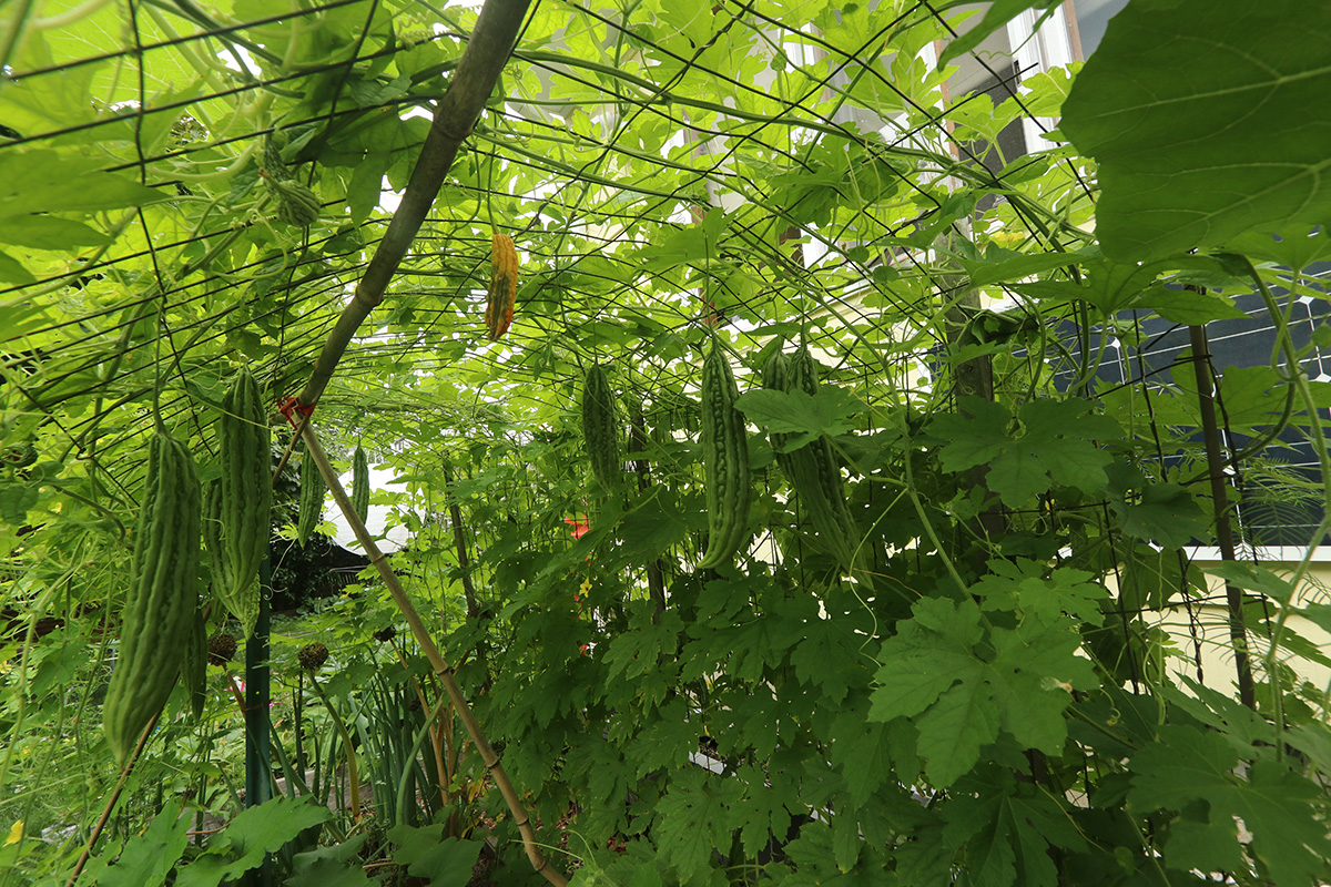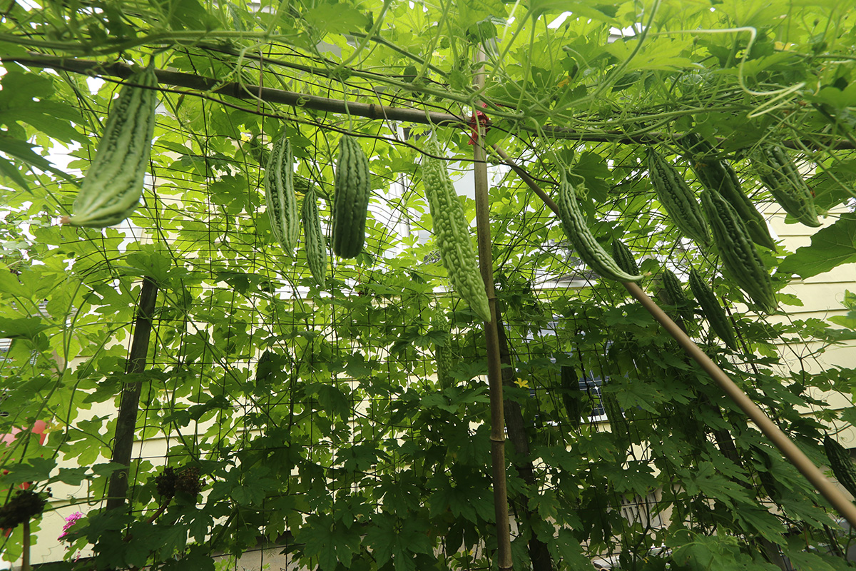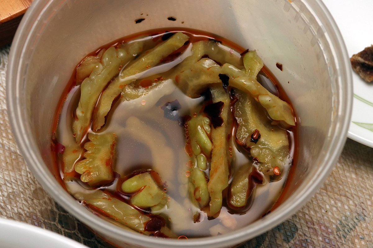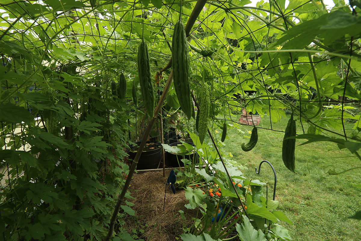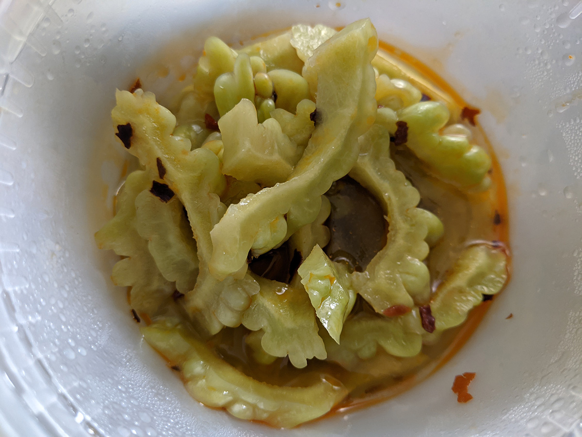 it was too hot to be outside today. i did go out briefly to take some photos of the bitter melons using my wide angle lens. this past week my parents picked off another 3 bitter melons: 2 to give to my 2nd aunt, and one for them to eat. they had some leftovers, crispy raw bitter melons, salted, then blended with sugar, vinegar, and chili oil. i asked my mother why they didn't cook with it, she said with bitter melons so fresh, they're good enough to eat raw, which preserves their crispiness.