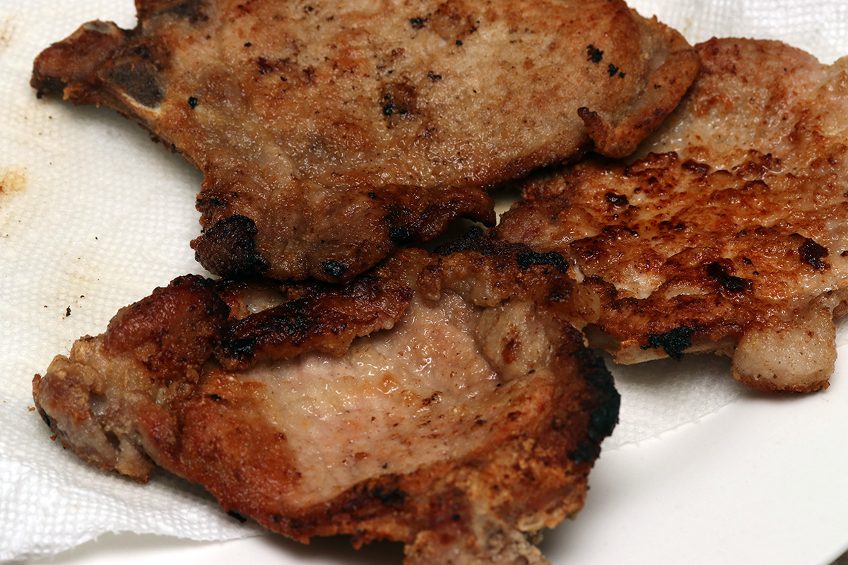 my father fried up some porkchops for dinner, using the technique of sweet potato starch to make the breading extra crispy.