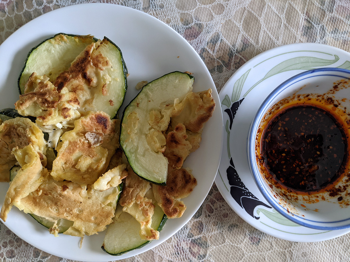 we were finally done close to 1pm. i went inside to enjoy the air conditioning that'd be on full blast since this morning as well as to have some lunch. i had some fried zucchinis and eggs, slathered in that hot chili oil dipping sauce.