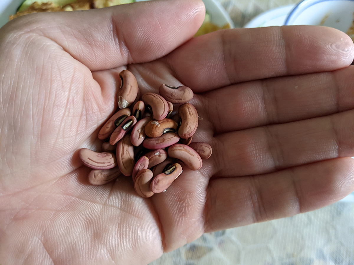 my father collected dried beans from 2 ripened long beans on the vine. they were practically falling out. my father said they taste good dried, but i told him we needed to save the beans for next year's plantings.