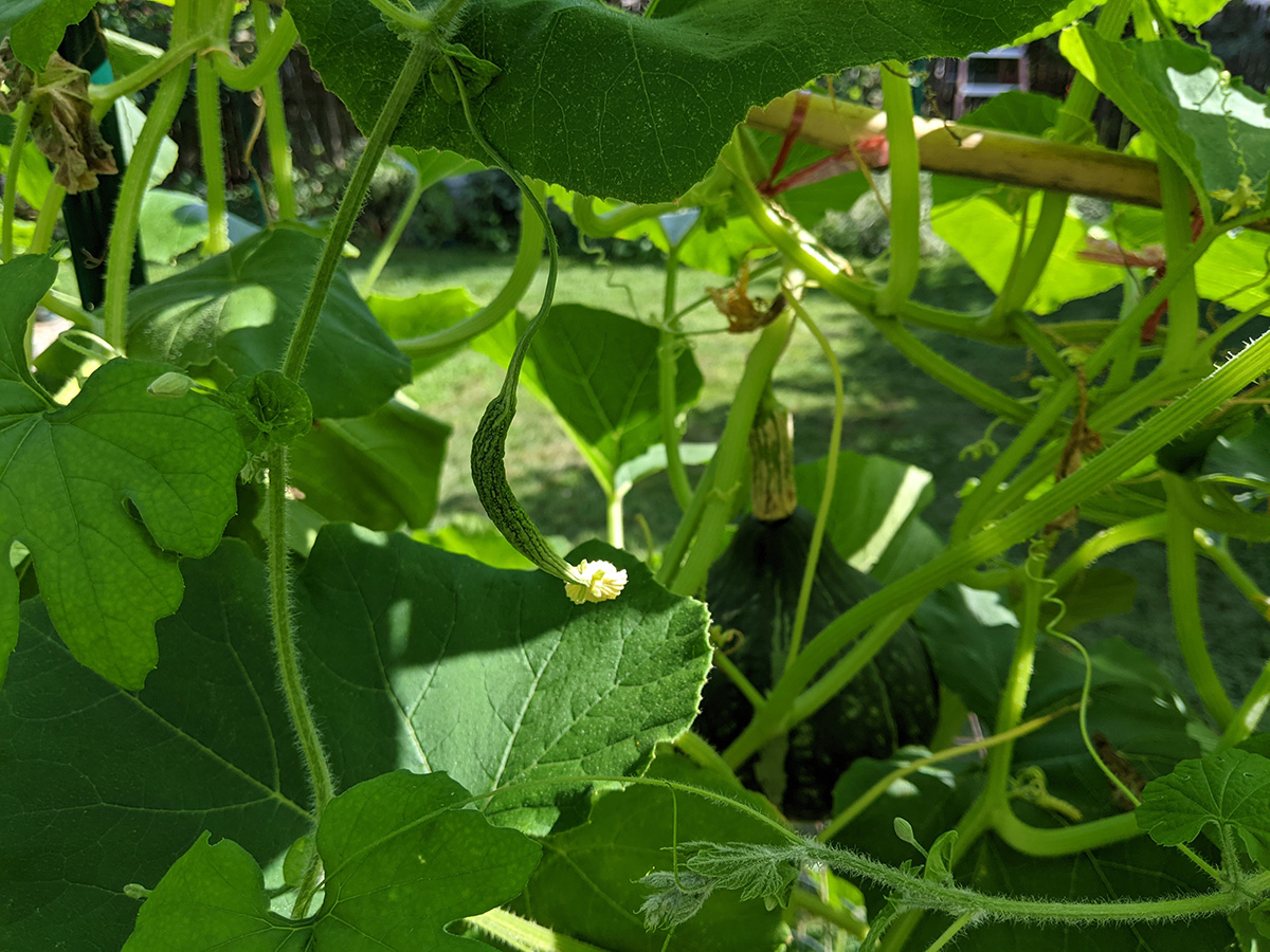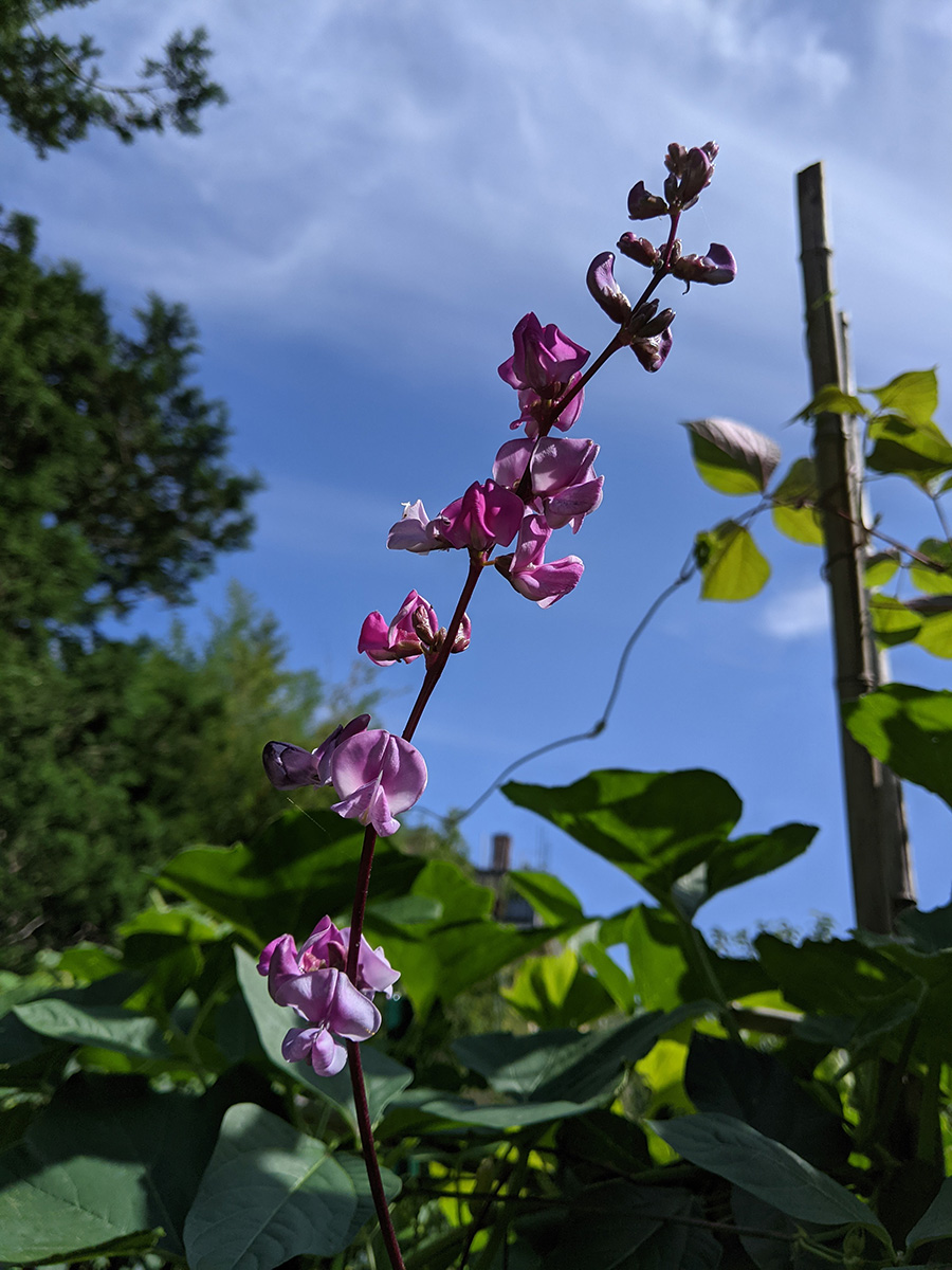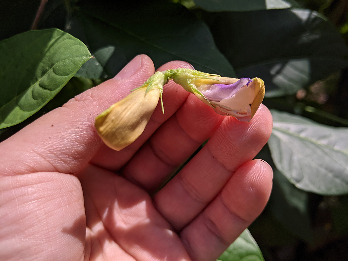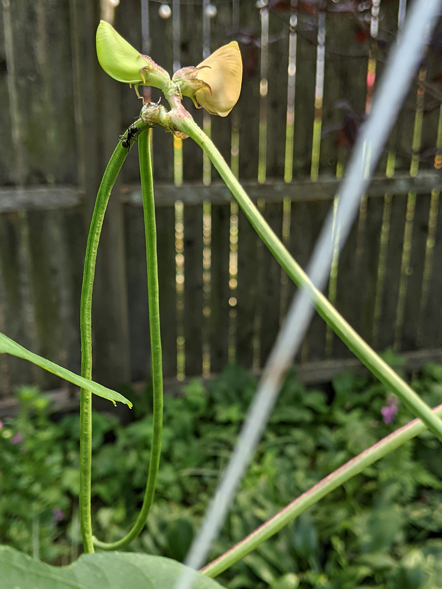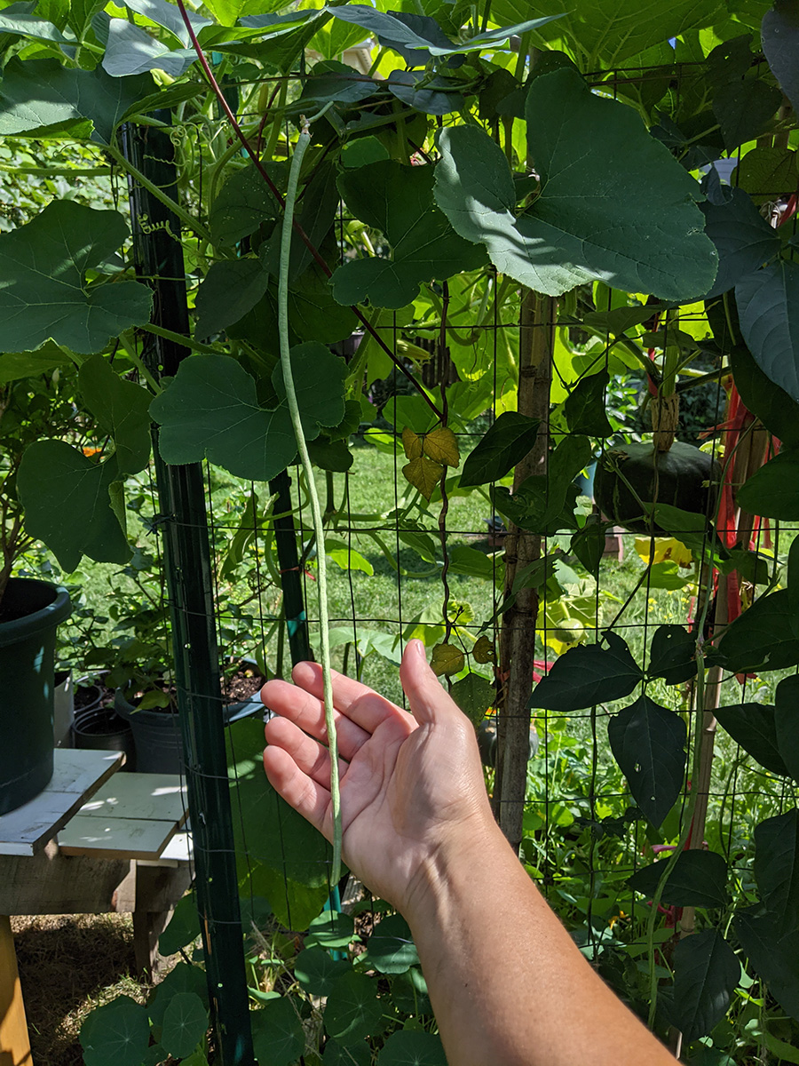 we discovered something unique to the long beans. we've known for a while that a flower stalk would always produce two flowers, followed by 2 long beans (or less, if the flower wasn't pollinated successfully). but the thing we realized is often times, the flower stalk will produce two more flower buds on top of the growing long beans, for a total of 4 beans from a single stalk. so when we harvest we have to be careful, otherwise we might accidentally snip off the emerging new flower buds.