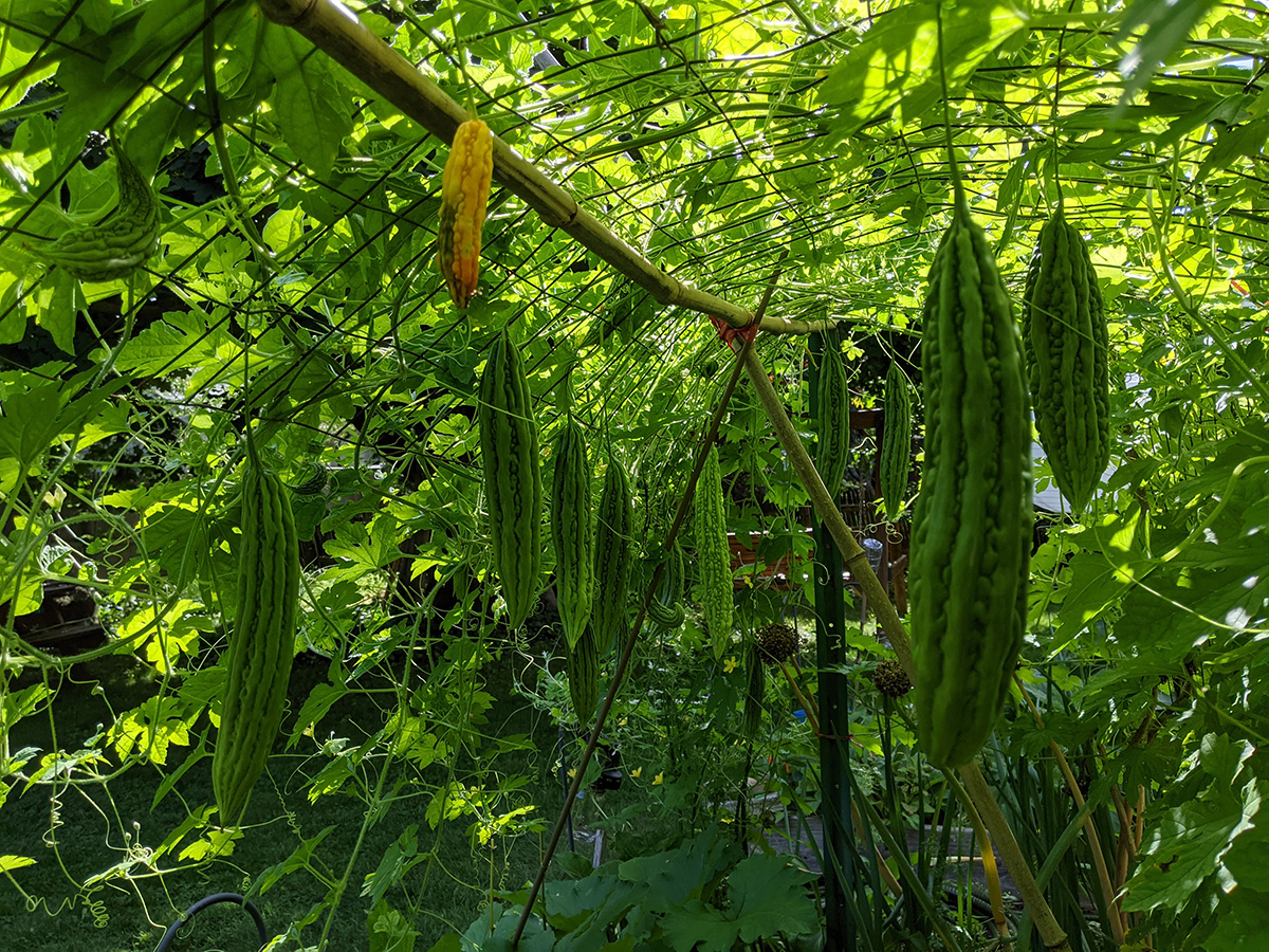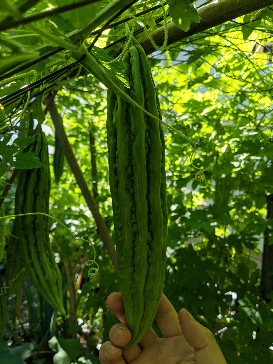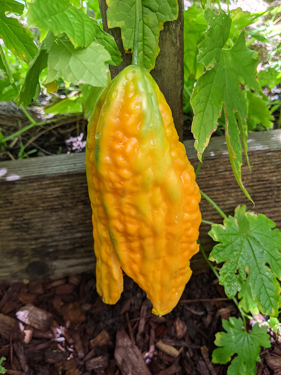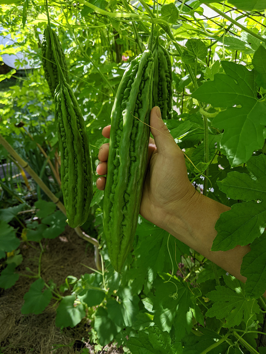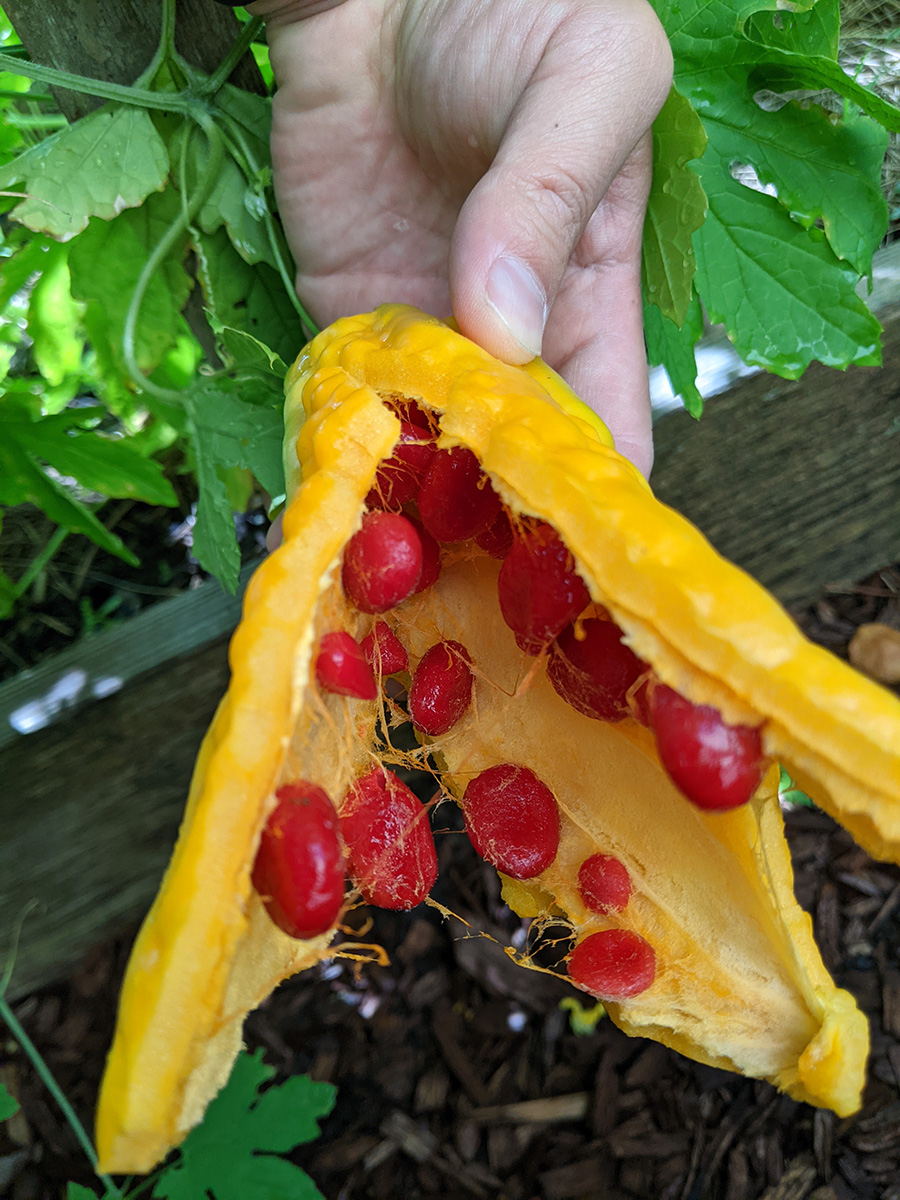 first thing i did when i got to my parents' place was to take a quick peek outside. i saw it right away: a ripe bitter melon, its orange skin split open with bright red seeds inside. despite it being so ostentatious, it went unnoticed by my parents because it was growing low to the ground behind the raised bed. we picked it off the vine to harvest the seeds.