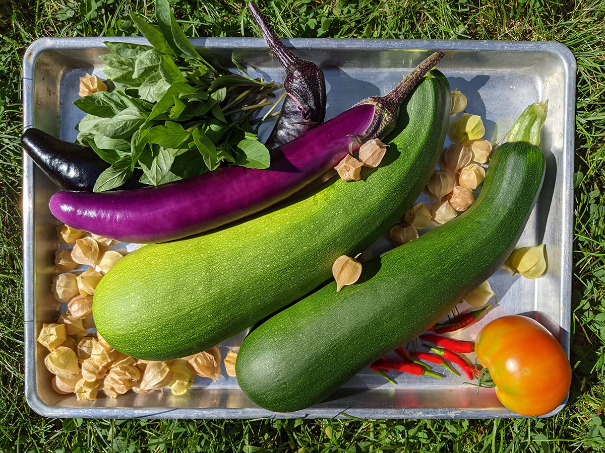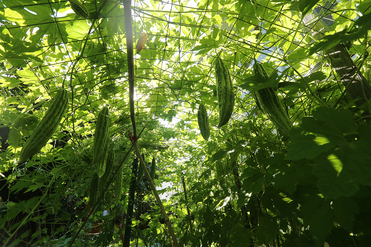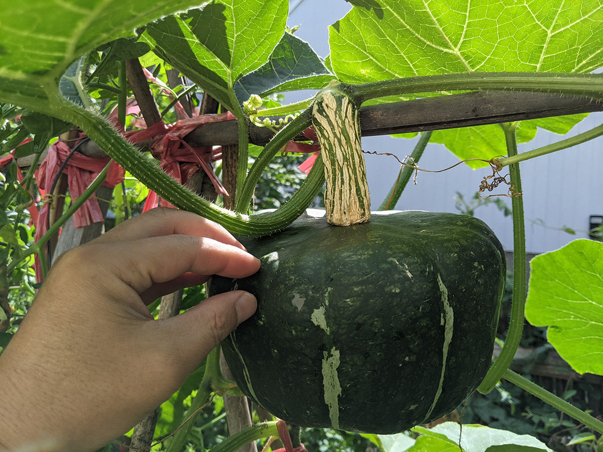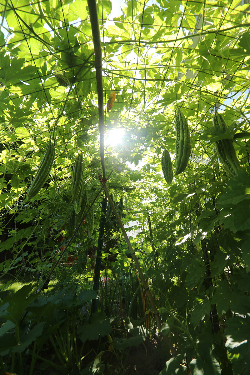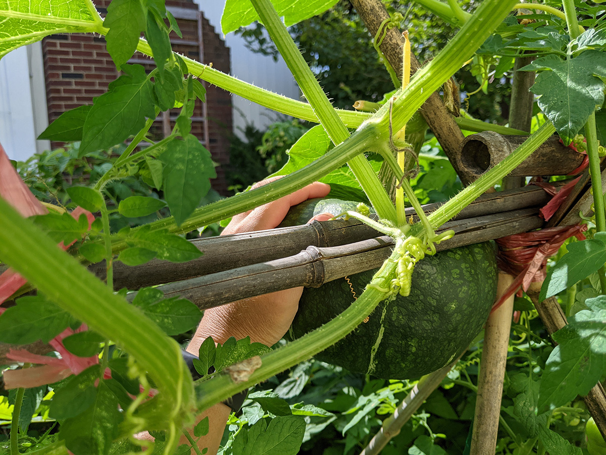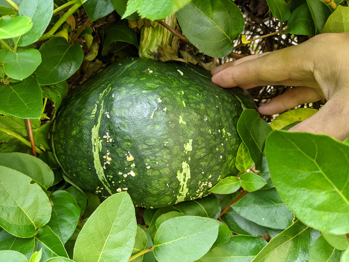 first thing i did when i got to my parents' place was to take a quick peek outside. i saw it right away: a ripe bitter melon, its orange skin split open with bright red seeds inside. despite it being so ostentatious, it went unnoticed by my parents because it was growing low to the ground behind the raised bed. we picked it off the vine to harvest the seeds.
