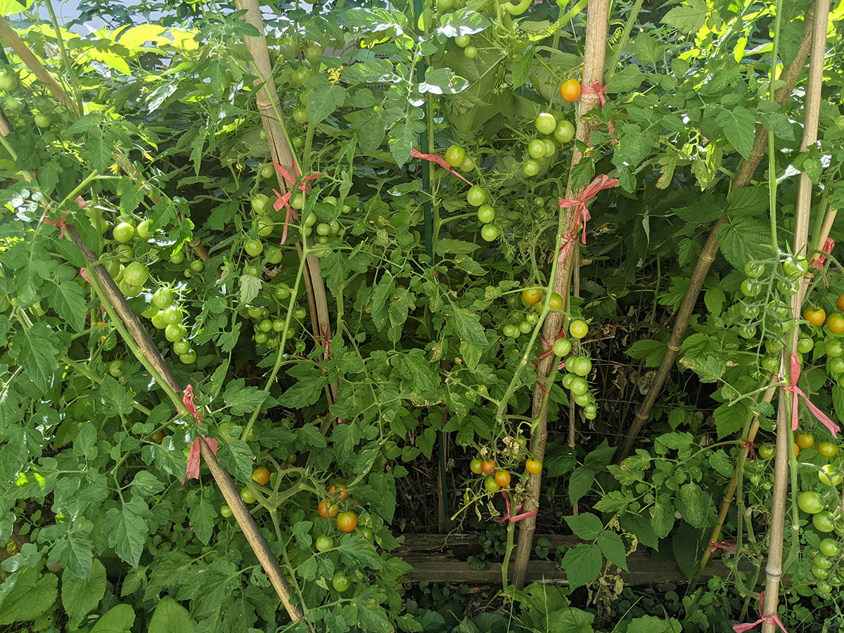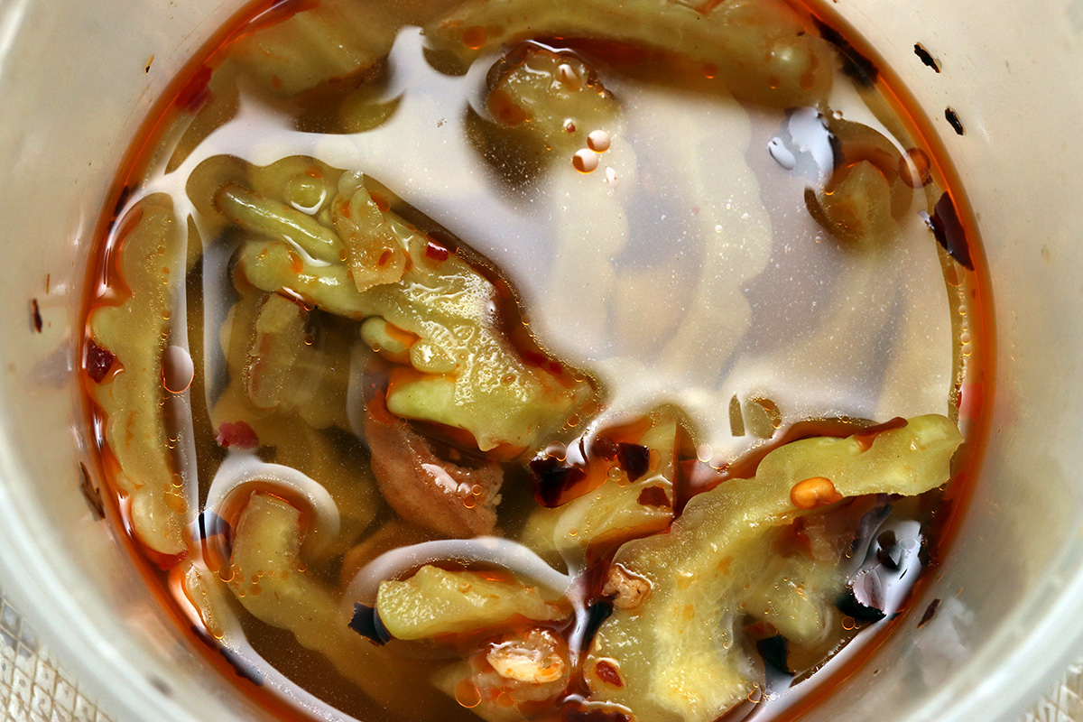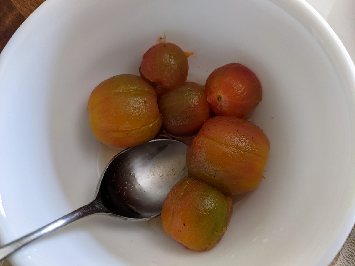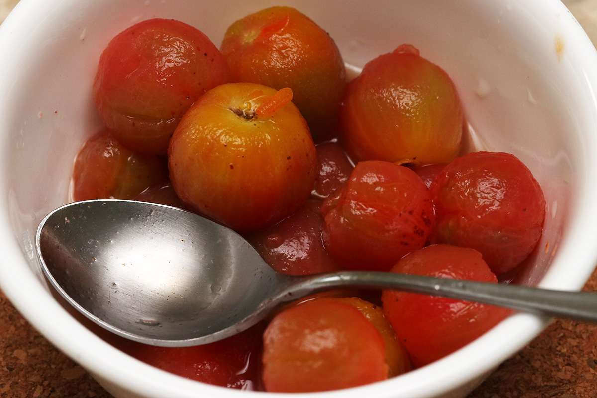my mother made noodles for lunch with i made more flavorful by adding a spoonful of chili oil sauce. my parents also introduced a new creation they made: sour plum marinated peel cherry tomatoes. soaked in sour plum powder, vinegar, and honey, it tasted nothing like tomatoes, more like delicious tiny plums. i mixed a container of ice tea before heading back into the backyard.