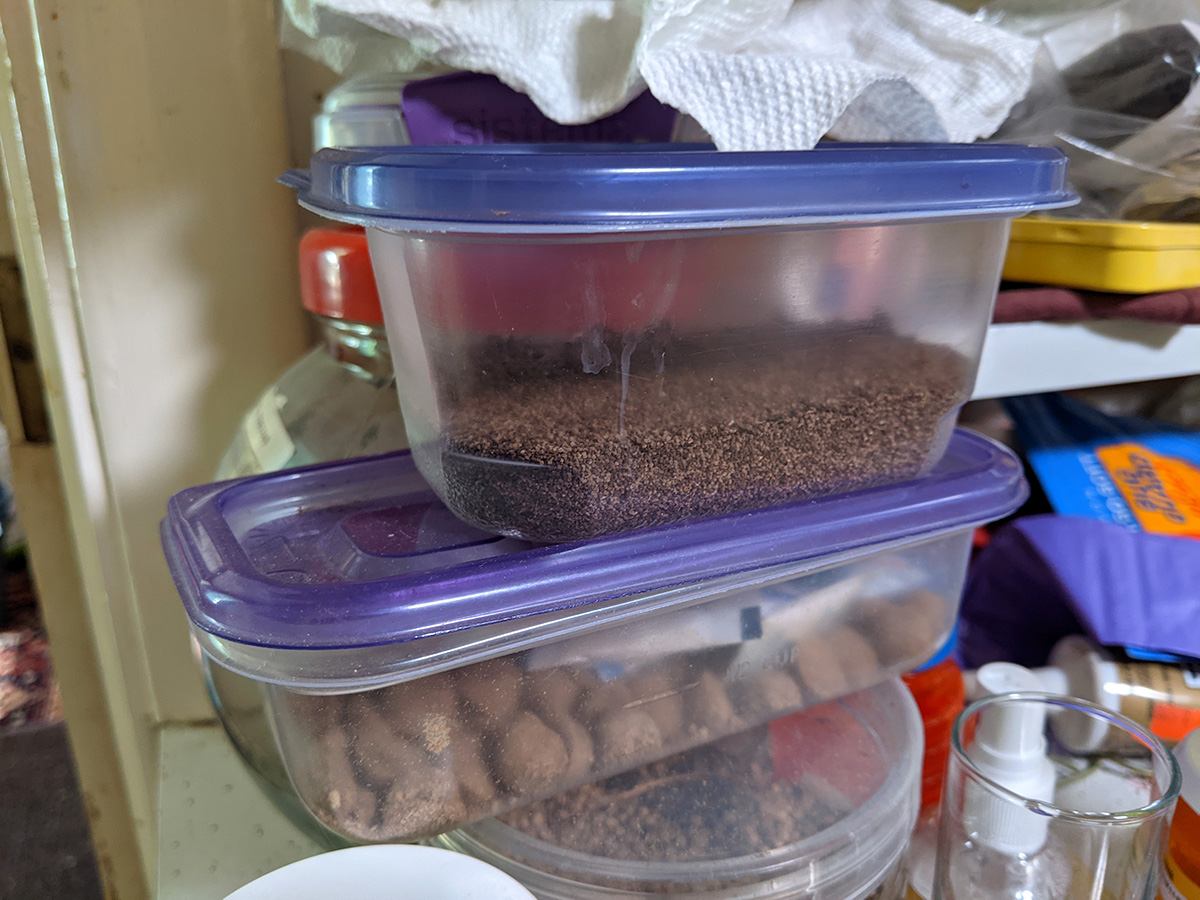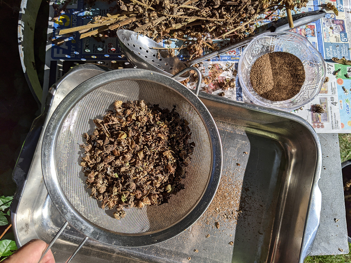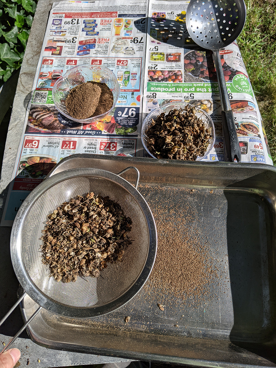 finally the last gardening thing i did today was to sift the dried foxglove flower stalks with a mesh strainer to collect all the tiny seeds. at first i was just shaking them into a tray, but then thought i could use a fine mesh strainer. luckily the holes of the strainer was just the right size for the seeds to pass through, but the debris left behind. in hindsight, maybe an easier way would be to simply shake the flower stalks in a paper bag to release the seeds. even using my strainer method, there was probably still seeds left on the dried seed pods.