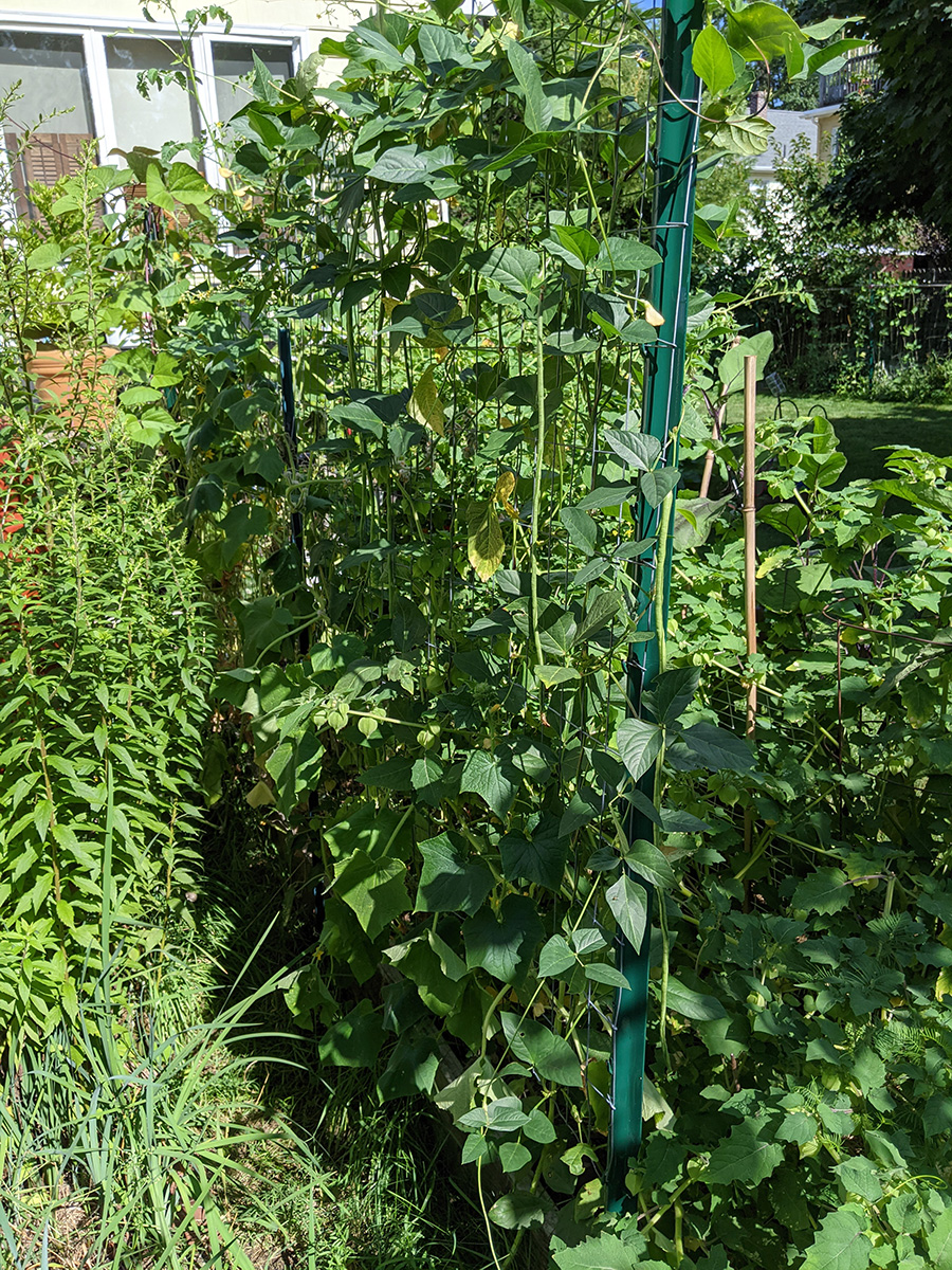 most of the cucumbers have succumbed to bacterial wilt, i don't think we'll get anymore cucumbers this season. i would try spraying some kaolin clay but it's a little too late for that now. i'm pretty sure we're not going to grow any cucumbers for next year. my father said we could grow long beans instead, a better use of the trellis space.