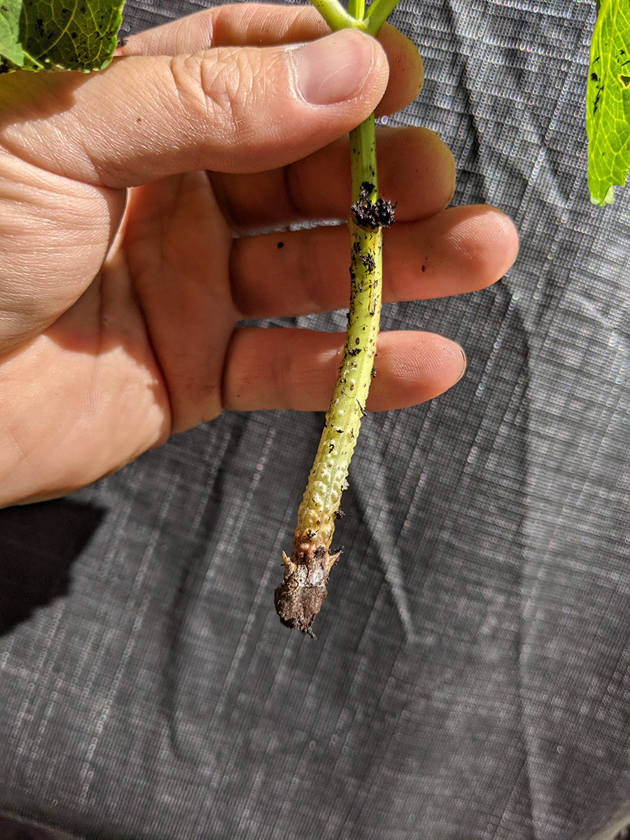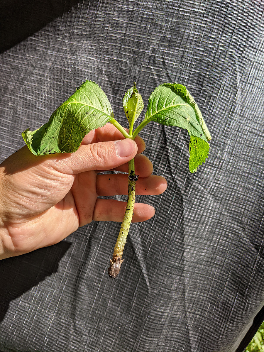 i decided to repot the last surviving hydrangea cutting as the soil was too heavily infested with fungus gnats and not very good soil to begin with. i used potting soil this time instead of garden soil, which had a finer consistency. the bottom of the cutting had some rot, but what also what looked like tiny roots. there were also nodules on the stem part that had rooting hormone, those also looked promising.