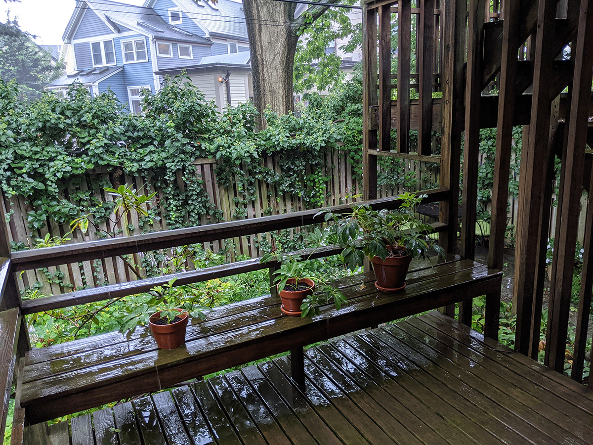 we had downpours this morning into the early afternoon, remnants of tropical storm fred passing through our area. i'd already moved in my thanksgiving cactuses so they wouldn't get soaked, but this morning i also moved my umbrella plants to a drier spot on my backyard deck.